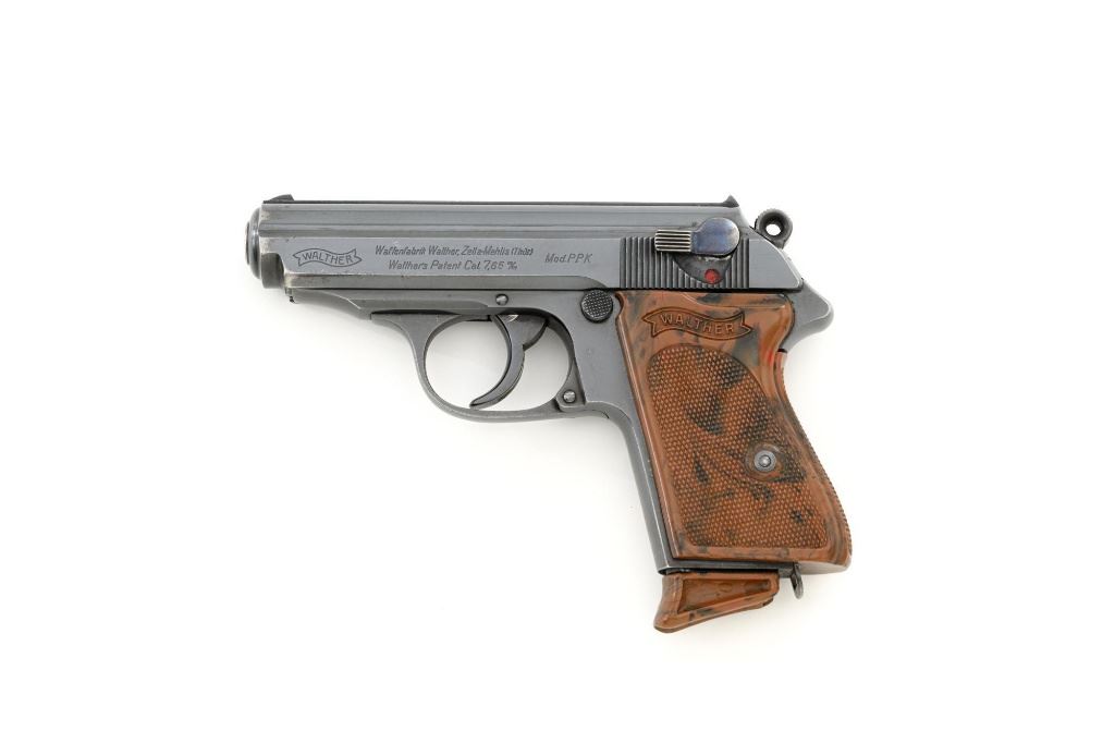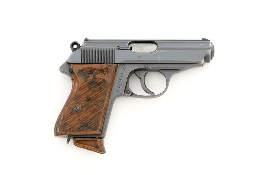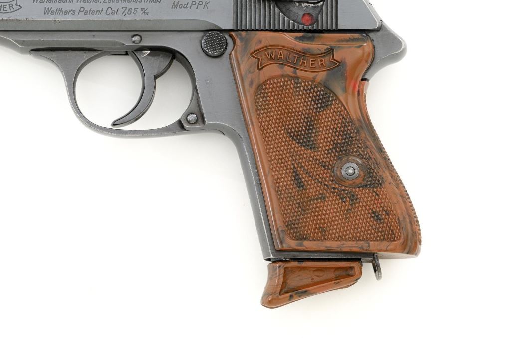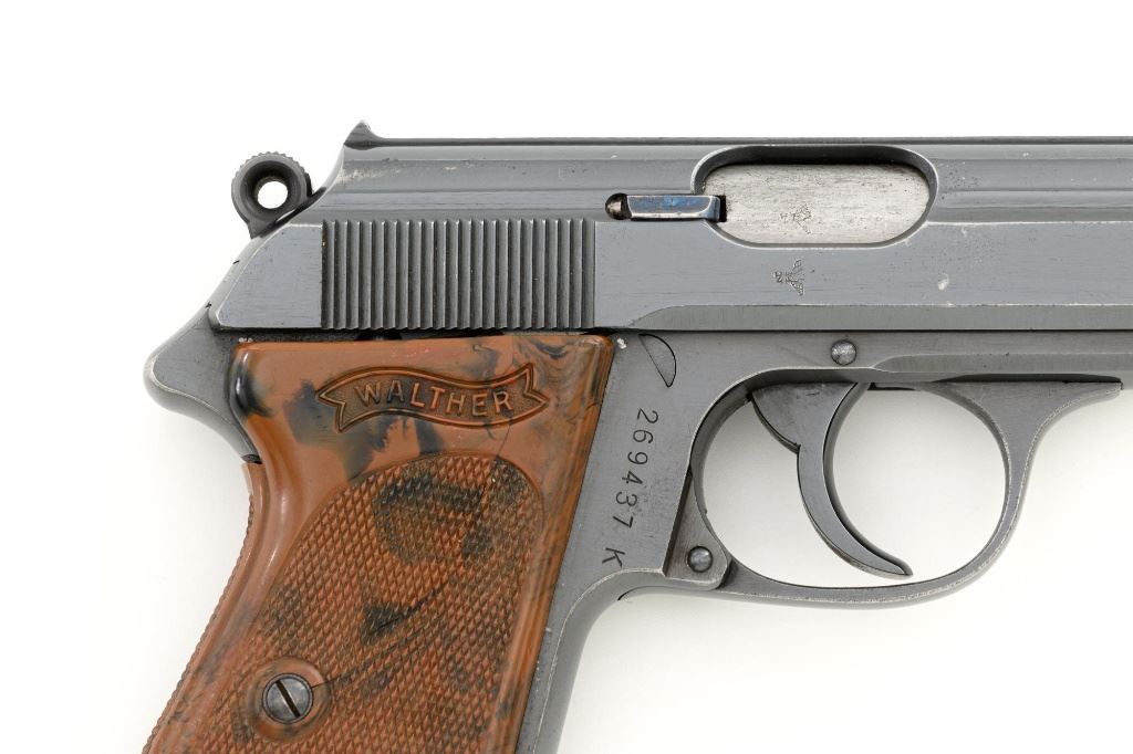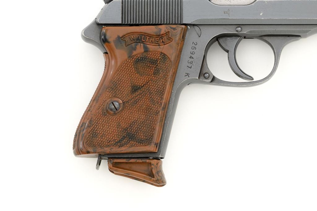 German Walther PPK Semi-Automatic Pistol #269437K, .32 ACP cal., 3.3" barrel, blued finish, checkered brown mottled plastic grips embossed with "WALTHER" logo on each side, blade front sight, and fixed rear sight with "U"-notched groove. A fixed lanyard loop is mounted to the rear of the frame. Includes one blued magazine, with "Walther" logo on the left side, and has a mottled brown plastic finger extension. Left side of the slide is marked "WALTHER/Waffenfabrik Walther,Zella-Mehlis(Thur)/Walthers Patent Cal.7,65 m/m/Mod.PPK". There are "(eagle)N" proof stamps on right side of the slide and on the barrel at the ejection port. No import marks. Condition overall is fine, retaining approx. 92% blue, with scattered mild scratches and handling marks. Grips show typical light handling wear, and there is a very small crack near one of the escutcheons. Action operates smoothly. Bore is bright with very good rifling. Est.: $900-$1,200. (C&R/PPT)