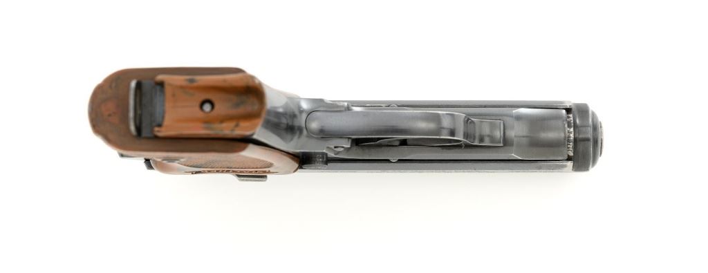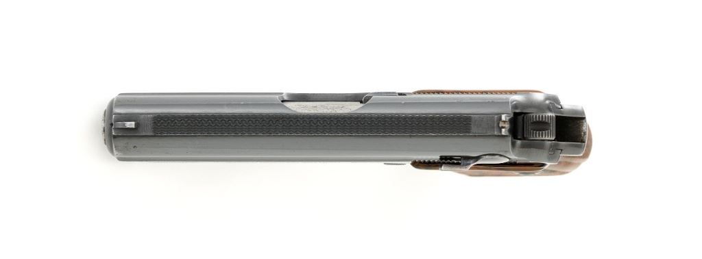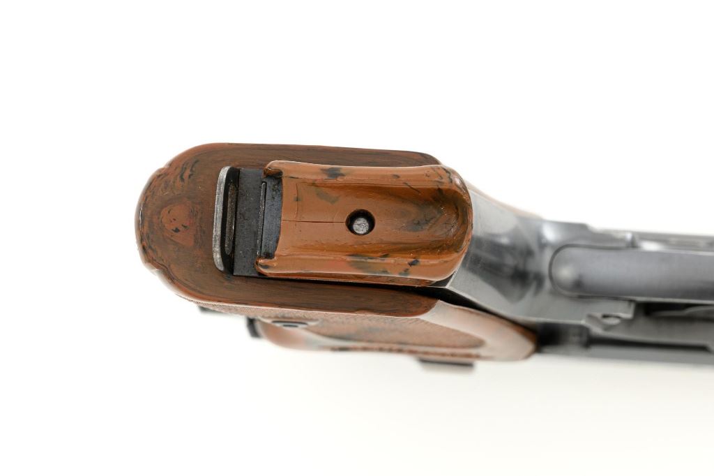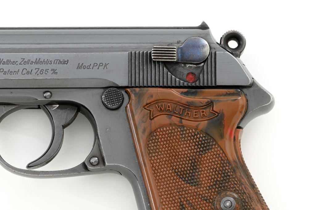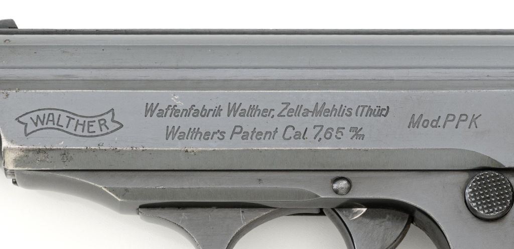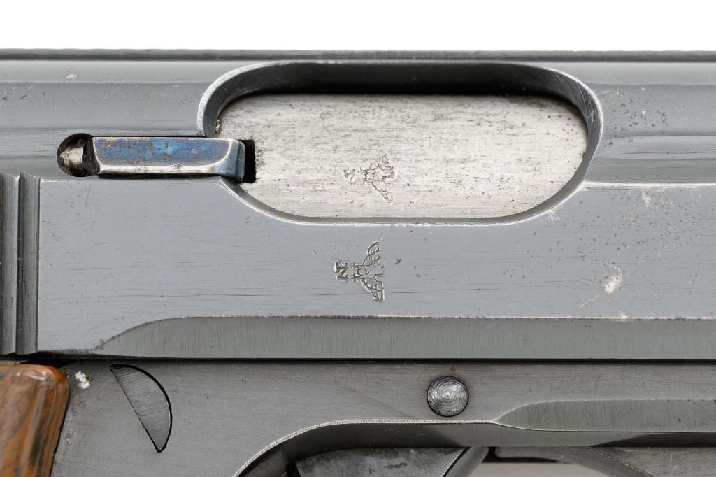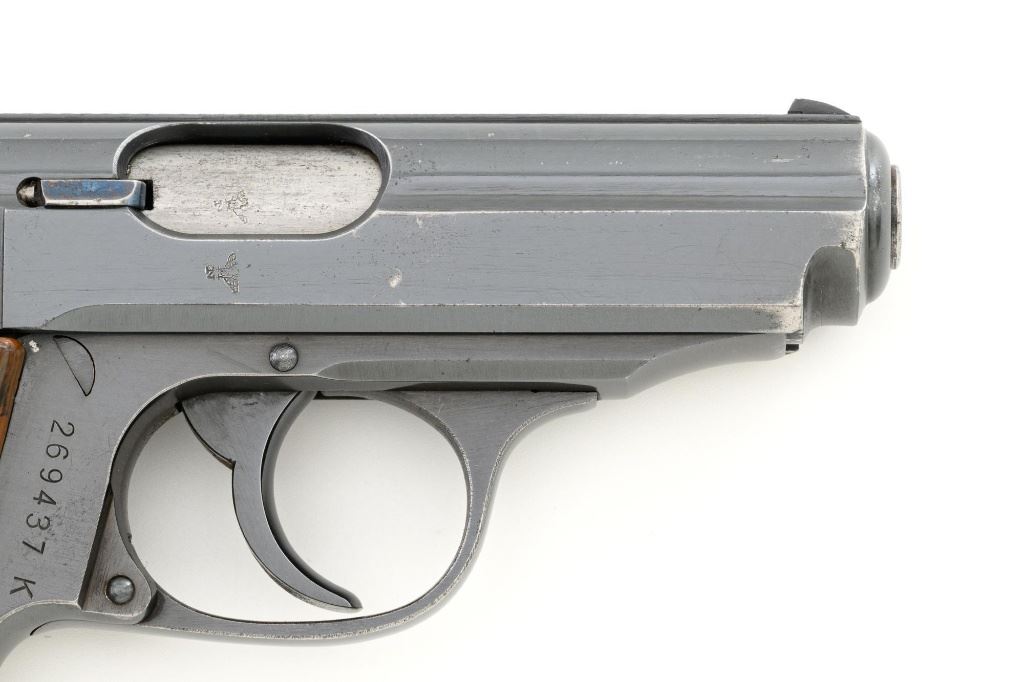 German Walther PPK Semi-Automatic Pistol #269437K, .32 ACP cal., 3.3" barrel, blued finish, checkered brown mottled plastic grips embossed with "WALTHER" logo on each side, blade front sight, and fixed rear sight with "U"-notched groove. A fixed lanyard loop is mounted to the rear of the frame. Includes one blued magazine, with "Walther" logo on the left side, and has a mottled brown plastic finger extension. Left side of the slide is marked "WALTHER/Waffenfabrik Walther,Zella-Mehlis(Thur)/Walthers Patent Cal.7,65 m/m/Mod.PPK". There are "(eagle)N" proof stamps on right side of the slide and on the barrel at the ejection port. No import marks. Condition overall is fine, retaining approx. 92% blue, with scattered mild scratches and handling marks. Grips show typical light handling wear, and there is a very small crack near one of the escutcheons. Action operates smoothly. Bore is bright with very good rifling. Est.: $900-$1,200. (C&R/PPT)