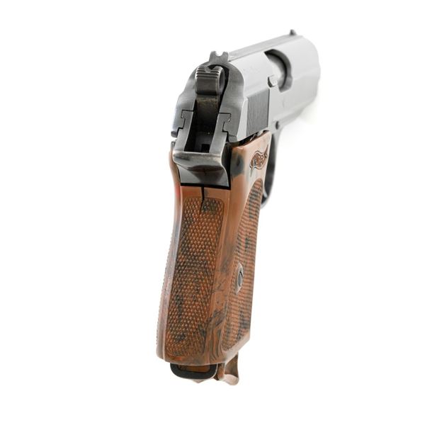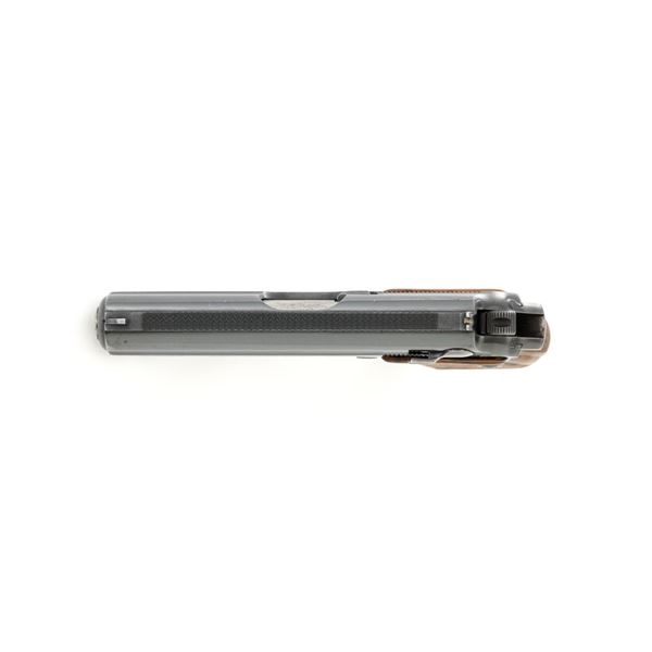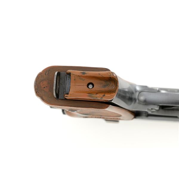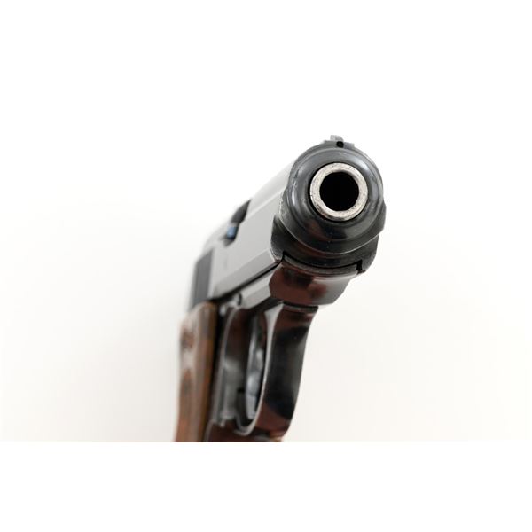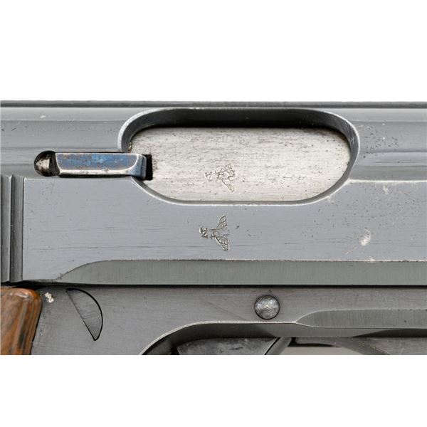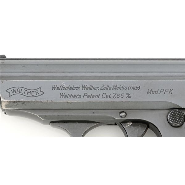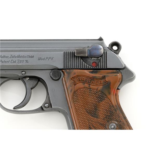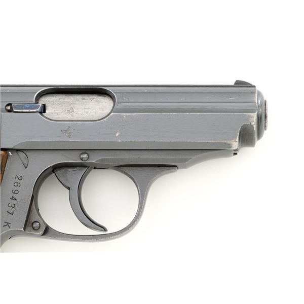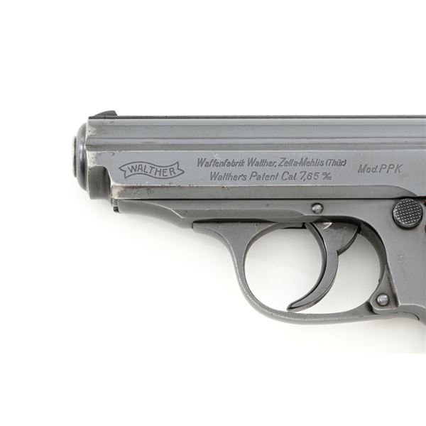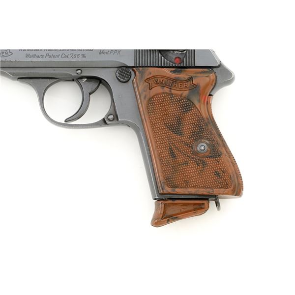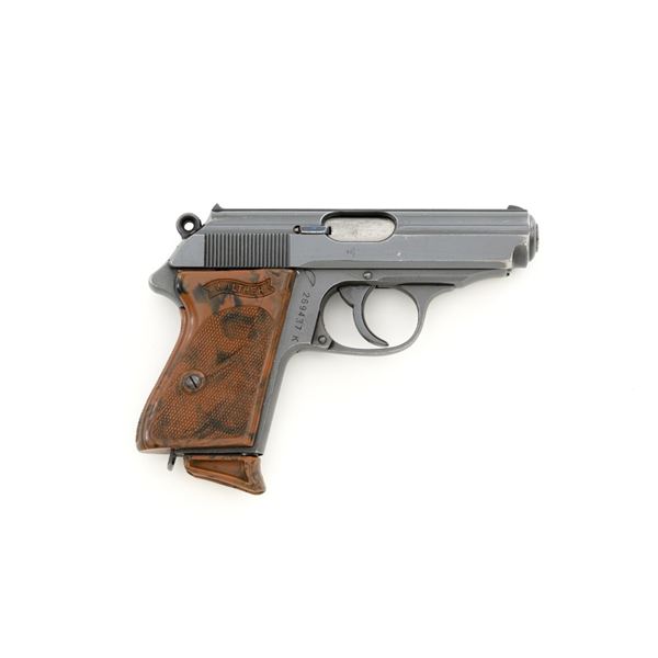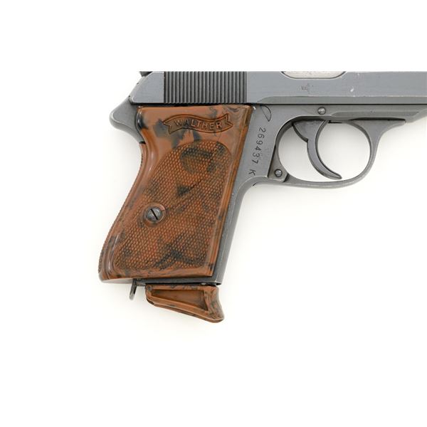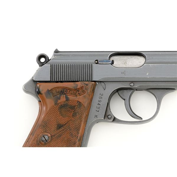 German Walther PPK Semi-Automatic Pistol #269437K, .32 ACP cal., 3.3" barrel, blued finish, checkered brown mottled plastic grips embossed with "WALTHER" logo on each side, blade front sight, and fixed rear sight with "U"-notched groove. A fixed lanyard loop is mounted to the rear of the frame. Includes one blued magazine, with "Walther" logo on the left side, and has a mottled brown plastic finger extension. Left side of the slide is marked "WALTHER/Waffenfabrik Walther,Zella-Mehlis(Thur)/Walthers Patent Cal.7,65 m/m/Mod.PPK". There are "(eagle)N" proof stamps on right side of the slide and on the barrel at the ejection port. No import marks. Condition overall is fine, retaining approx. 92% blue, with scattered mild scratches and handling marks. Grips show typical light handling wear, and there is a very small crack near one of the escutcheons. Action operates smoothly. Bore is bright with very good rifling. Est.: $900-$1,200. (C&R/PPT)