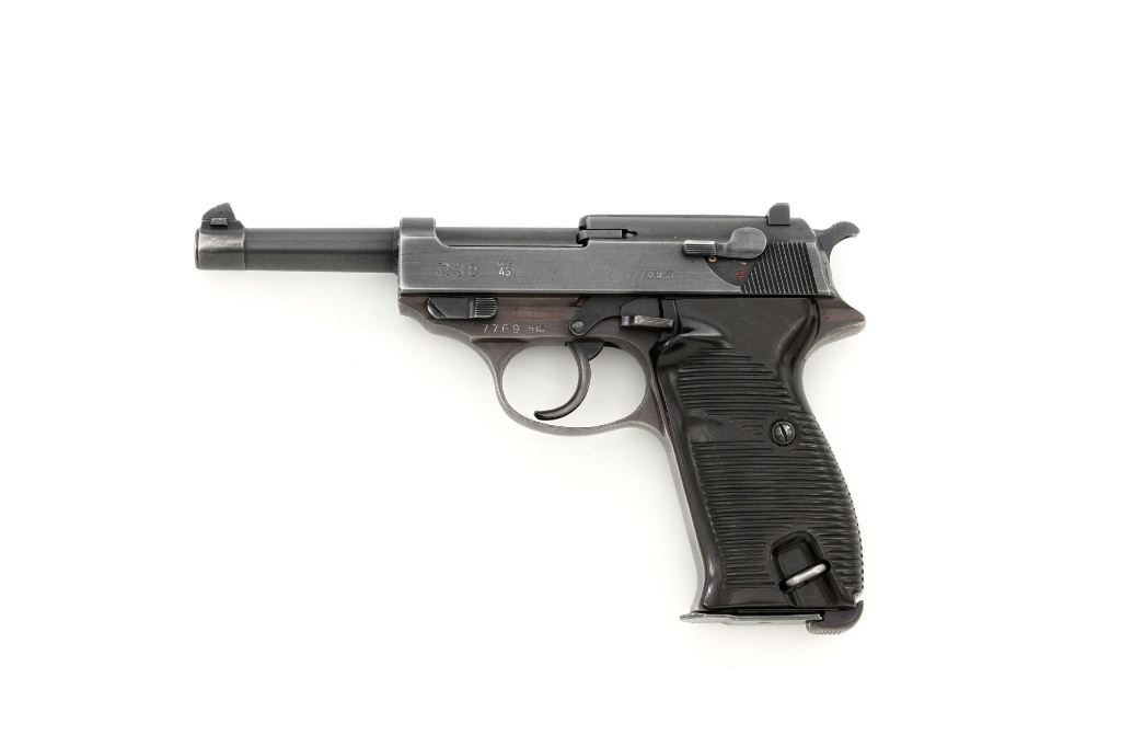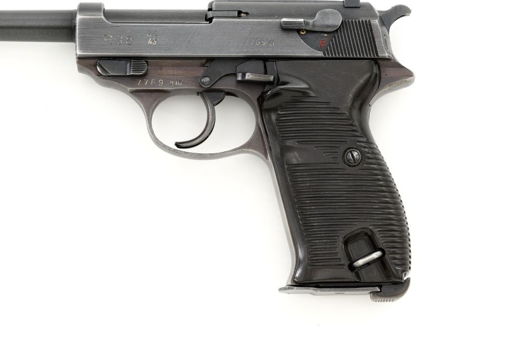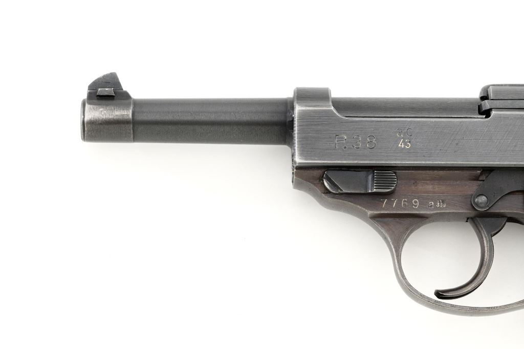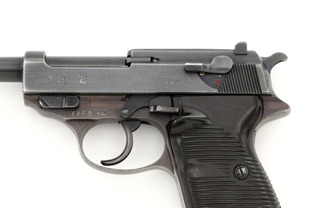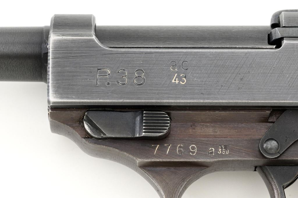 Walther ac43 P.38 Semi-Automatic Pistol, #7769a, 9mm cal., 4.9" barrel, blued finish, grooved black plastic grips, dovetailed blade front sight, and fixed rear sight with "U"-notched groove. Includes one blued steel magazine, stamped with an "(eagle)88" (Spreewerk) acceptance mark on the rear spine. Magazine condition is good showing general wear and toning. Pistol is marked "P.38/ac43/7769a" on left side of the slide. Right side is marked with two "(eagle)359" proof marks, and Nazi eagle firing proof. There are additional "(eagle)359" proofs on left side of the frame and barrel. Locking block is stamped with an "(eagle)359" and Nazi eagle firing proof. Matching numbers on the frame, slide, barrel, and locking block. No visible import marks. Condition overall is very good, retaining approx. 80% blue, with wear around the muzzle, edges of the slide, firing pin cover, and grip strap. Grips are very good with light handling marks. Action, hold open, and hammer drop safety operate smoothly. Bore is bright with very good rifling. Est.: $900-$1,200. (C&R/PPT)