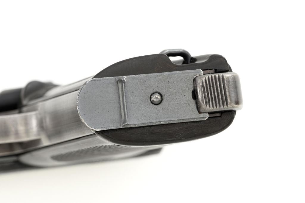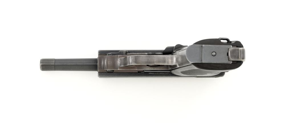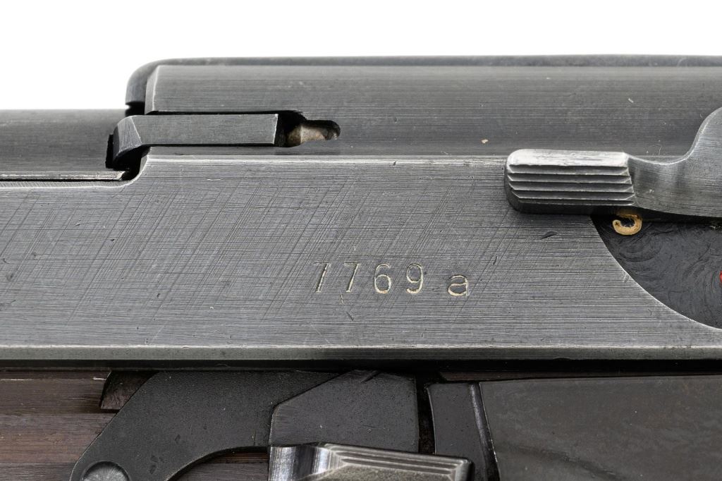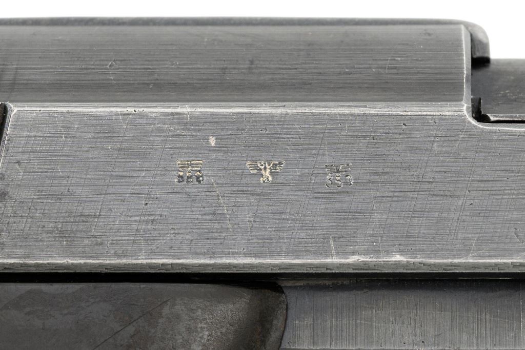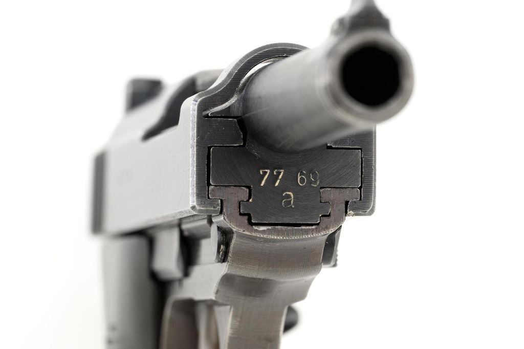 Walther ac43 P.38 Semi-Automatic Pistol, #7769a, 9mm cal., 4.9" barrel, blued finish, grooved black plastic grips, dovetailed blade front sight, and fixed rear sight with "U"-notched groove. Includes one blued steel magazine, stamped with an "(eagle)88" (Spreewerk) acceptance mark on the rear spine. Magazine condition is good showing general wear and toning. Pistol is marked "P.38/ac43/7769a" on left side of the slide. Right side is marked with two "(eagle)359" proof marks, and Nazi eagle firing proof. There are additional "(eagle)359" proofs on left side of the frame and barrel. Locking block is stamped with an "(eagle)359" and Nazi eagle firing proof. Matching numbers on the frame, slide, barrel, and locking block. No visible import marks. Condition overall is very good, retaining approx. 80% blue, with wear around the muzzle, edges of the slide, firing pin cover, and grip strap. Grips are very good with light handling marks. Action, hold open, and hammer drop safety operate smoothly. Bore is bright with very good rifling. Est.: $900-$1,200. (C&R/PPT)