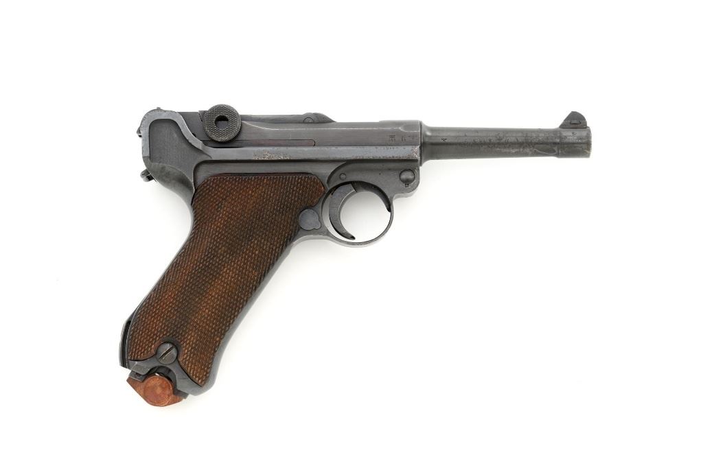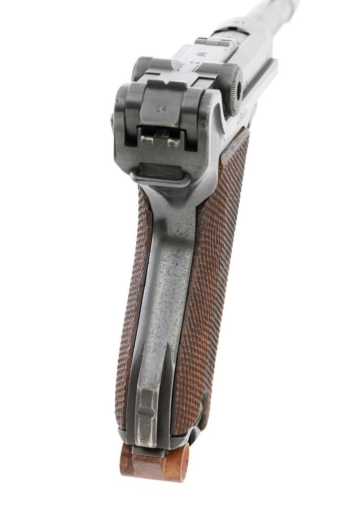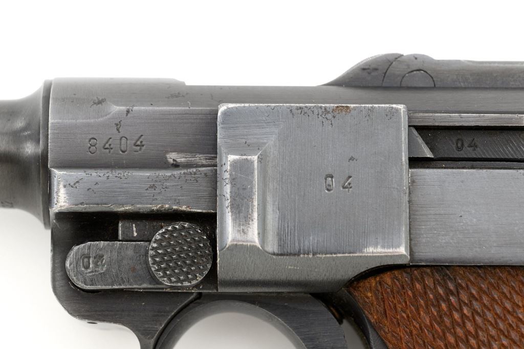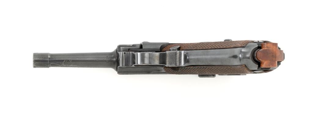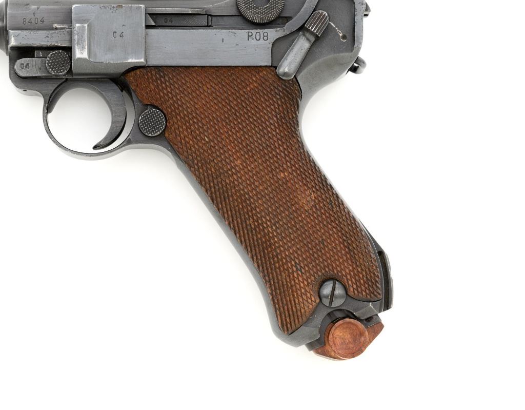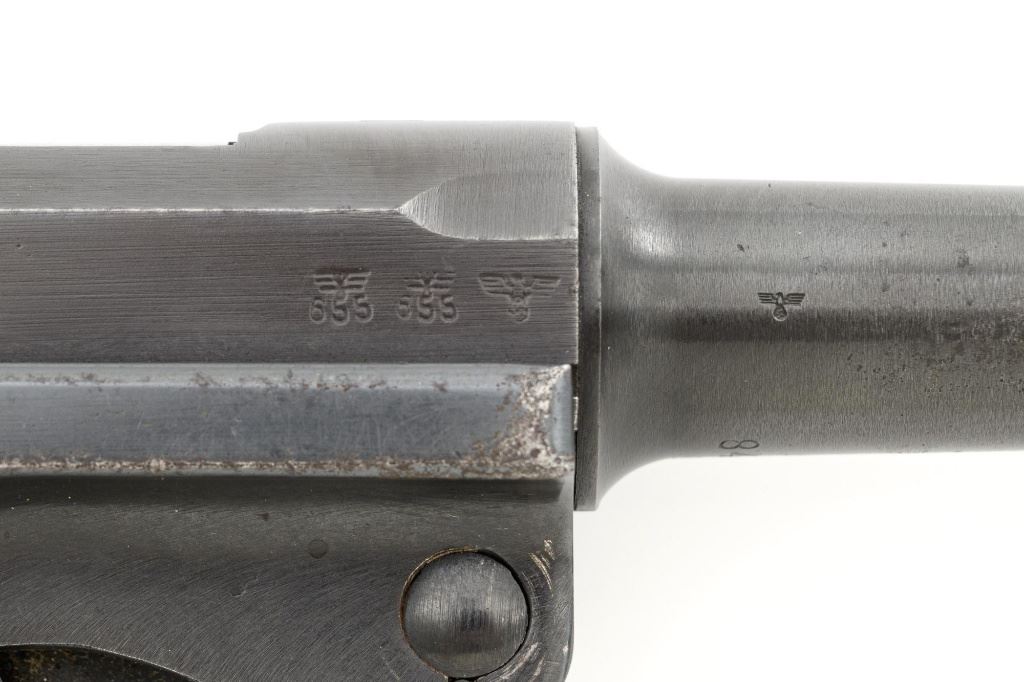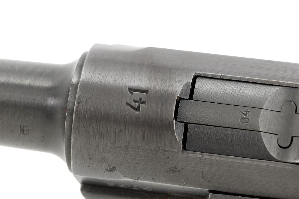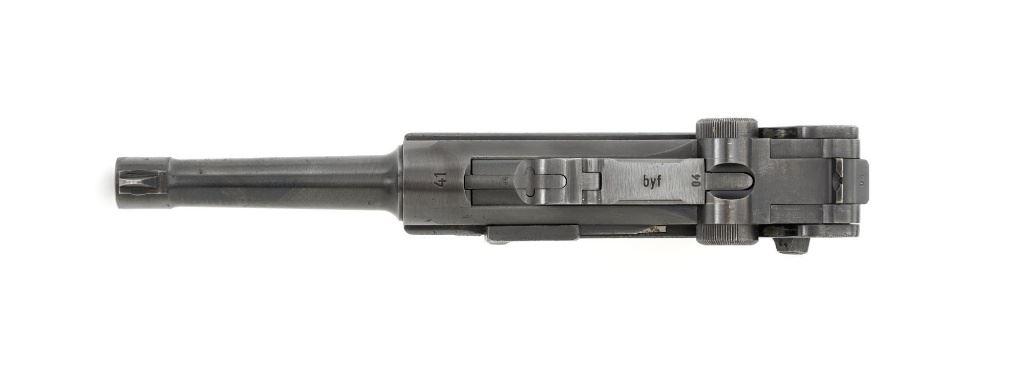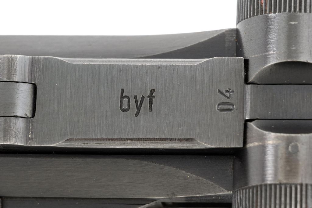 Mauser byf 41 Luger Semi-Automatic Pistol, #8404r, 9mm cal., 4" barrel, blued finish including small parts, checkered walnut grips, inverted-"V" front sight, fixed rear sight with small "V"-notched groove, and stock lug. Includes one unmarked blued steel magazine with wood base. Toggle is marked "byf" and "41" on top of chamber. Right side of receiver with Nazi eagle firing proof, and two "(eagle)655" acceptance marks. There is a small firing proof on right side and "(eagle)655" proof on the top left side of the barrel. Left side of frame is marked "P.08". All visible numbers matching (takedown lever has been restamped). Back of each grip with matching "04" serial number, magazine is unmarked. No import marks. Pistol is in very good condition, retaining approx. 85%-87% blue. Much of the finish loss occurs on right side of the barrel, left side of the muzzle, and spot on right side of the frame rail. These areas have light pitting/corrosion. Front and backstrap are strong, showing light frosting, and a little normal wear to the stock lug. Factory lettering and proof marks are clear. Grips are fine and show moderate age and handling wear. Action and hold open function properly. Bore is bright throughout with well-defined rifling. Replacement magazine has been partially refinished and is in very good condition, showing plum colored toning. Est.: $1,800-$2,400. (C&R/PPT)