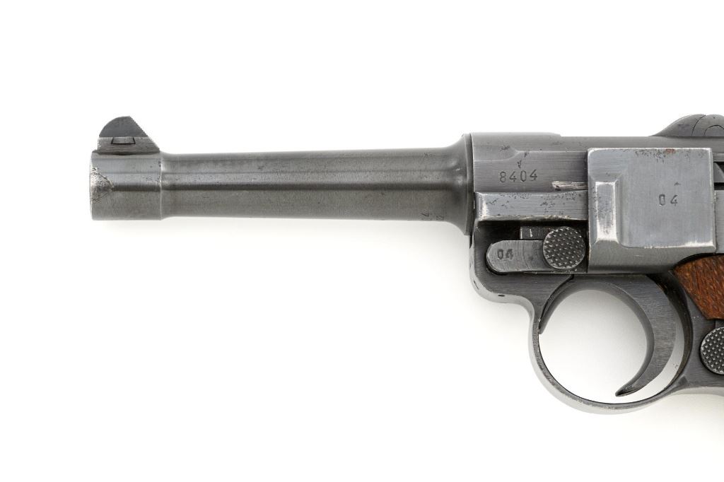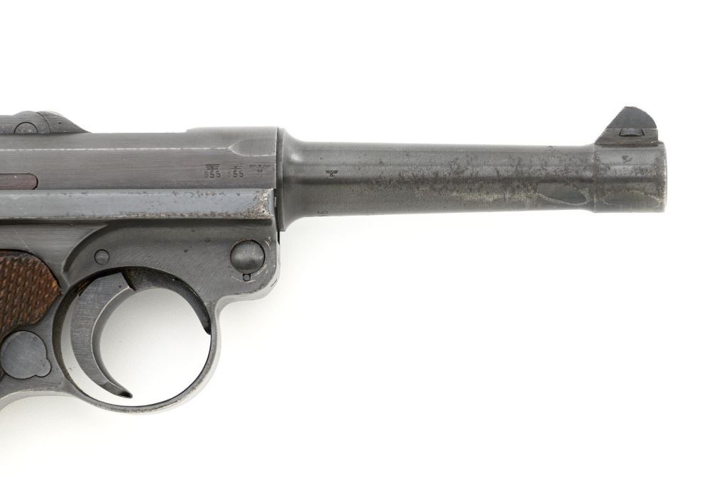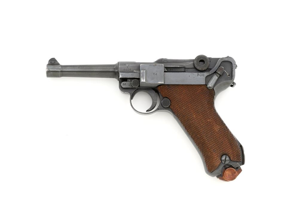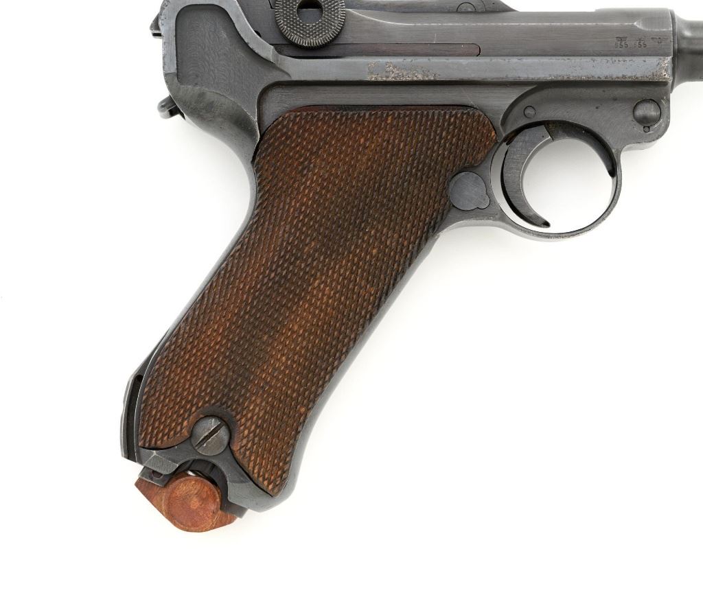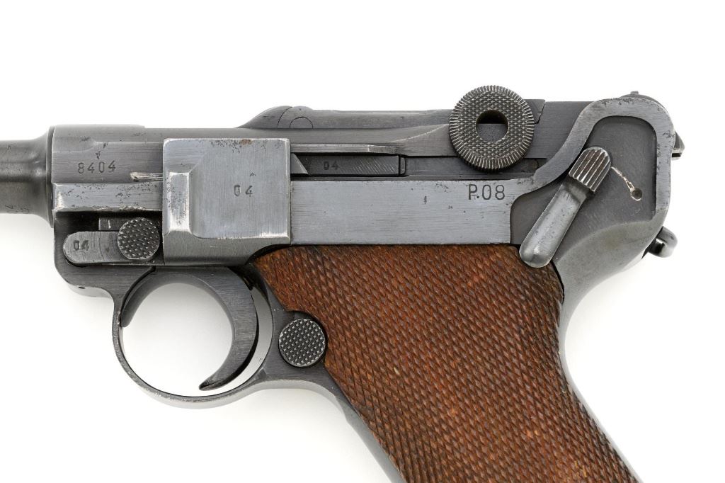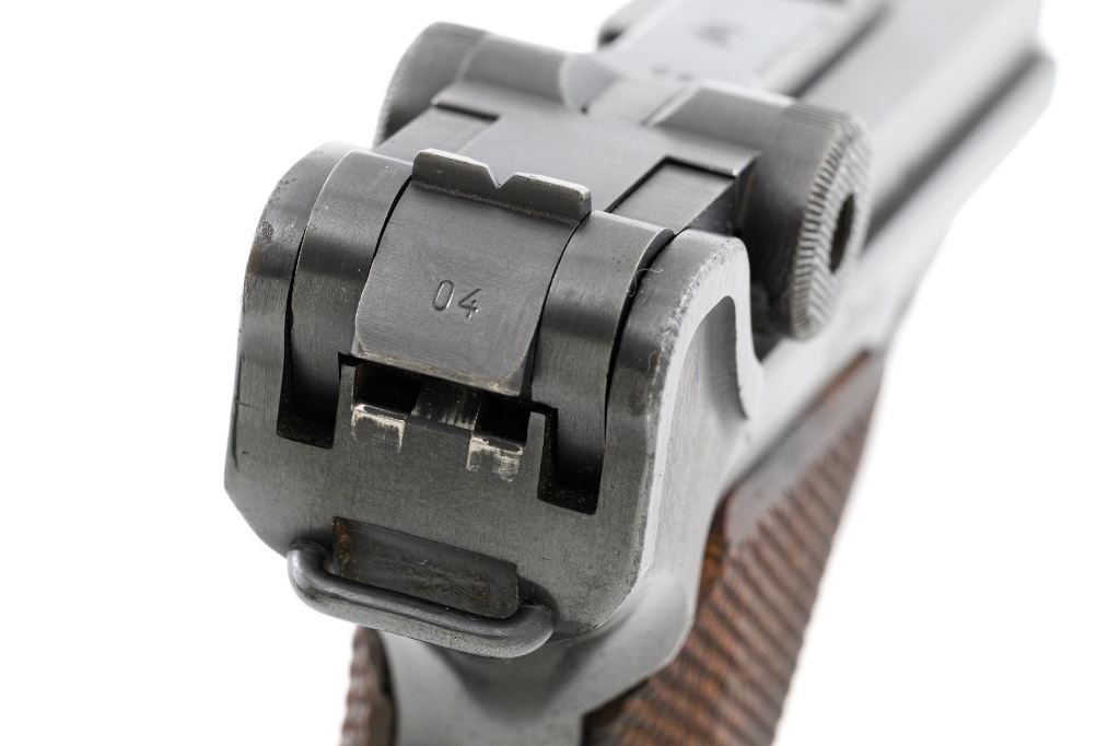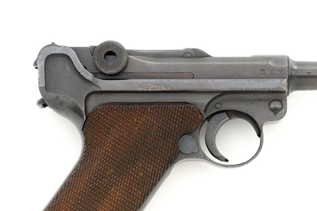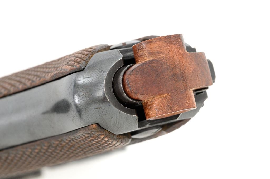 Mauser byf 41 Luger Semi-Automatic Pistol, #8404r, 9mm cal., 4" barrel, blued finish including small parts, checkered walnut grips, inverted-"V" front sight, fixed rear sight with small "V"-notched groove, and stock lug. Includes one unmarked blued steel magazine with wood base. Toggle is marked "byf" and "41" on top of chamber. Right side of receiver with Nazi eagle firing proof, and two "(eagle)655" acceptance marks. There is a small firing proof on right side and "(eagle)655" proof on the top left side of the barrel. Left side of frame is marked "P.08". All visible numbers matching (takedown lever has been restamped). Back of each grip with matching "04" serial number, magazine is unmarked. No import marks. Pistol is in very good condition, retaining approx. 85%-87% blue. Much of the finish loss occurs on right side of the barrel, left side of the muzzle, and spot on right side of the frame rail. These areas have light pitting/corrosion. Front and backstrap are strong, showing light frosting, and a little normal wear to the stock lug. Factory lettering and proof marks are clear. Grips are fine and show moderate age and handling wear. Action and hold open function properly. Bore is bright throughout with well-defined rifling. Replacement magazine has been partially refinished and is in very good condition, showing plum colored toning. Est.: $1,800-$2,400. (C&R/PPT)
