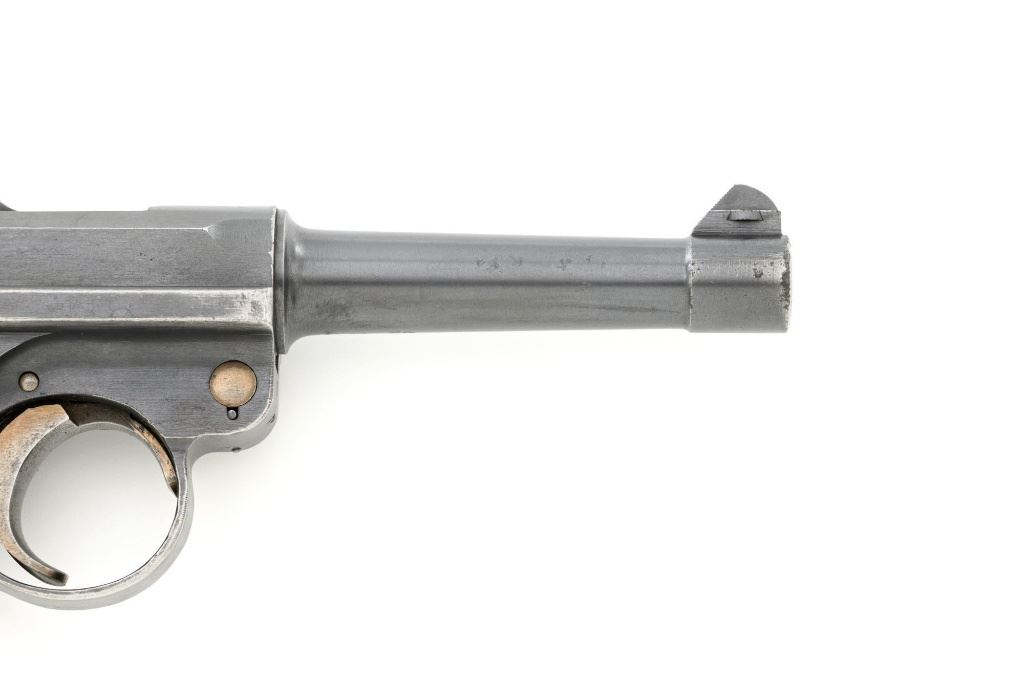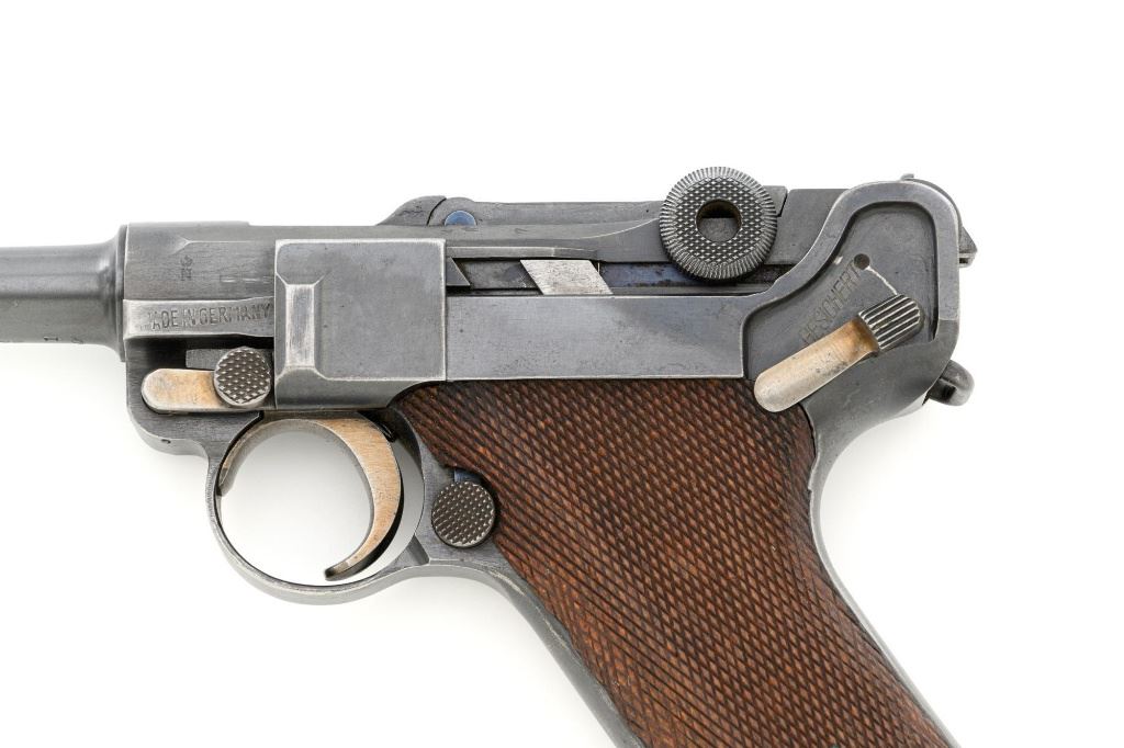 DWM 1920 Commercial Luger Semi-Automatic Pistol, #1o, .30 Luger cal., 3.75" barrel, blued finish, straw colored small parts, checkered walnut grips, inverted-"V" front sight, and fixed rear sight with "V"-notched groove. Includes one mismatched magazine with wood base, numbered "1035". Pistol is marked "DWM" on the toggle. Left side of receiver marked "(crown)N" and "MADE IN GERMANY". Upper safety position is marked "GESICHERT", lower position is blank. Visible matching numbers, grips are not numbered. No import marks. Pistol is in fine overall condition, retaining approx. 85% original blue with wear primarily at high points, front and backstrap. Front and backstrap also display some mild frosting. Straw colors are approx. 80%-85%, showing light thinning and toning. Grips are very good, with areas of moderate flattening of the checkering, primarily around the edges. Action operates smoothly, hold open functions properly. Bore is bright with very good, clearly defined rifling. Magazine body shows yellow toning and mostly mild verdigris, heavier on the left side. An interesting pistol, being the first made in the "o" letter block. Est.: $1,500-$1,800. (C&R/PPT)