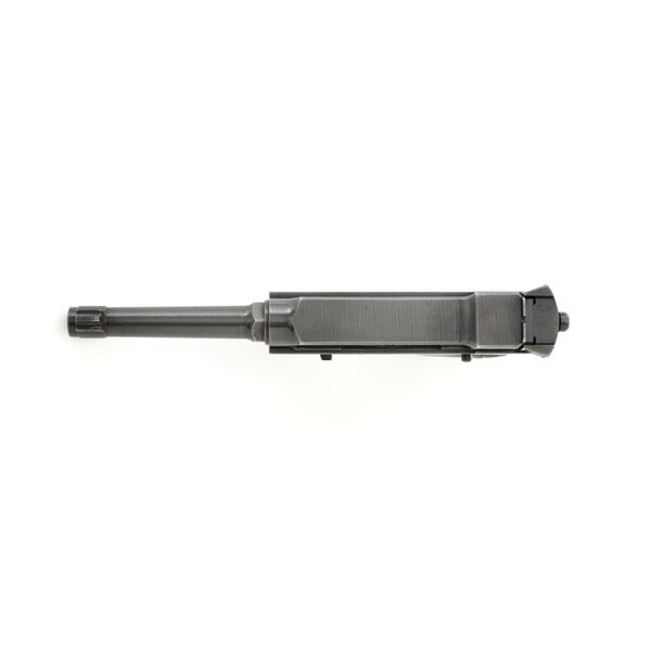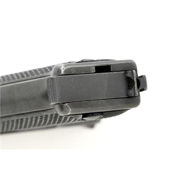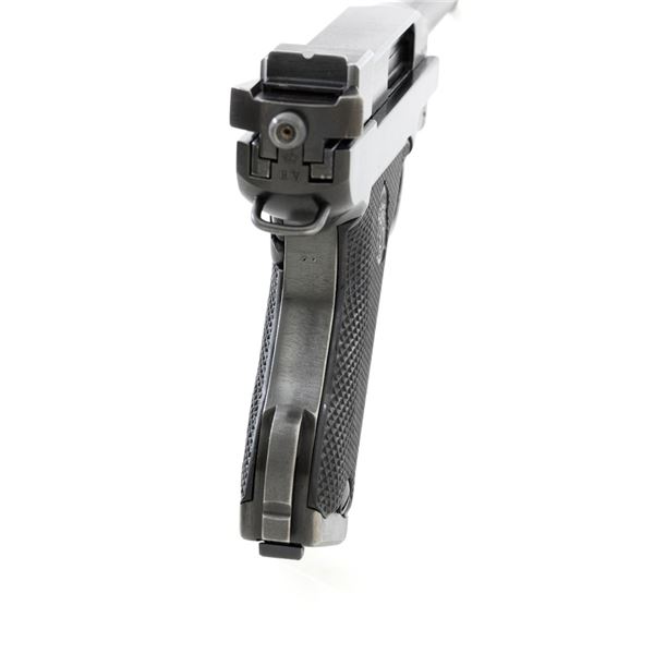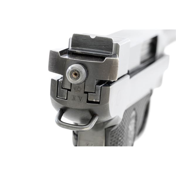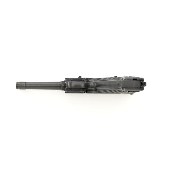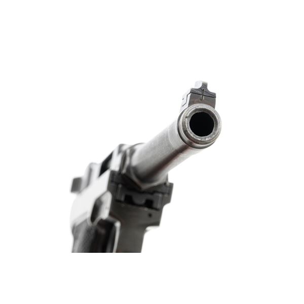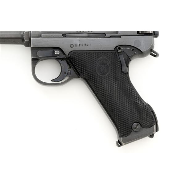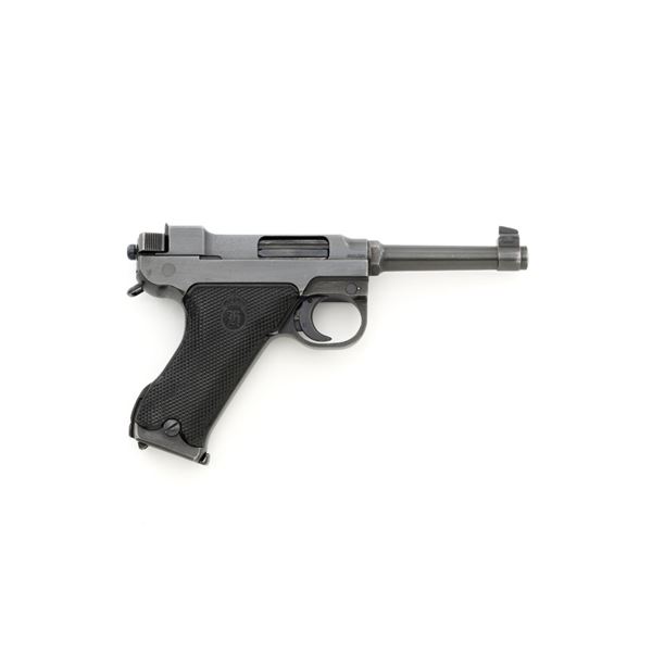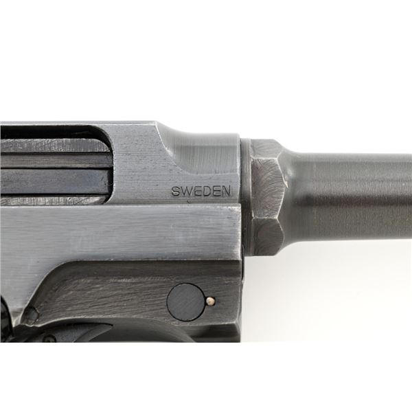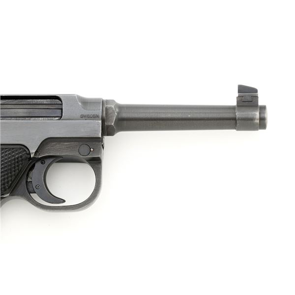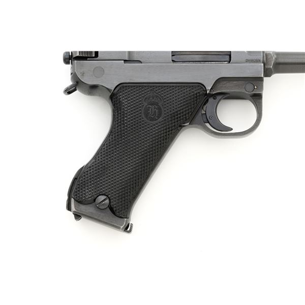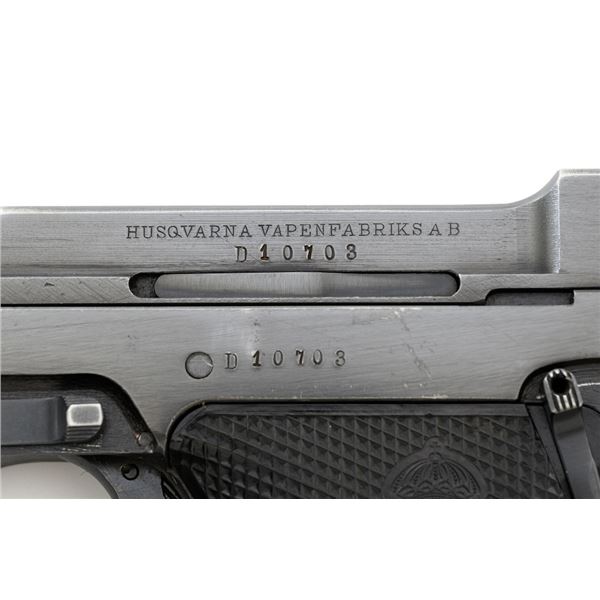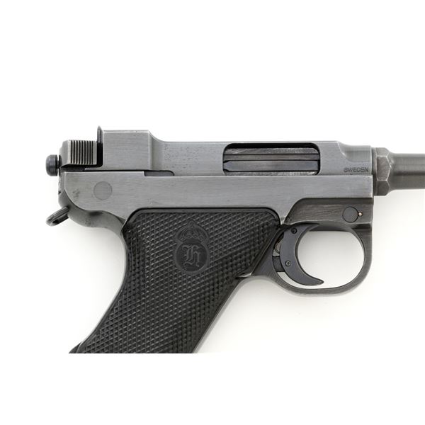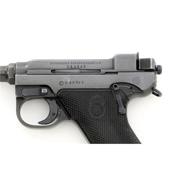 Swedish M40 Lahti Husqvarna Semi-Automatic Pistol, #D10703, 9mm cal., 4.6"barrel, blued finish, checkered black plastic grips embossed with crowned Husqvarna motifs on each side, dovetailed blade front sight, and "U"-notched rear sight. A fixed lanyard loop is mounted on the rear of the frame. Includes one unmarked blued steel magazine. Left side of the barrel extension is marked "HUSQVARNA VAPENFABRIKS AB". Rear of frame is stamped "(Crown)HV". Matching numbers on frame and barrel. Stamped "Sweden" on right side of the barrel. Pistol is in fine overall condition, retaining approx. 93% blue, showing edge wear to the frame and muzzle, with operating wear to the bolt. Grips have a few handling marks to the left side. Action operates smoothly. Bore is bright with well-defined rifling. Est.: $800-$1,100. (C&R/PPT)