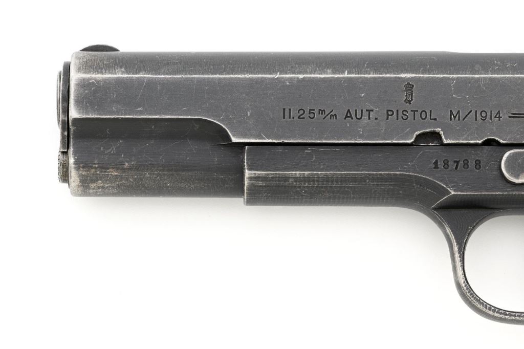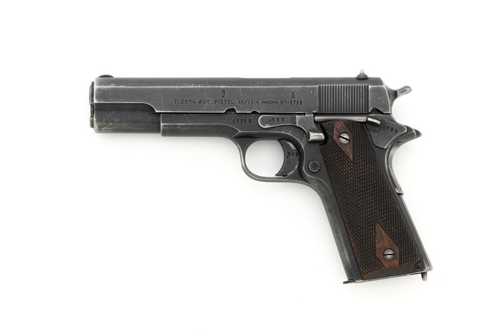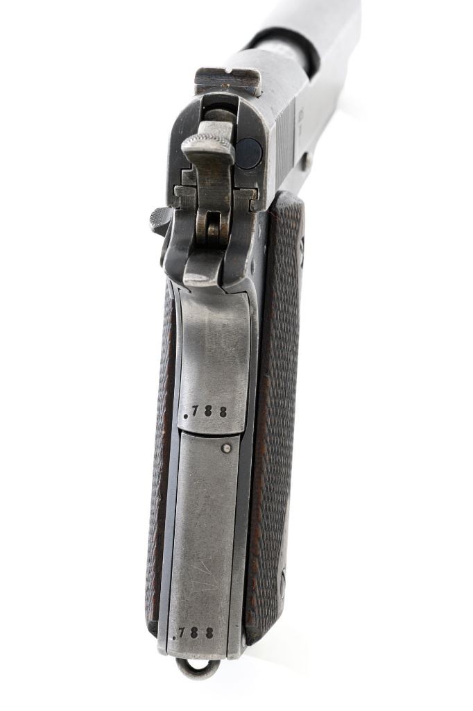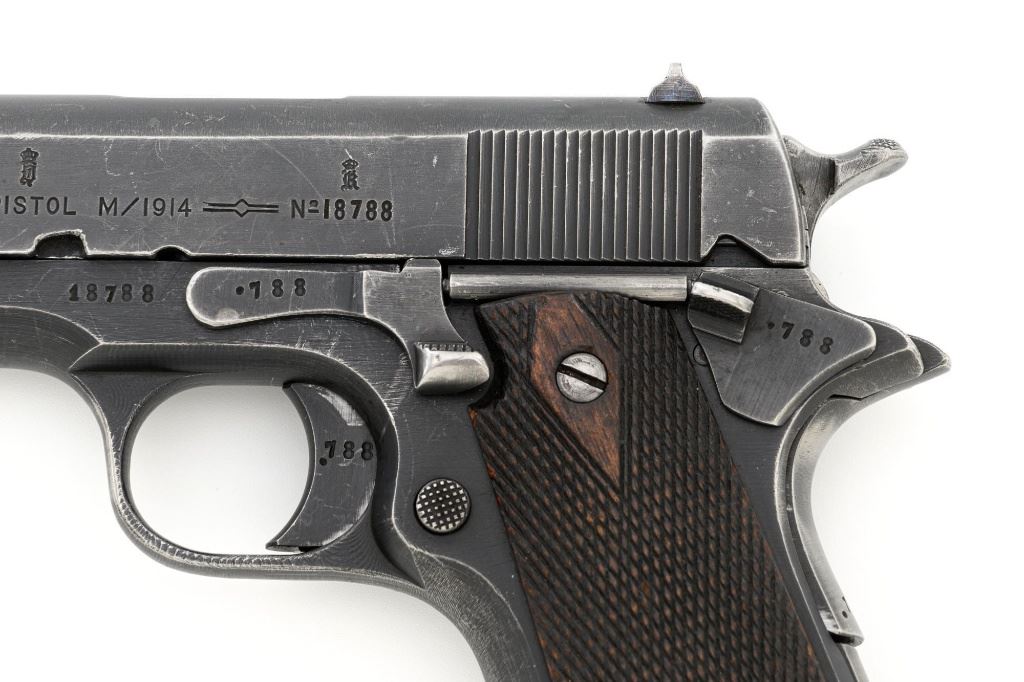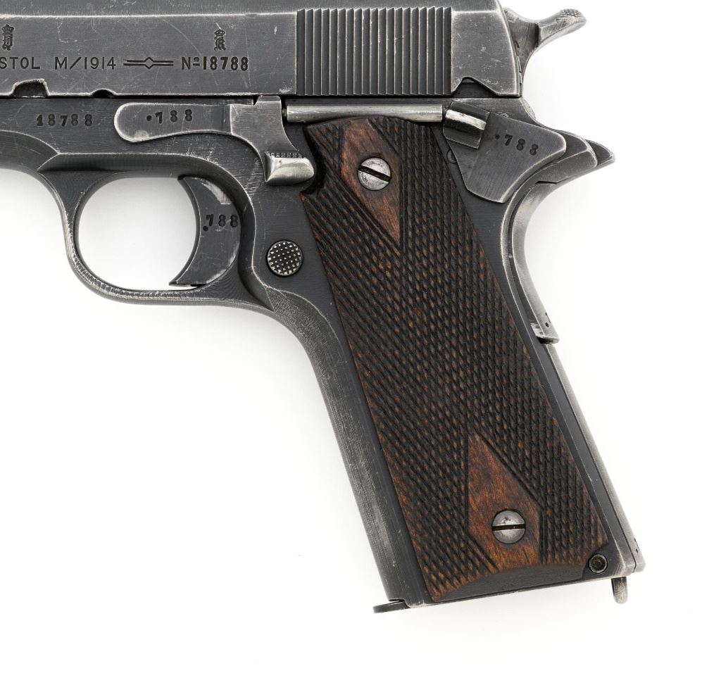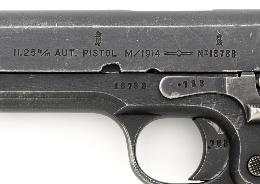 Norwegian Kongsberg Model 1914 Semi-Automatic Pistol, #18788, 11.25mm (.45 ACP) cal., 5" barrel, parkerized finish, checked double diamond walnut grips, with standard blade front sight and "U"-notched rear sight. Includes one unmarked magazine, no lanyard loop. Mfgd 1928. Frame is marked "18788" on the left side. Slide is marked "11.25 m/m AUT. PISTOL M/1914 No 18788" with two "(crowns)" above on the left side. Right side is marked "1928 KK". Visible matching numbers on the slide stop, thumb safety, magazine catch, grip safety, mainspring housing, hammer, trigger. Matching serial number is located on underside of the barrel. Pistol is in very good overall condition, retaining approx. 70% parkerized finish, showing general thinning, toning, and handling marks, with much of the finish wear being to the front grip strap and high points. Additionally, the mainspring housing, grip safety, magazine catch, and hammer are lacking finish. Factory lettering is clear. Grips are in very good condition, showing moderate age and handling wear. Action works properly. Bore is very good with sharp rifling. Est.: $2,000-$2,500. (C&R/PPT)