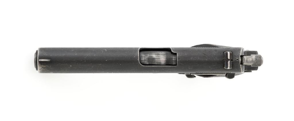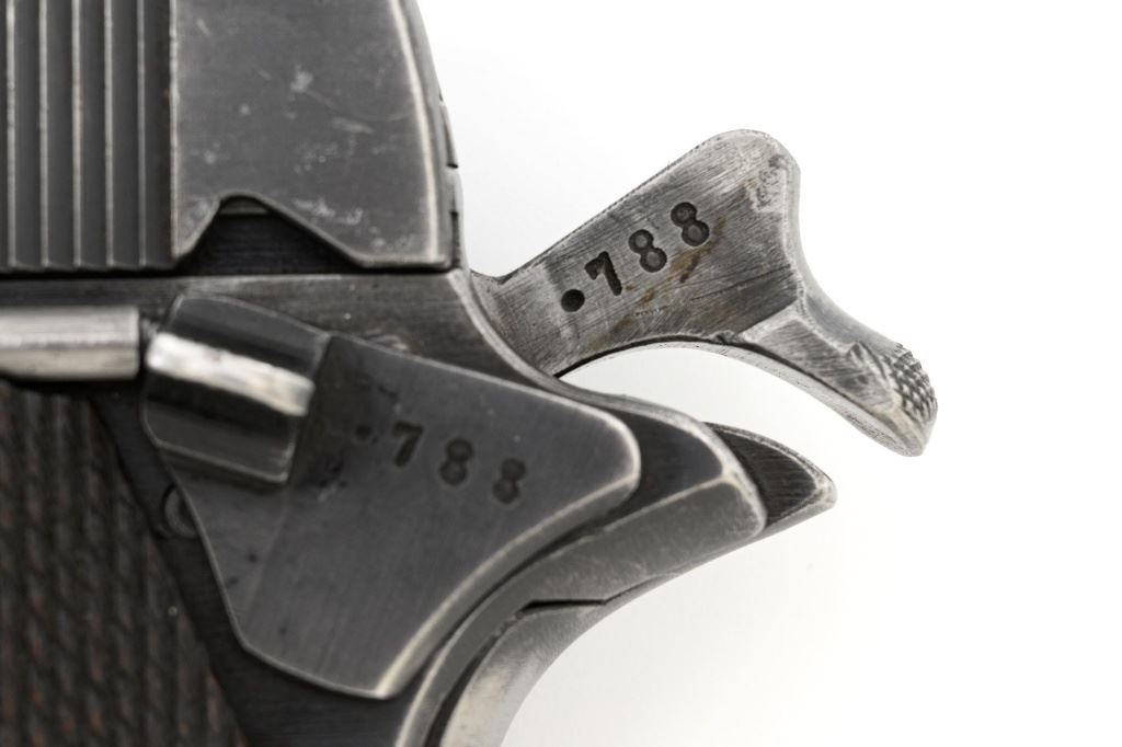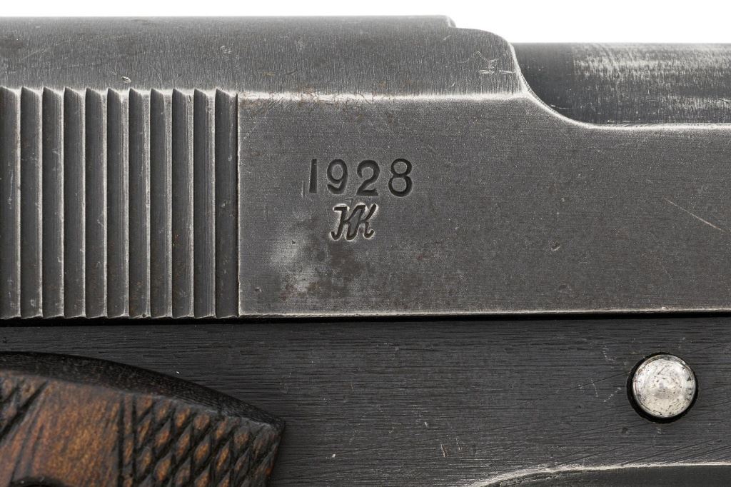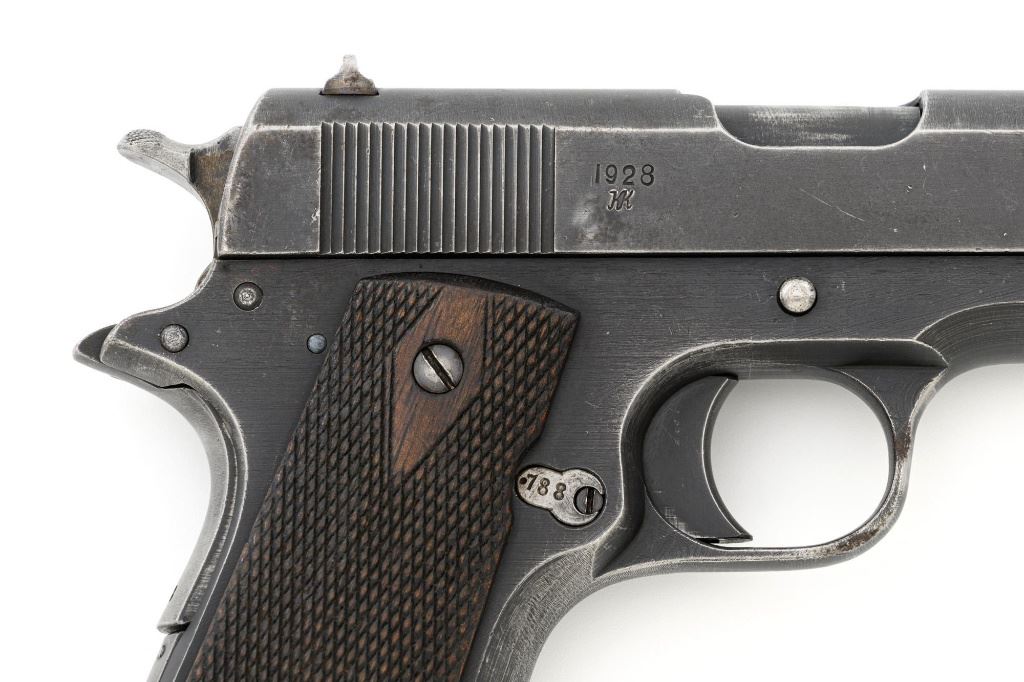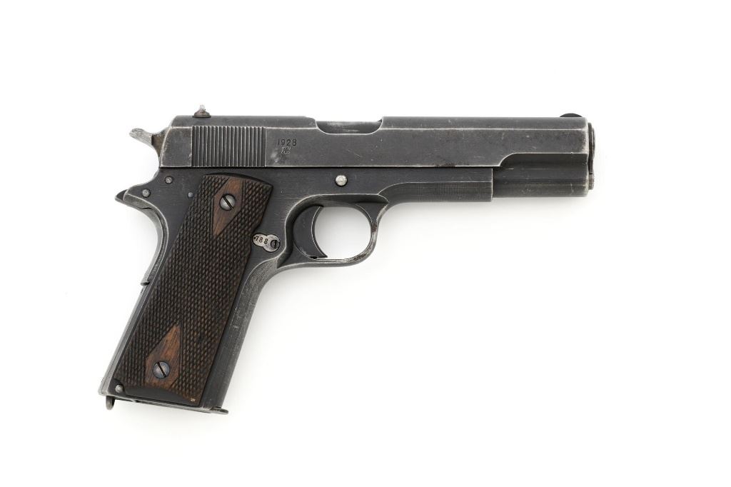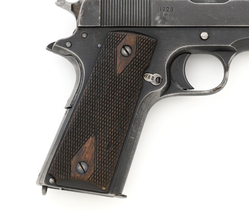 Norwegian Kongsberg Model 1914 Semi-Automatic Pistol, #18788, 11.25mm (.45 ACP) cal., 5" barrel, parkerized finish, checked double diamond walnut grips, with standard blade front sight and "U"-notched rear sight. Includes one unmarked magazine, no lanyard loop. Mfgd 1928. Frame is marked "18788" on the left side. Slide is marked "11.25 m/m AUT. PISTOL M/1914 No 18788" with two "(crowns)" above on the left side. Right side is marked "1928 KK". Visible matching numbers on the slide stop, thumb safety, magazine catch, grip safety, mainspring housing, hammer, trigger. Matching serial number is located on underside of the barrel. Pistol is in very good overall condition, retaining approx. 70% parkerized finish, showing general thinning, toning, and handling marks, with much of the finish wear being to the front grip strap and high points. Additionally, the mainspring housing, grip safety, magazine catch, and hammer are lacking finish. Factory lettering is clear. Grips are in very good condition, showing moderate age and handling wear. Action works properly. Bore is very good with sharp rifling. Est.: $2,000-$2,500. (C&R/PPT)