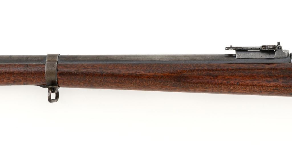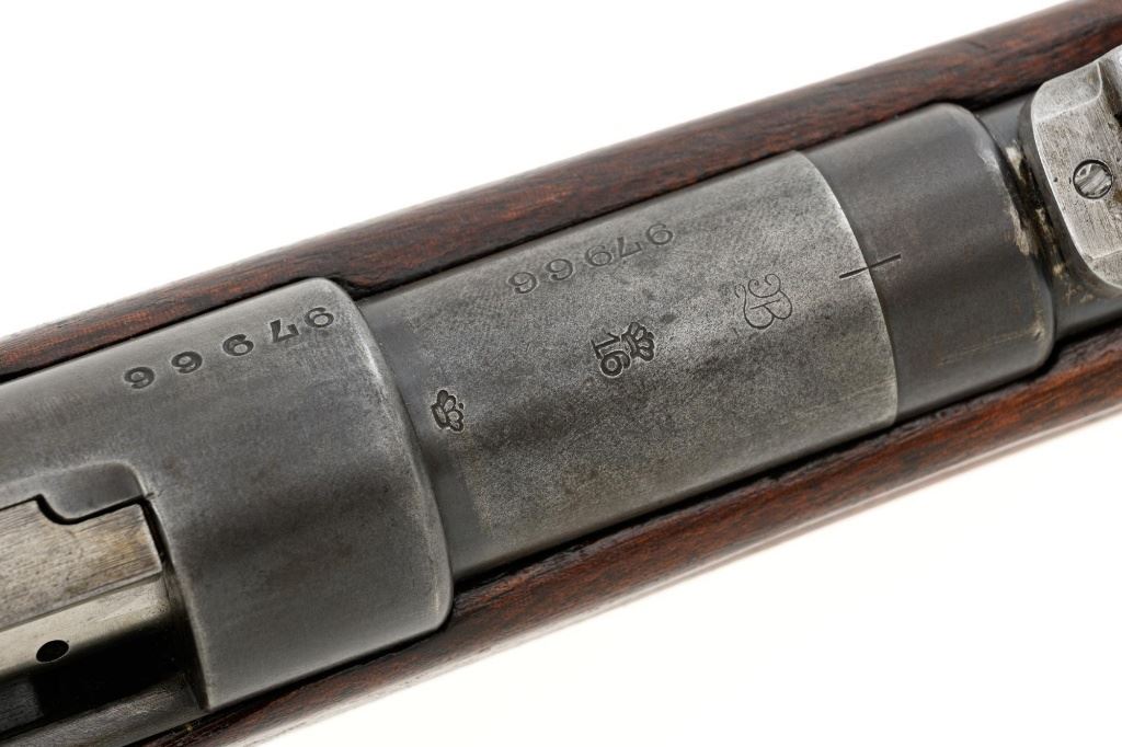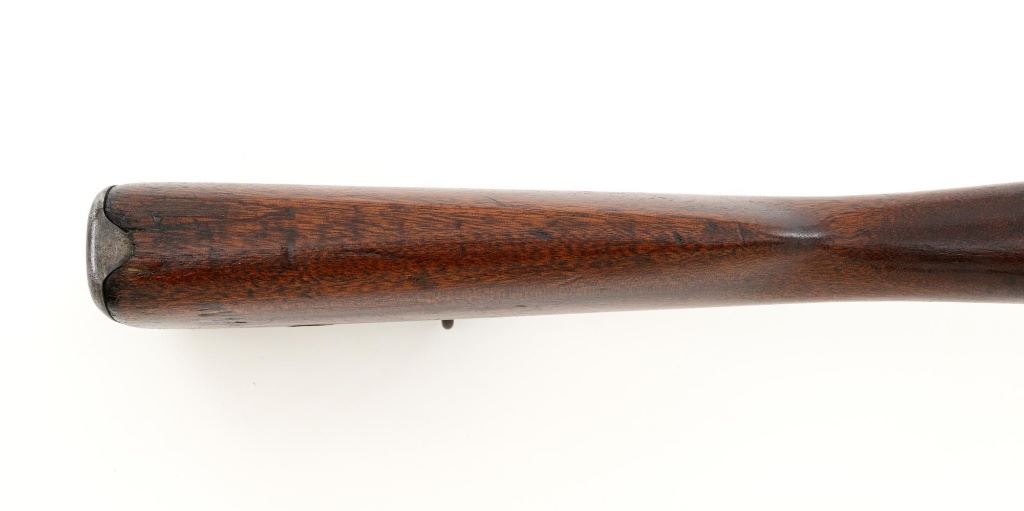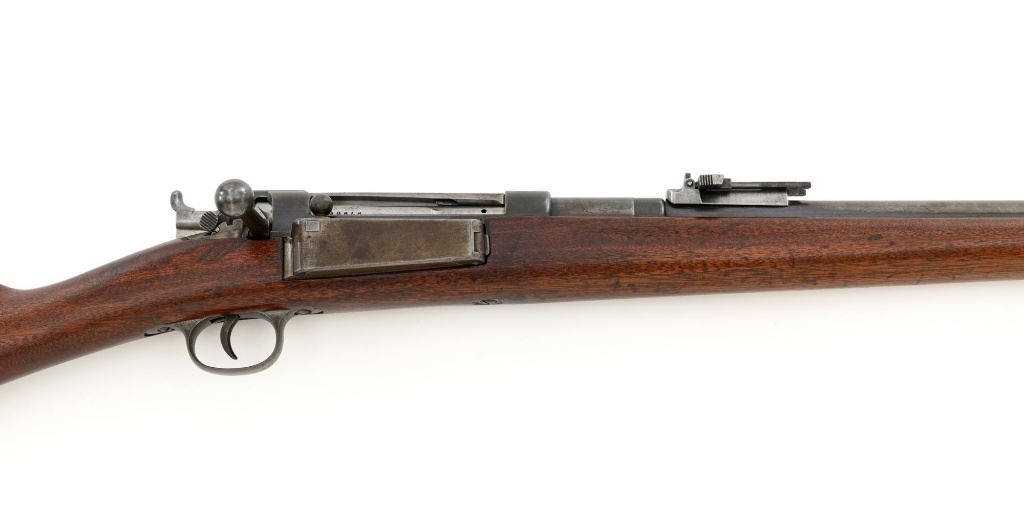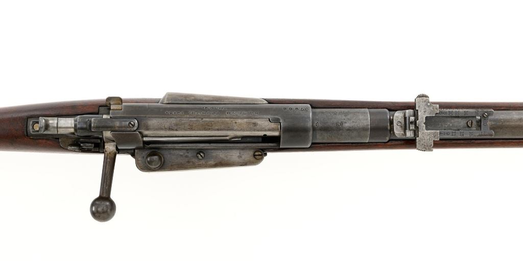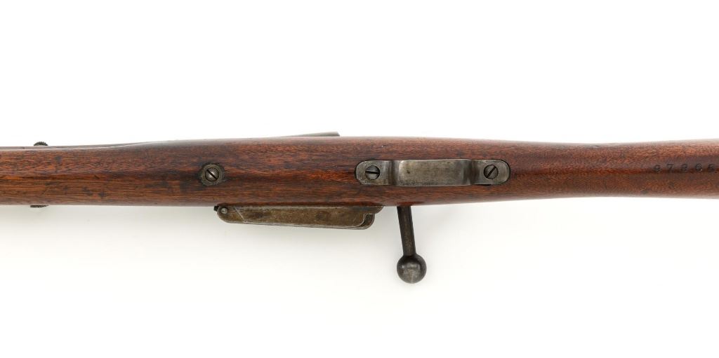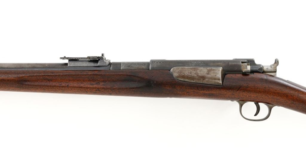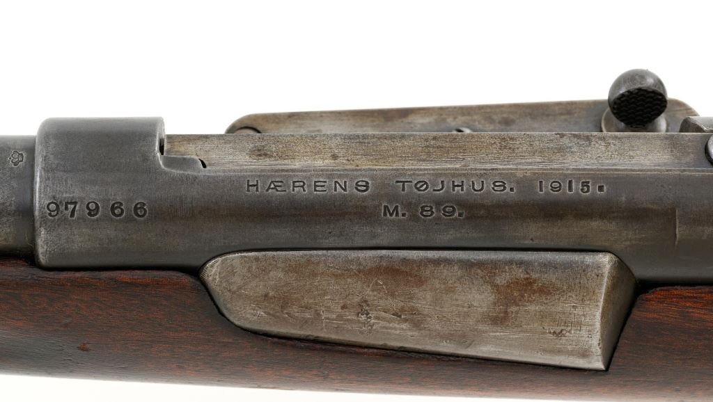 Danish Model 1889 Krag Bolt Action Rifle, #97966, 8x58mmR cal., 32" barrel, blued finish, walnut stock, blade front sight, and adjustable "U"-notched rear sight. Rifle was made in 1915 and the receiver is marked "97966 HAERENS TOJHUS 1915/M89" on the left side. Matching visible numbers on the bolt, magazine hinge, barrel, and bayonet lug. Top of barrel marked with "(crown)". Rifle is in very good overall condition, retaining approx. 60% thinning and toning blue, with most of the wear on the magazine door, sideplate, and buttplate. Stock is in good condition, with some overall handling wear. Forend with an angled cut 5.5" behind the front band, that was glued back together. Stock disc is marked "9R./2880". Action works properly. Bore is very good with clearly defined rifling. Est.: $800-$1,000. (C&R)