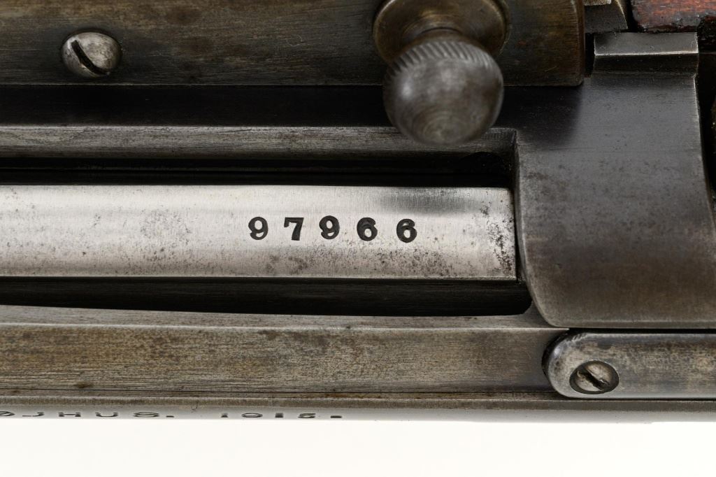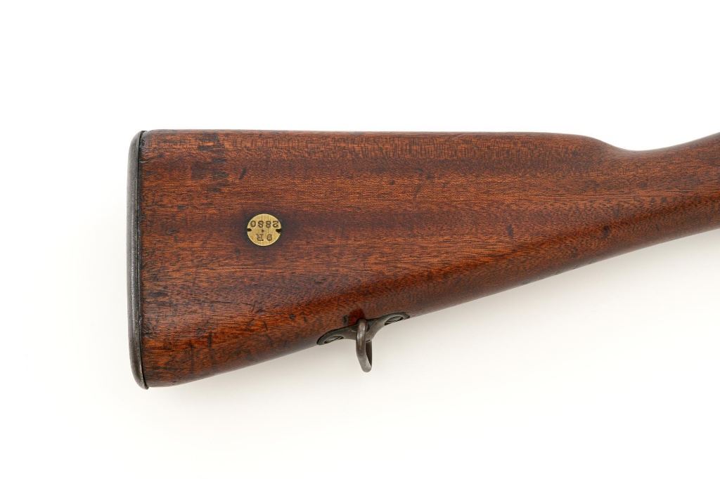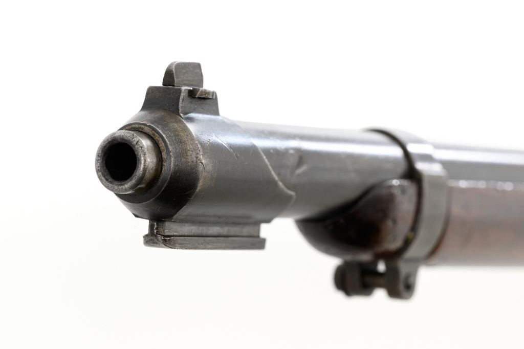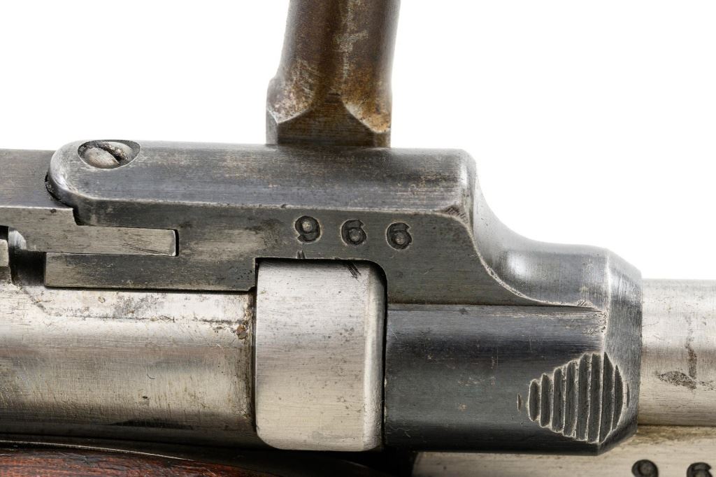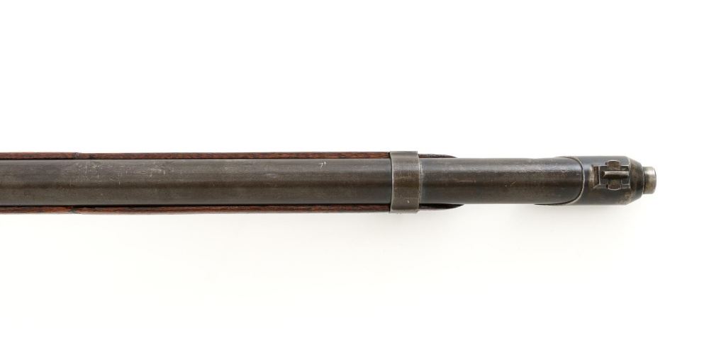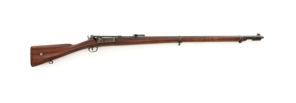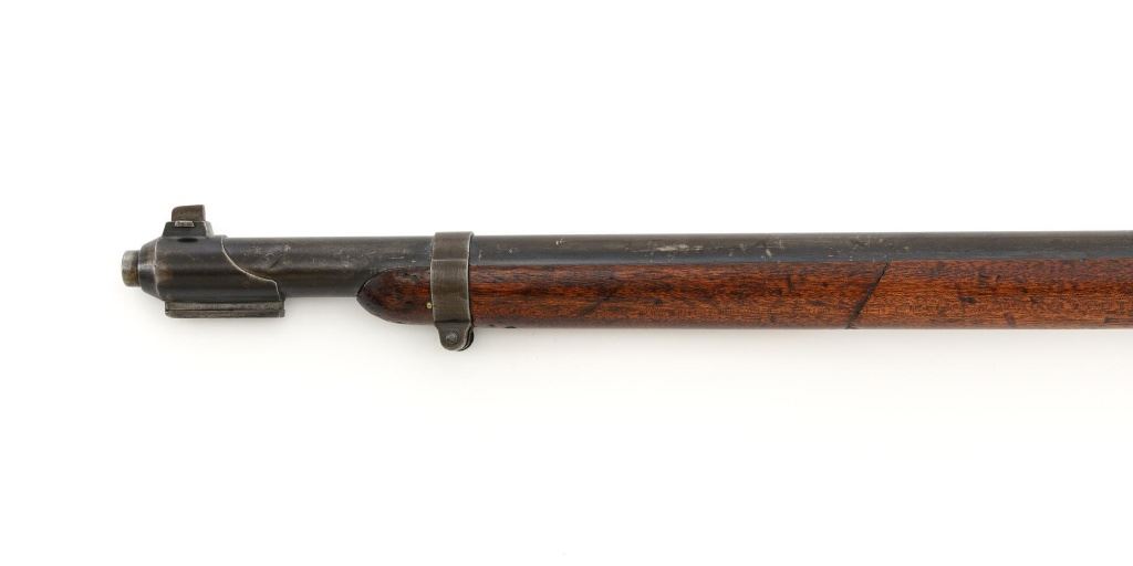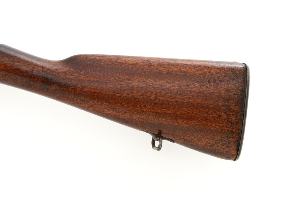 Danish Model 1889 Krag Bolt Action Rifle, #97966, 8x58mmR cal., 32" barrel, blued finish, walnut stock, blade front sight, and adjustable "U"-notched rear sight. Rifle was made in 1915 and the receiver is marked "97966 HAERENS TOJHUS 1915/M89" on the left side. Matching visible numbers on the bolt, magazine hinge, barrel, and bayonet lug. Top of barrel marked with "(crown)". Rifle is in very good overall condition, retaining approx. 60% thinning and toning blue, with most of the wear on the magazine door, sideplate, and buttplate. Stock is in good condition, with some overall handling wear. Forend with an angled cut 5.5" behind the front band, that was glued back together. Stock disc is marked "9R./2880". Action works properly. Bore is very good with clearly defined rifling. Est.: $800-$1,000. (C&R)