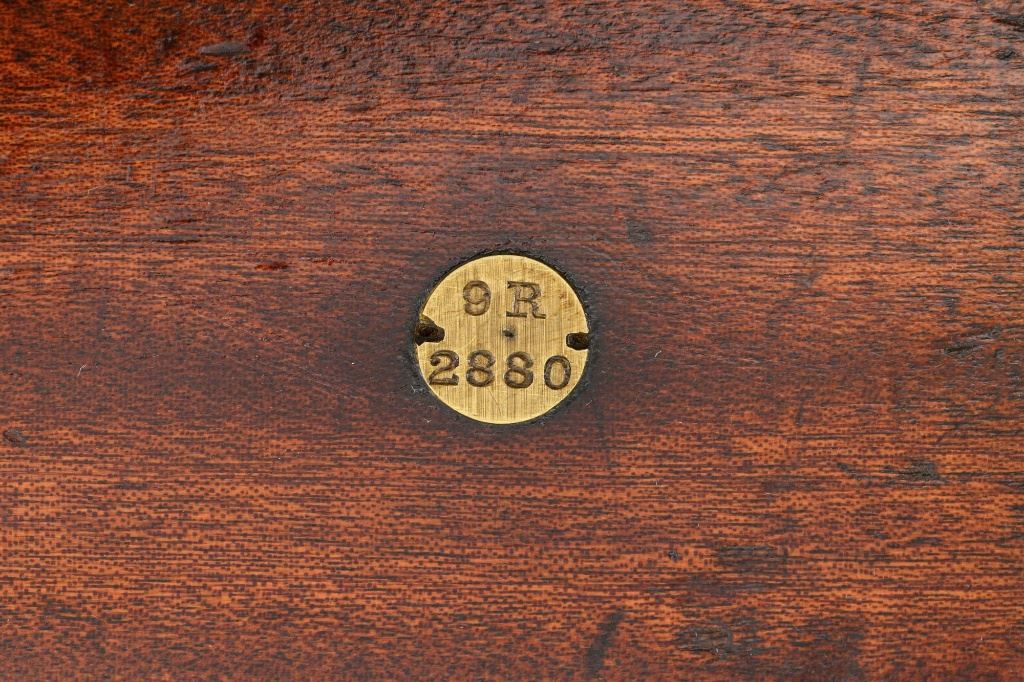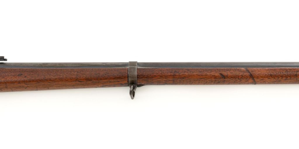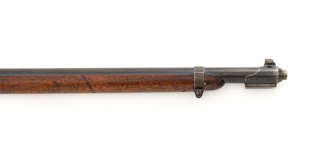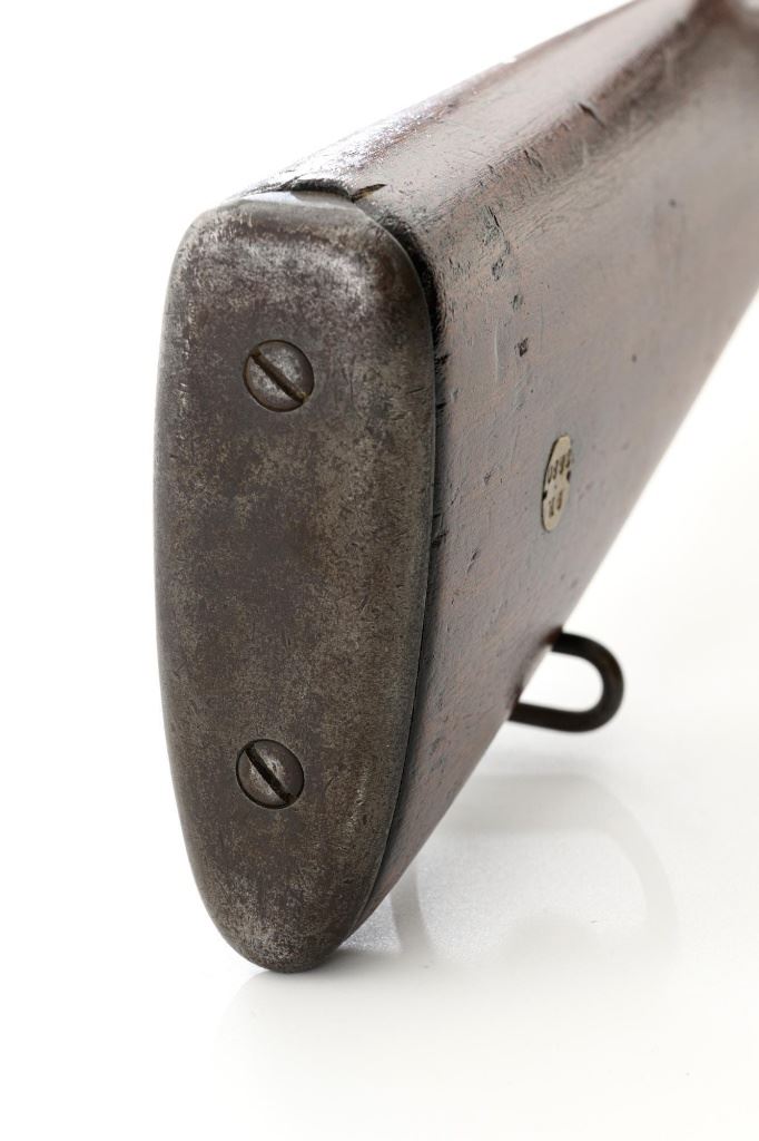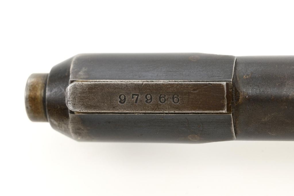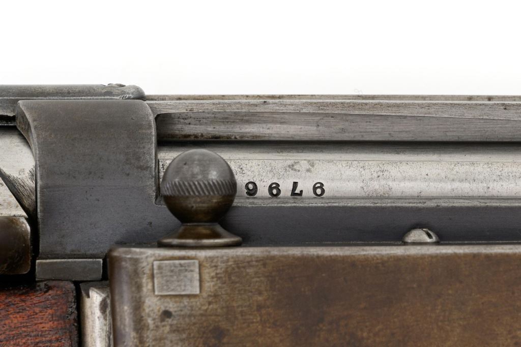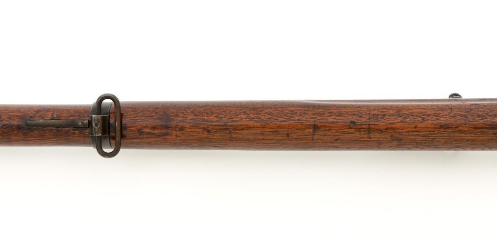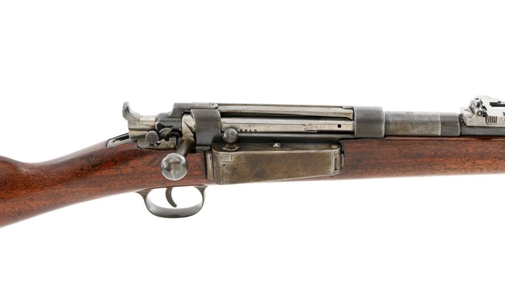 Danish Model 1889 Krag Bolt Action Rifle, #97966, 8x58mmR cal., 32" barrel, blued finish, walnut stock, blade front sight, and adjustable "U"-notched rear sight. Rifle was made in 1915 and the receiver is marked "97966 HAERENS TOJHUS 1915/M89" on the left side. Matching visible numbers on the bolt, magazine hinge, barrel, and bayonet lug. Top of barrel marked with "(crown)". Rifle is in very good overall condition, retaining approx. 60% thinning and toning blue, with most of the wear on the magazine door, sideplate, and buttplate. Stock is in good condition, with some overall handling wear. Forend with an angled cut 5.5" behind the front band, that was glued back together. Stock disc is marked "9R./2880". Action works properly. Bore is very good with clearly defined rifling. Est.: $800-$1,000. (C&R)