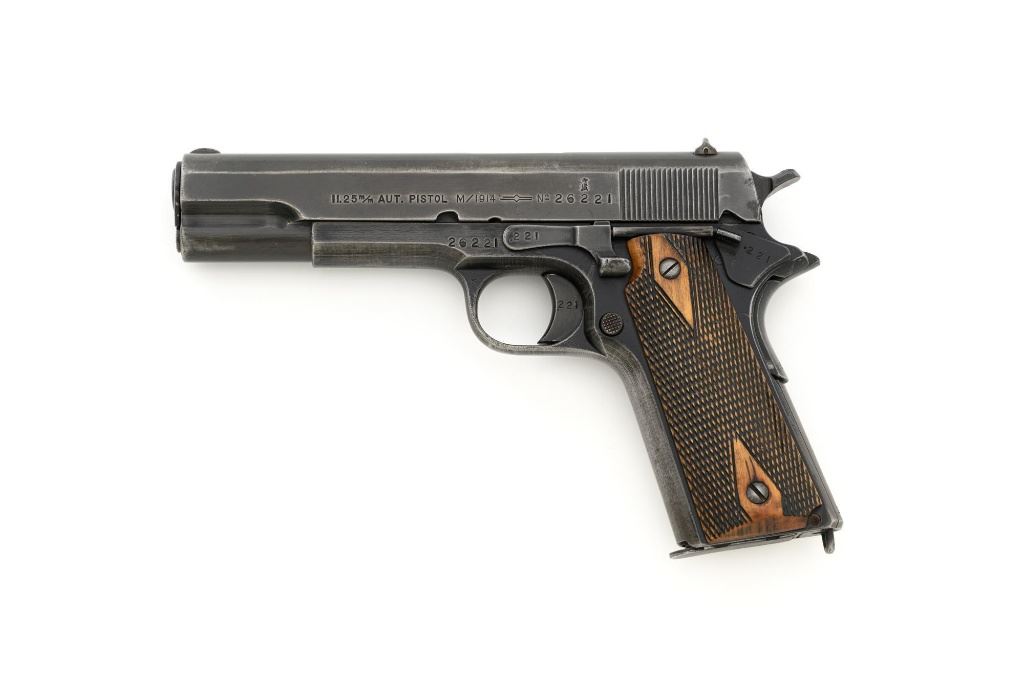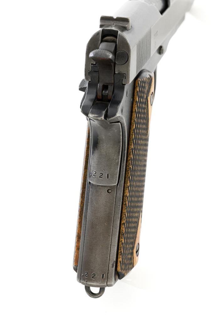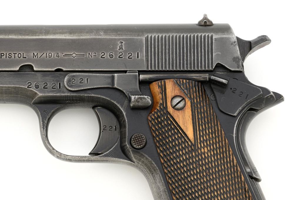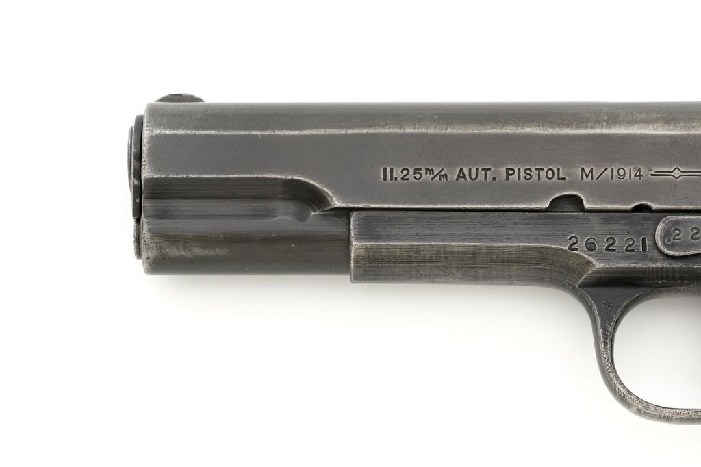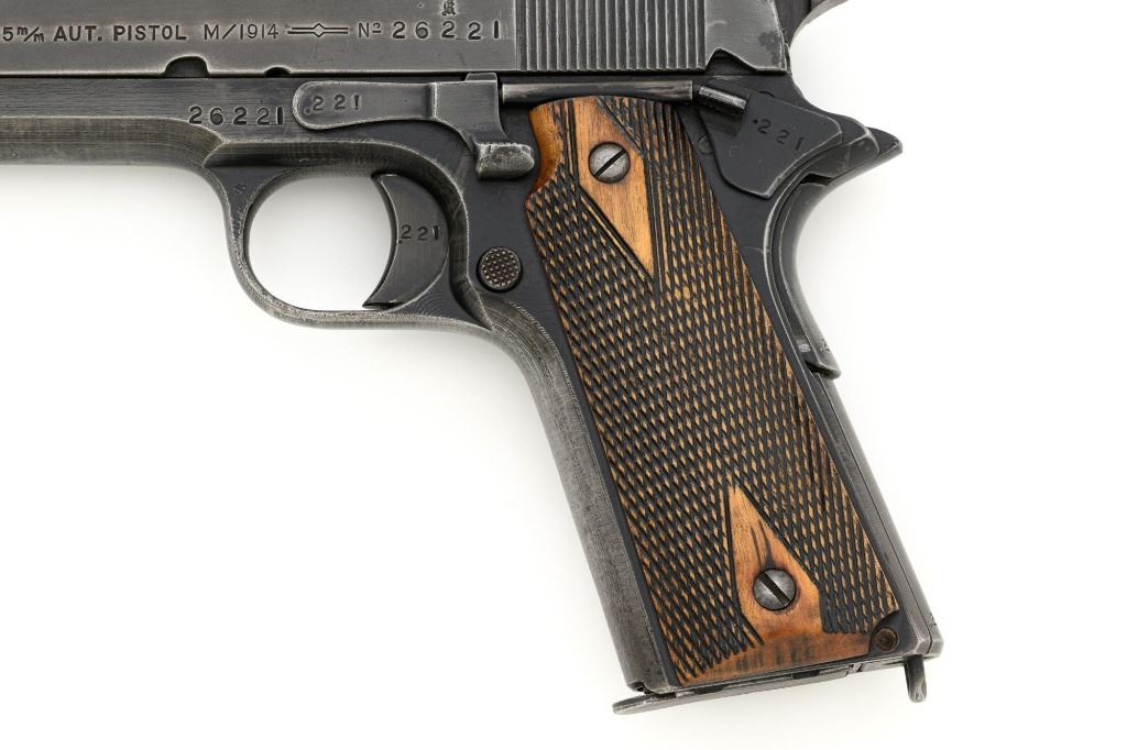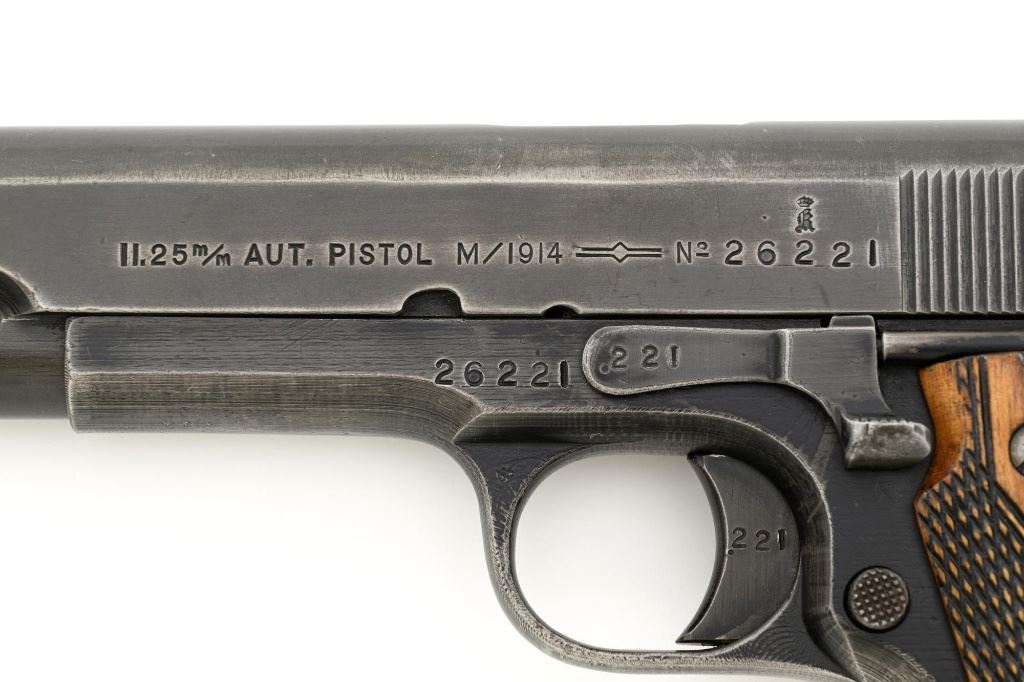 Norwegian Kongsberg Model 1914 Semi-Automatic Pistol, #26221, 11.25mm (.45 ACP) cal., 5" barrel, parkerized finish, checkered birch grips, with standard blade front sight, and "U"-notched rear sight. Includes one unmarked magazine, no lanyard loop. Mfgd 1941. Frame is marked "26221" on the left side. Slide is marked "11.25 m/m AUT. PISTOL M1914 No 26221" with one "(crown)" above on the left side. Right is marked "1941". Visible matching numbers on the mainspring housing, grip safety, thumb safety, slide lock, and trigger. Matching serial number is located on the underside of the barrel. Pistol is in good overall condition, retaining approx. 50% parkerized finish, showing general thinning and toning, and handling wear, especially on the grip area. Grips are very good, showing moderate age and handling wear. Action works properly. Bore is good with light frosting, and clear rifling. Est.: $1,800-$2,200. (C&R/PPT)