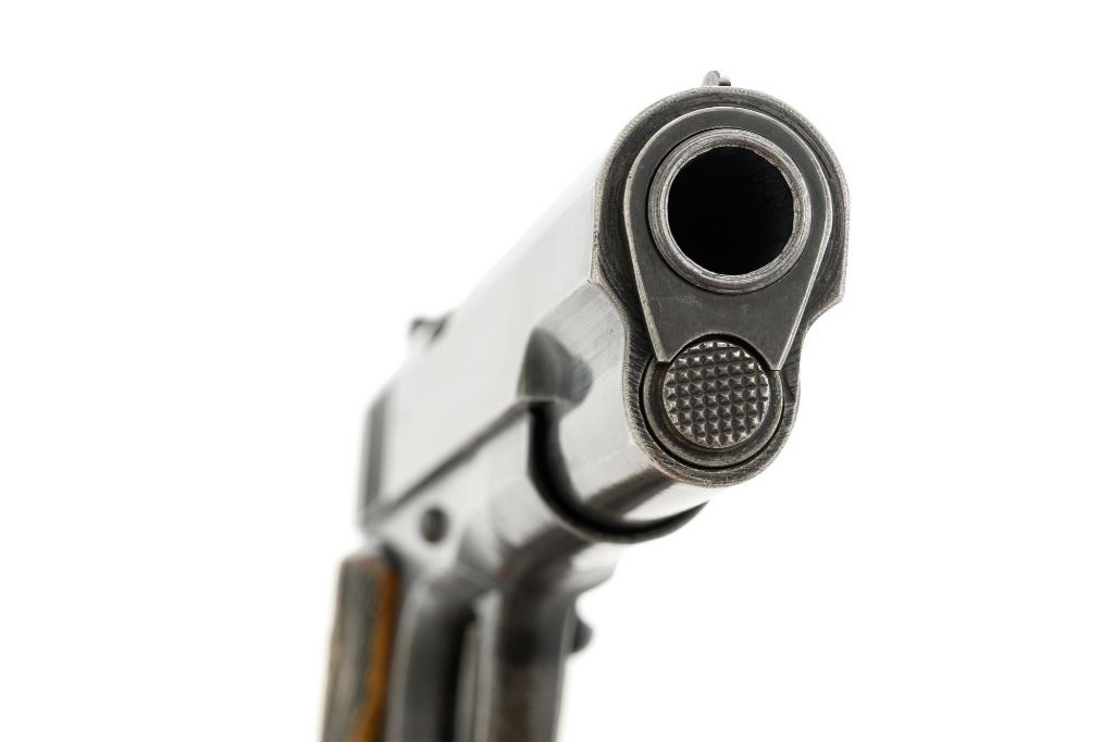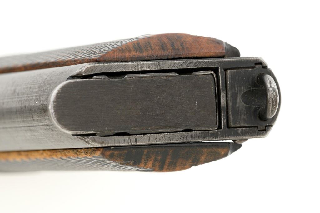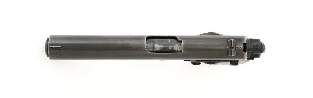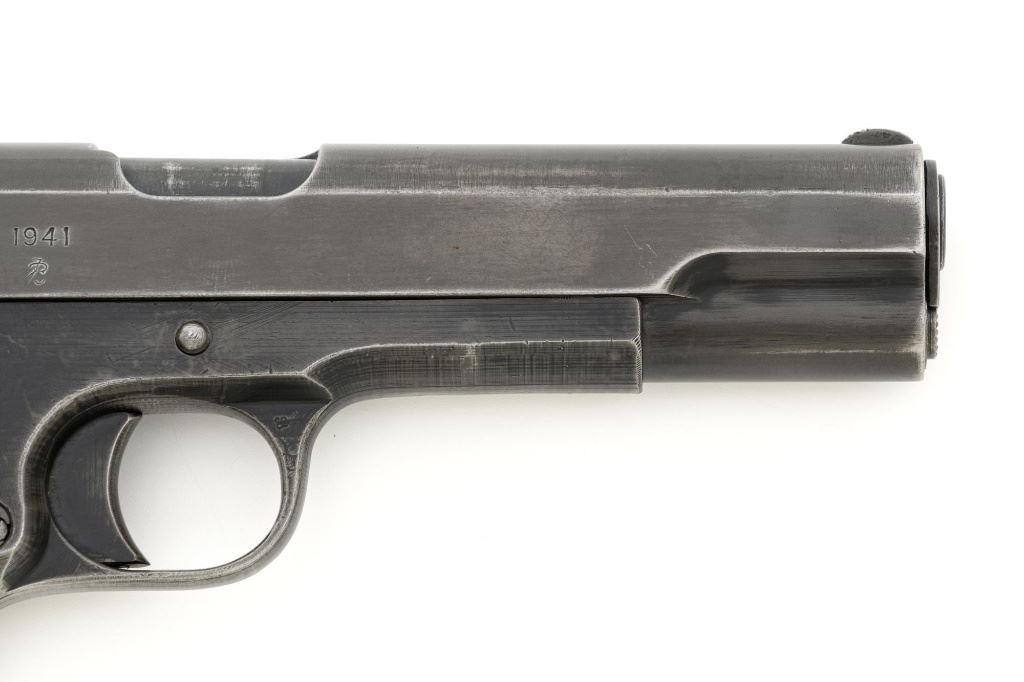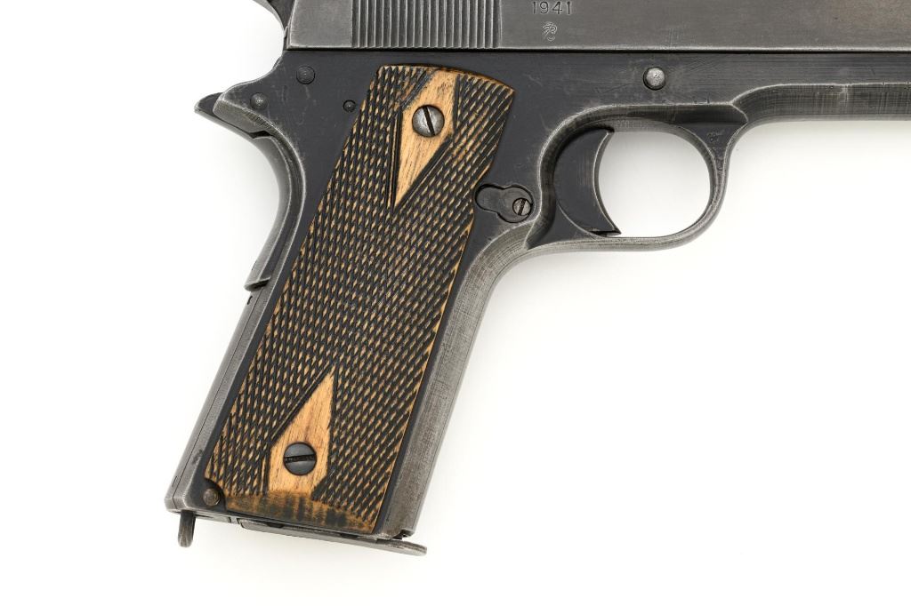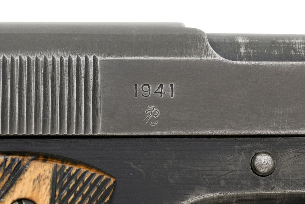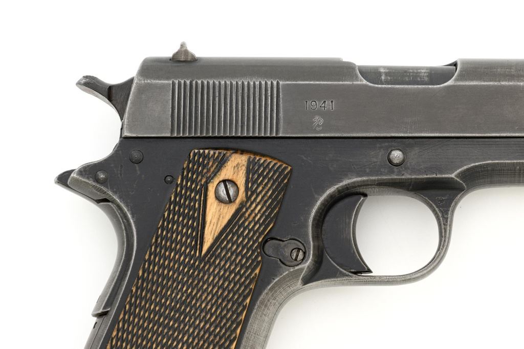 Norwegian Kongsberg Model 1914 Semi-Automatic Pistol, #26221, 11.25mm (.45 ACP) cal., 5" barrel, parkerized finish, checkered birch grips, with standard blade front sight, and "U"-notched rear sight. Includes one unmarked magazine, no lanyard loop. Mfgd 1941. Frame is marked "26221" on the left side. Slide is marked "11.25 m/m AUT. PISTOL M1914 No 26221" with one "(crown)" above on the left side. Right is marked "1941". Visible matching numbers on the mainspring housing, grip safety, thumb safety, slide lock, and trigger. Matching serial number is located on the underside of the barrel. Pistol is in good overall condition, retaining approx. 50% parkerized finish, showing general thinning and toning, and handling wear, especially on the grip area. Grips are very good, showing moderate age and handling wear. Action works properly. Bore is good with light frosting, and clear rifling. Est.: $1,800-$2,200. (C&R/PPT)