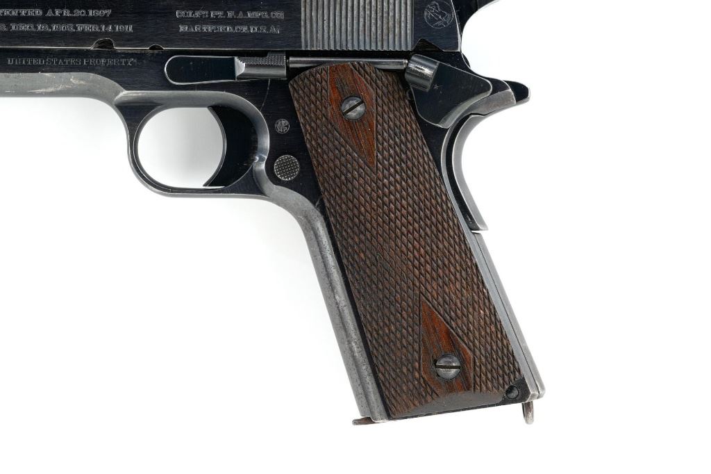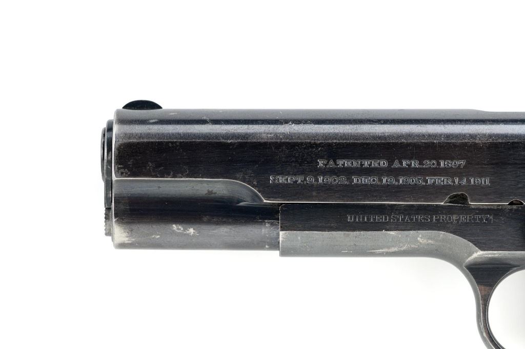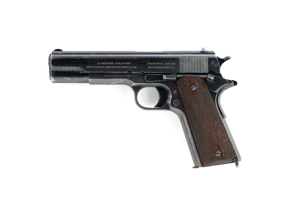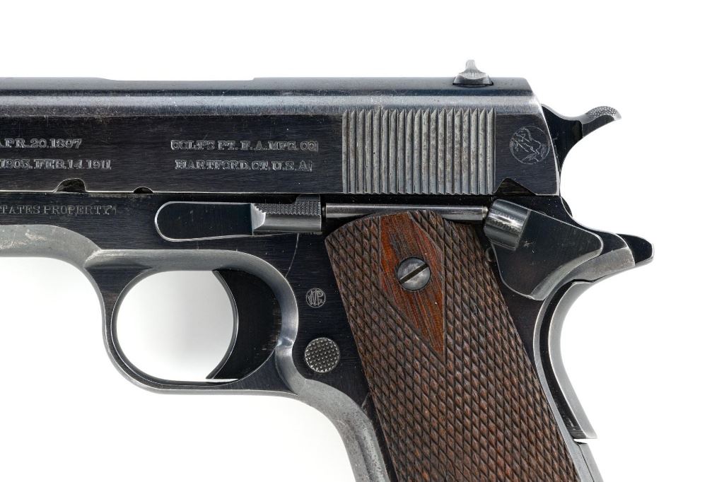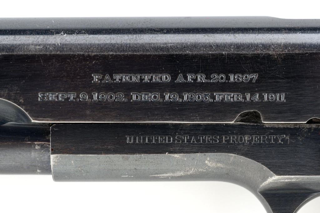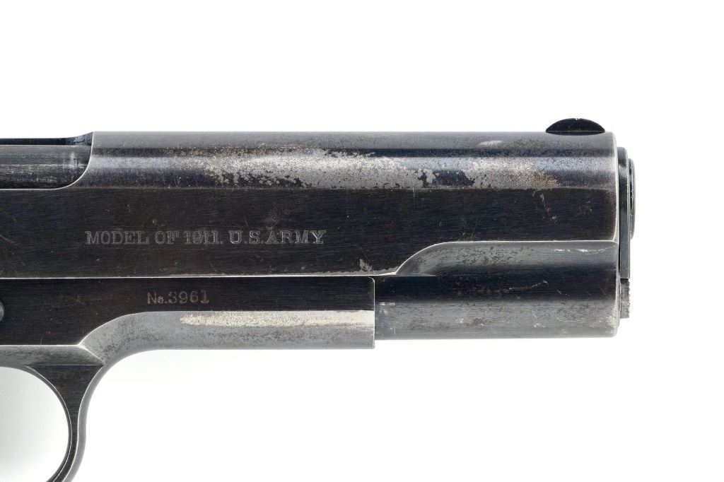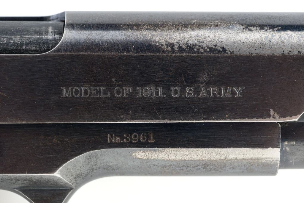 Colt Model 1911 U.S. Army Semi-Automatic Pistol, #3961 .45 ACP cal., 5" barrel, blued finish, checkered double diamond walnut grips, standard blade front sight and rounded fixed "U"-notch rear sight. Includes one WWI era two-tone magazine. Mfg'd 1912. Frame is marked "UNITED STATES PROPERTY" with "WGP" (Maj. Walter G. Penfield) inspection mark on the left side. Serial number is located on the right side, towards the front of the frame. Slide has the patent dates to Feb. 14, 1911, and Colt company markings on the left side, with a circled "(Rampant Colt)" at the rear. Right side is marked "MODEL OF 1911 U.S. ARMY." Back of the barrel is marked "H". Pistol is in very good overall condition, retaining approx. 75%-80% factory blue, showing areas of mild frosting and general finish wear, particularly on top of the slide, bottom front of the receiver, and the grip area. Factory lettering is clear. Checkered diamond grips are in very good condition. Action works properly. Bore is good with some areas of light pitting; rifling is clearly defined. Est.: $6,000-$8,000. (C&R/PPT)