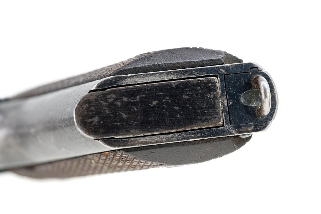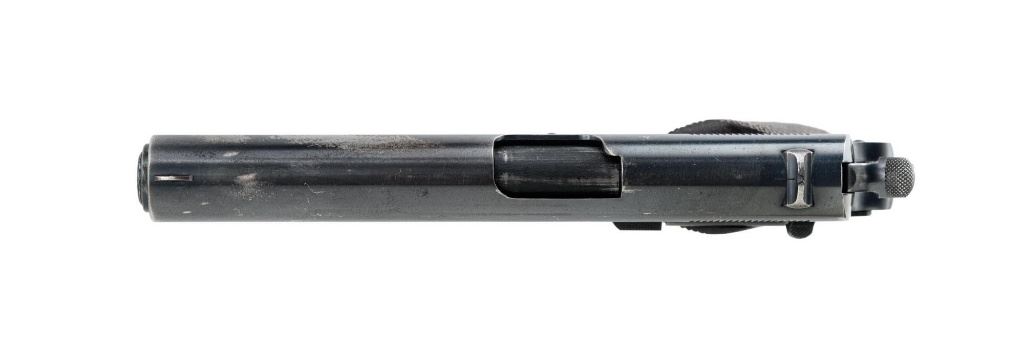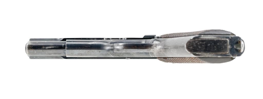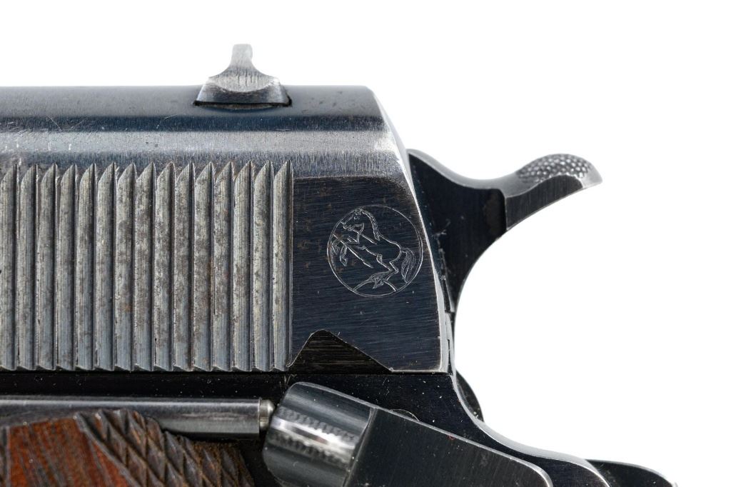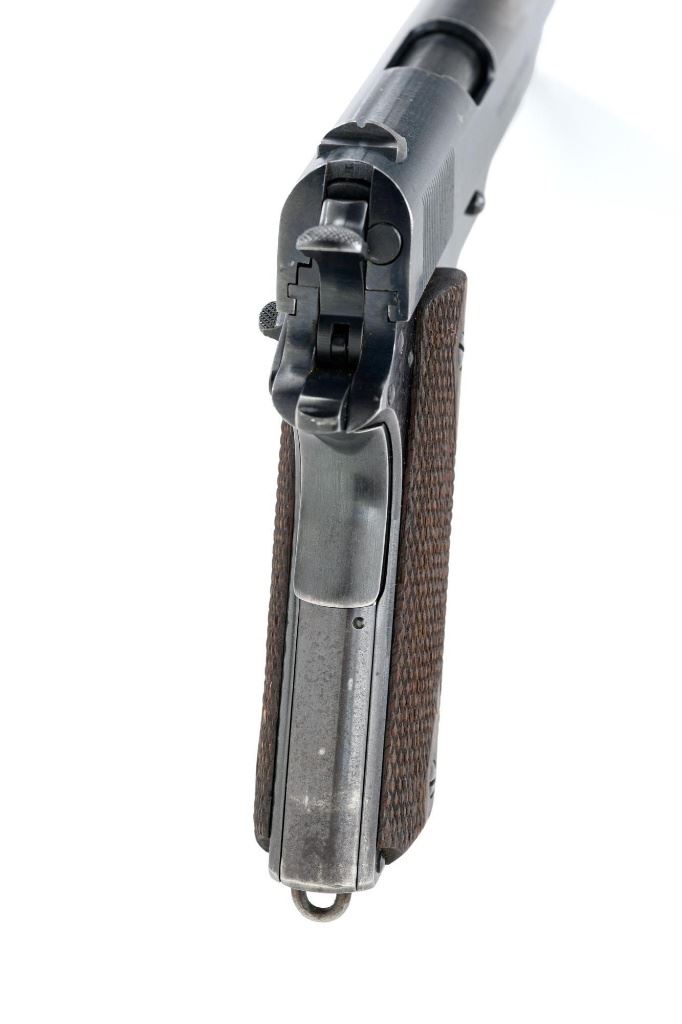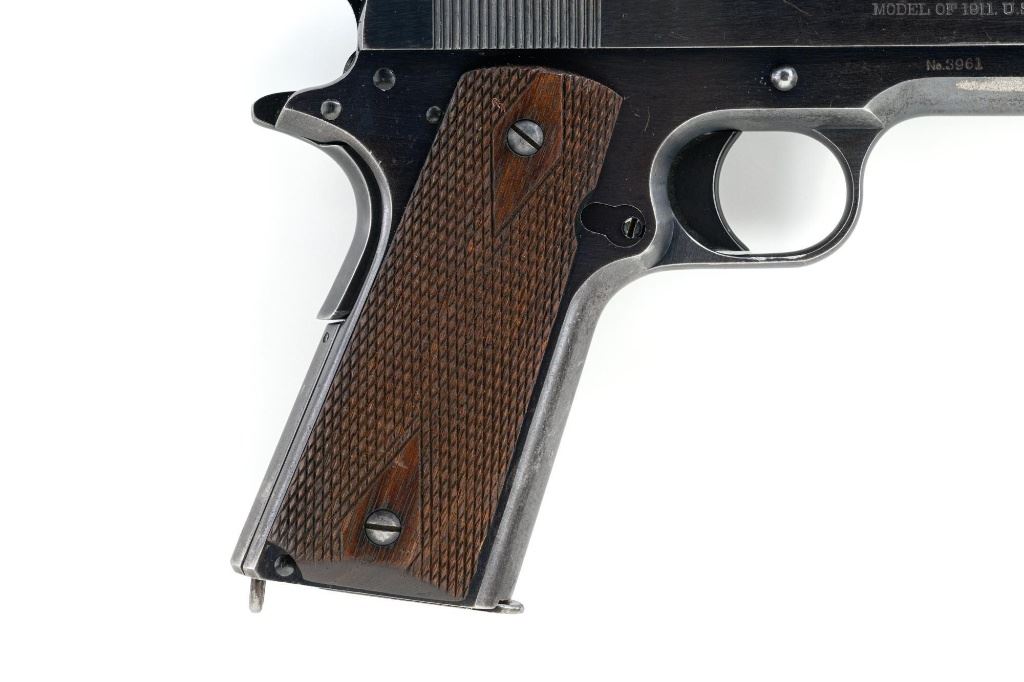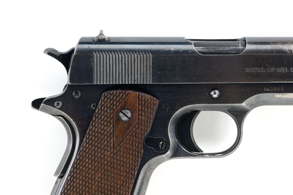 Colt Model 1911 U.S. Army Semi-Automatic Pistol, #3961 .45 ACP cal., 5" barrel, blued finish, checkered double diamond walnut grips, standard blade front sight and rounded fixed "U"-notch rear sight. Includes one WWI era two-tone magazine. Mfg'd 1912. Frame is marked "UNITED STATES PROPERTY" with "WGP" (Maj. Walter G. Penfield) inspection mark on the left side. Serial number is located on the right side, towards the front of the frame. Slide has the patent dates to Feb. 14, 1911, and Colt company markings on the left side, with a circled "(Rampant Colt)" at the rear. Right side is marked "MODEL OF 1911 U.S. ARMY." Back of the barrel is marked "H". Pistol is in very good overall condition, retaining approx. 75%-80% factory blue, showing areas of mild frosting and general finish wear, particularly on top of the slide, bottom front of the receiver, and the grip area. Factory lettering is clear. Checkered diamond grips are in very good condition. Action works properly. Bore is good with some areas of light pitting; rifling is clearly defined. Est.: $6,000-$8,000. (C&R/PPT)