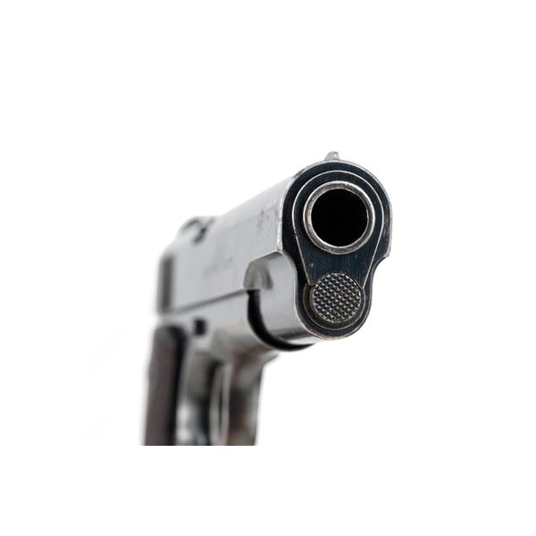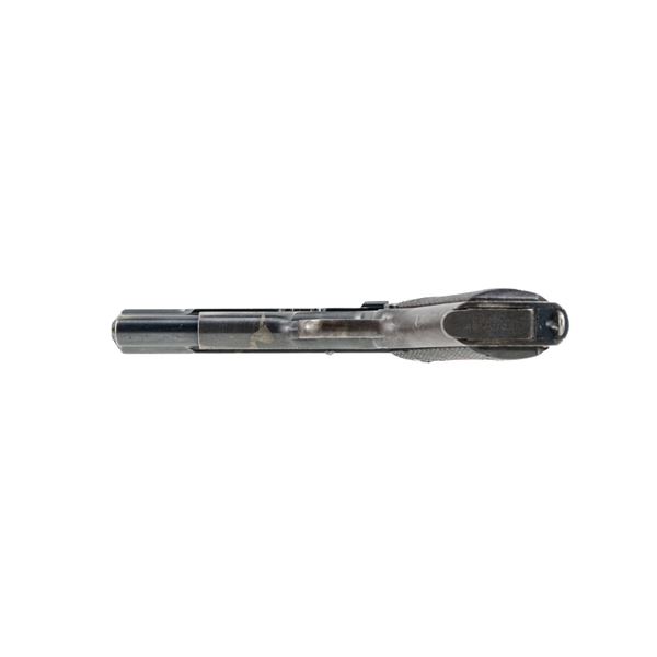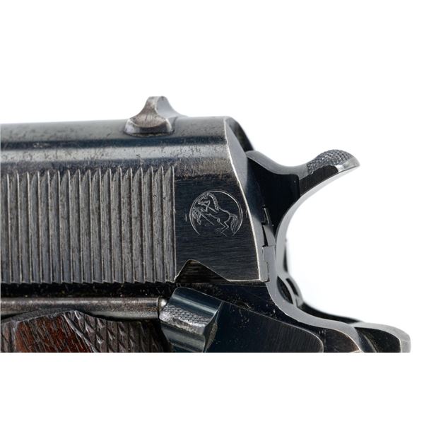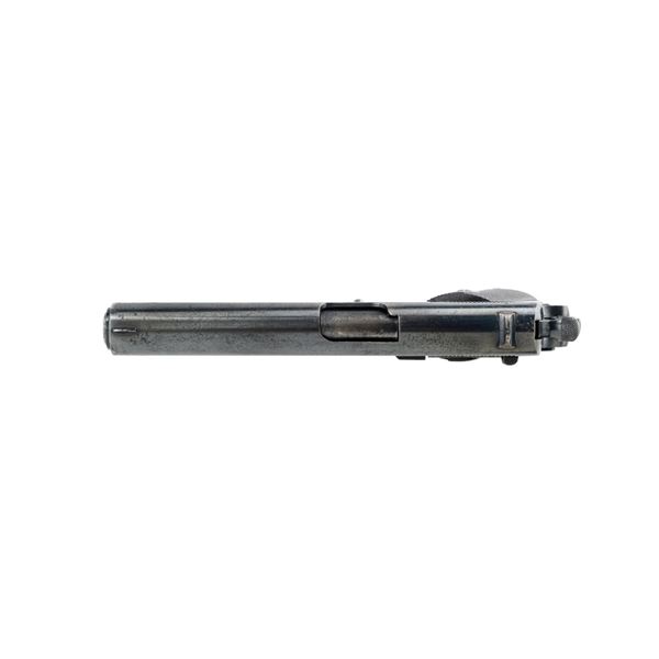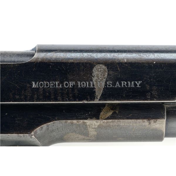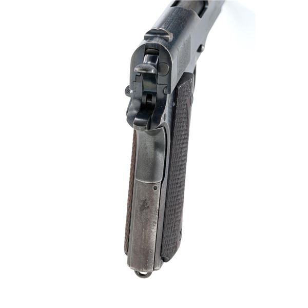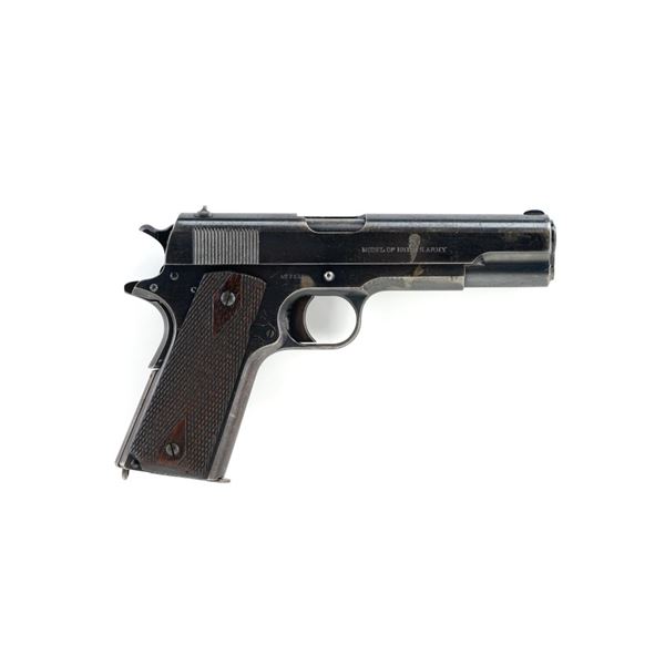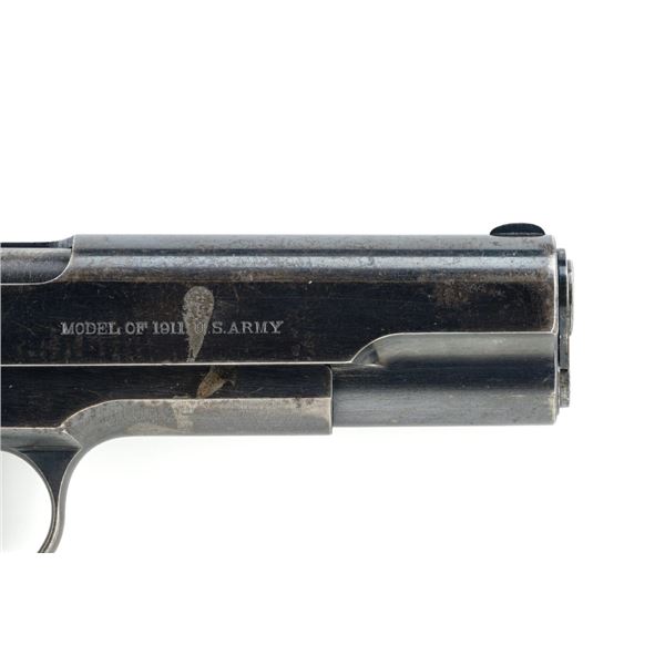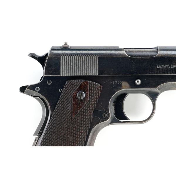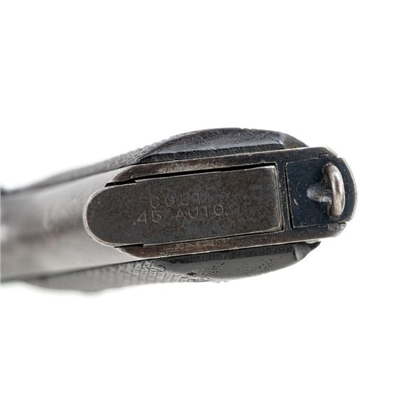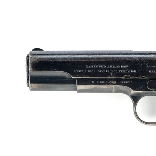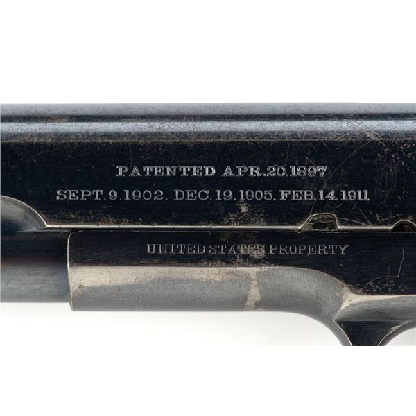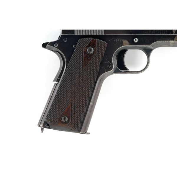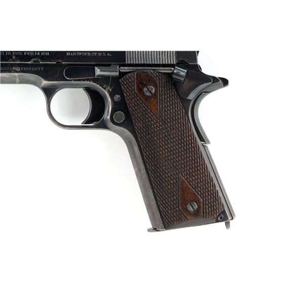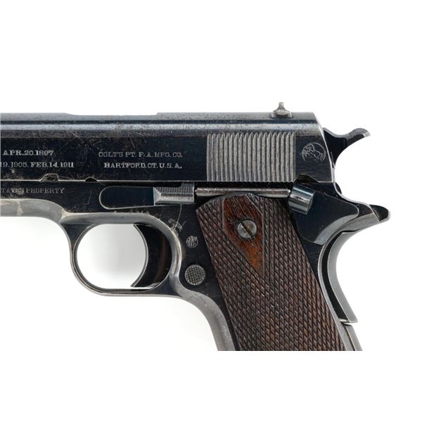Colt Model 1911 U.S. Army Semi-Automatic Pistol, #7533, .45 ACP cal., 5" barrel, blued finish, checkered double diamond walnut grips, with standard blade front sight and rounded "U"-notched rear sight. Includes one blued steel magazine, marked "COLT/45 AUTO" on the base. Mfg'd 1912. Frame is marked "UNITED STATES PROPERTY" with "WGP" (Maj. Walter G. Penfield) inspection mark on the left side. Slide has the patent dates to Feb. 14, 1911, and Colt company markings on the left side, with a circled "(Rampant Colt)" at the rear. Right side is marked "MODEL OF 1911 U.S. ARMY". Bottom of the barrel is marked "5", hood is marked "HP". Pistol is in very good overall condition, retaining approx. 70% factory blue, showing areas of mild frosting, and general finish wear; particularly on the grip straps, bottom of the receiver, with scattered blemishes on the slide. Factory lettering is clear. Grips are very good, showing a little more wear to the right grip. Action works properly. Bore is good with clearly defined rifling. Est.: $5,000-$7000. (C&R/PPT)