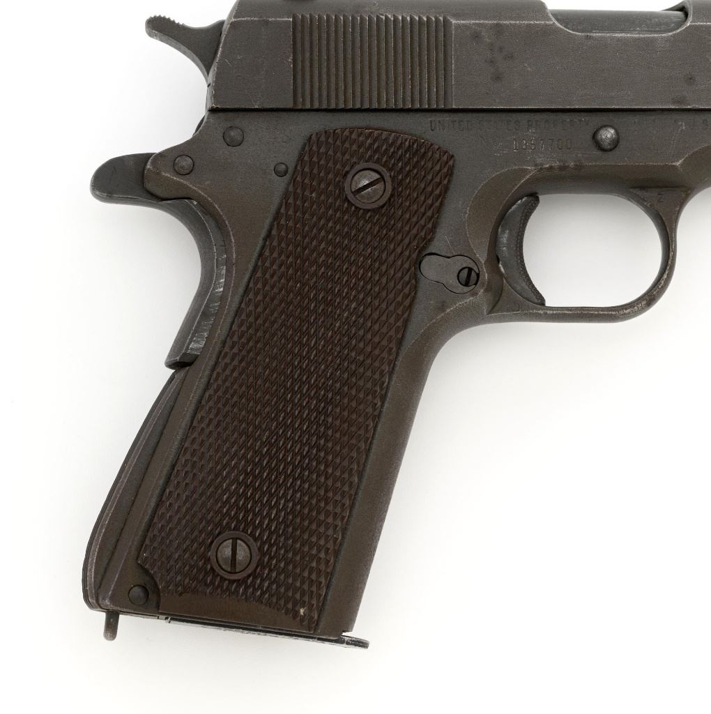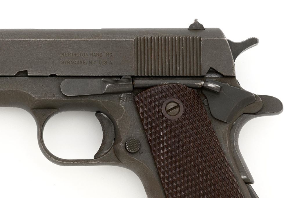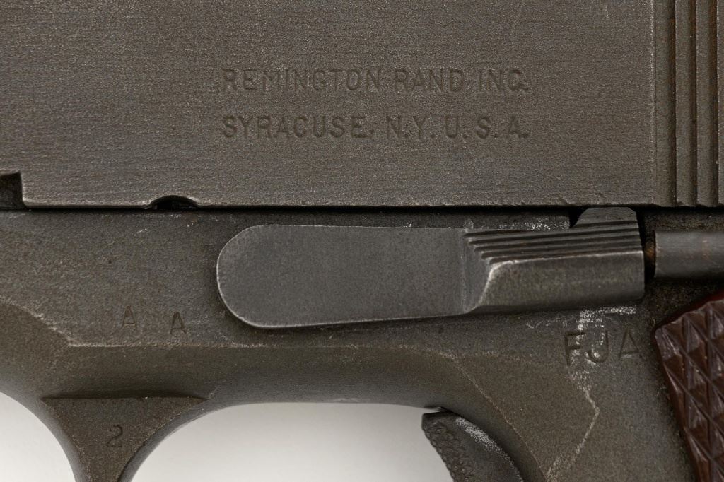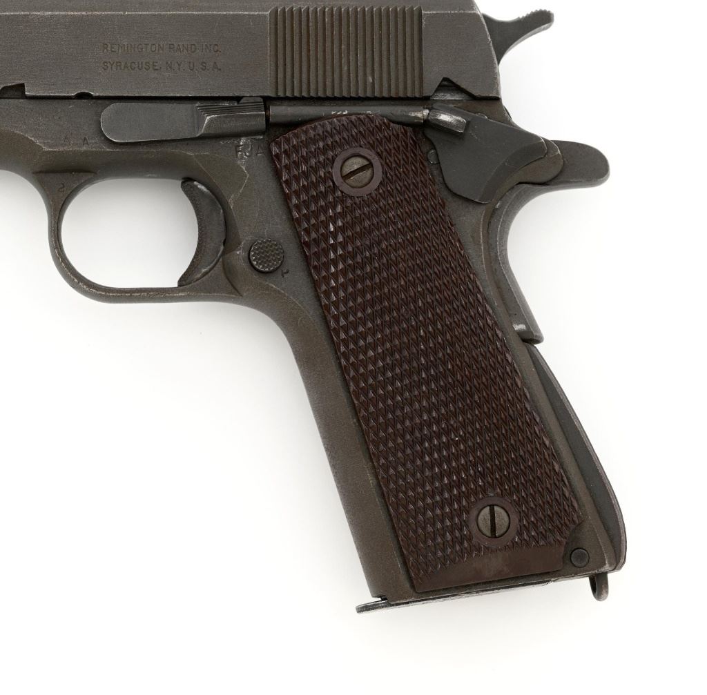 Remington-Rand Model 1911A1 U.S. Army Semi-Automatic Pistol, #1357700, .45 ACP cal., 5" barrel, parkerized finish, checkered plastic grips, with standard blade front sight and "U"-notched rear sight. Includes one circa-1970s magazine. Frame is marked "AA" (Augusta Arsenal rebuild), with "FJA" and "P" on the left side. Right side is marked "UNITED STATES PROPERTY" and "M 1911A1 U.S. ARMY". "(Crossed Cannons)" final inspection mark is at the rear. Slide is marked "REMINGTON RAND INC./SYRACUSE N.Y. U.S.A." on the left side, which is the third marking variation, and has a "P" on top. Parkerized barrel is marked "HS". Condition is very good overall, retaining approx. 75% arsenal re-parkerized finish, with scattered light rust spots on the right side of the slide, and light wear at the grip area. Grips are very good. Action works properly. Bore is excellent with sharp rifling. Est.: $1,200-$1,800. (C&R/PPT)