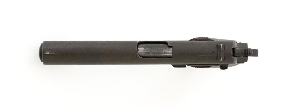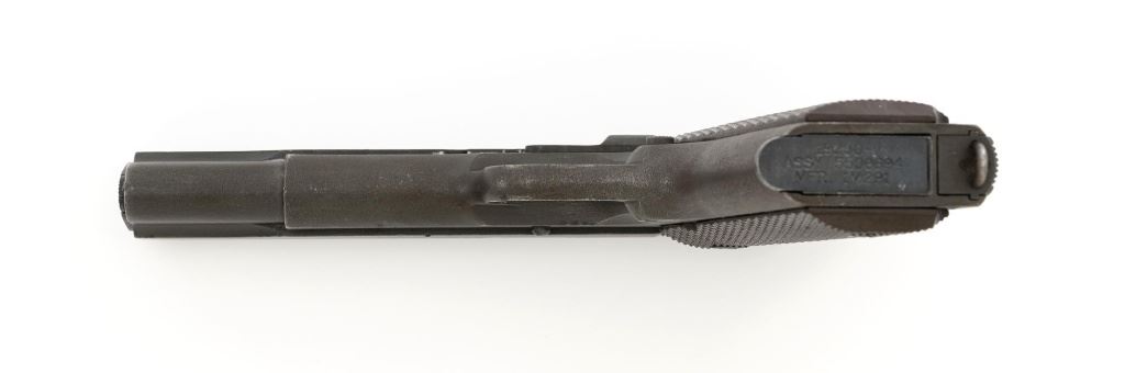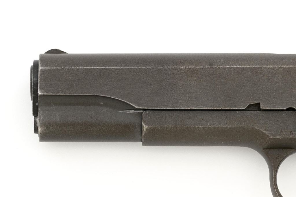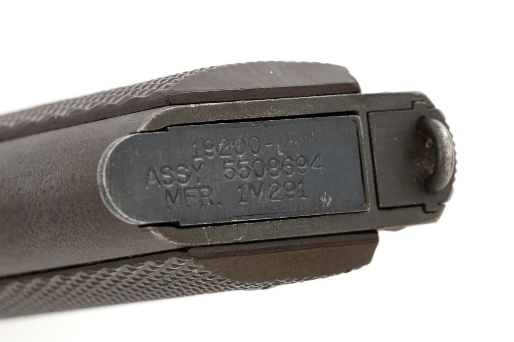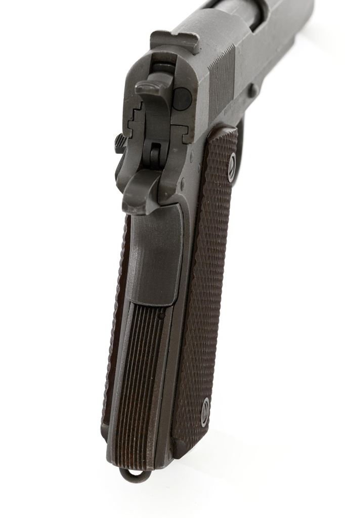 Remington-Rand Model 1911A1 U.S. Army Semi-Automatic Pistol, #1357700, .45 ACP cal., 5" barrel, parkerized finish, checkered plastic grips, with standard blade front sight and "U"-notched rear sight. Includes one circa-1970s magazine. Frame is marked "AA" (Augusta Arsenal rebuild), with "FJA" and "P" on the left side. Right side is marked "UNITED STATES PROPERTY" and "M 1911A1 U.S. ARMY". "(Crossed Cannons)" final inspection mark is at the rear. Slide is marked "REMINGTON RAND INC./SYRACUSE N.Y. U.S.A." on the left side, which is the third marking variation, and has a "P" on top. Parkerized barrel is marked "HS". Condition is very good overall, retaining approx. 75% arsenal re-parkerized finish, with scattered light rust spots on the right side of the slide, and light wear at the grip area. Grips are very good. Action works properly. Bore is excellent with sharp rifling. Est.: $1,200-$1,800. (C&R/PPT)