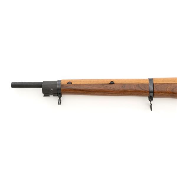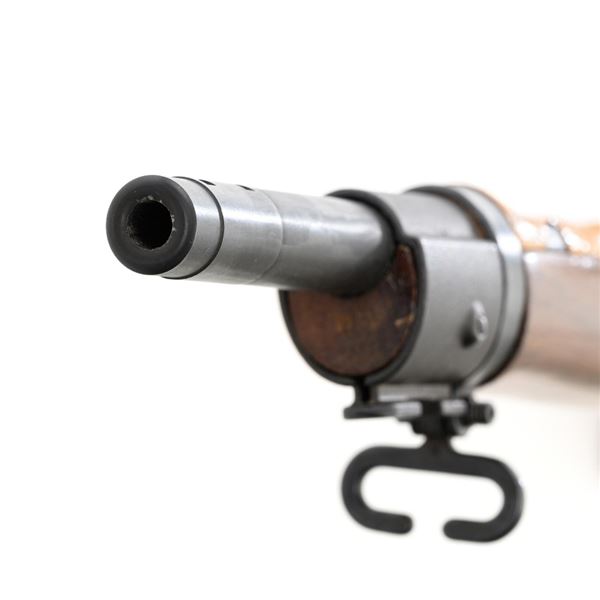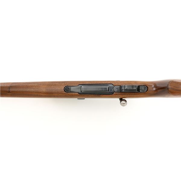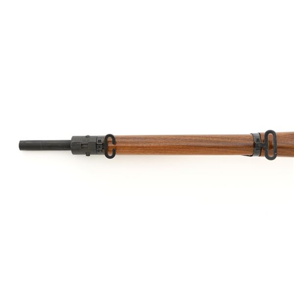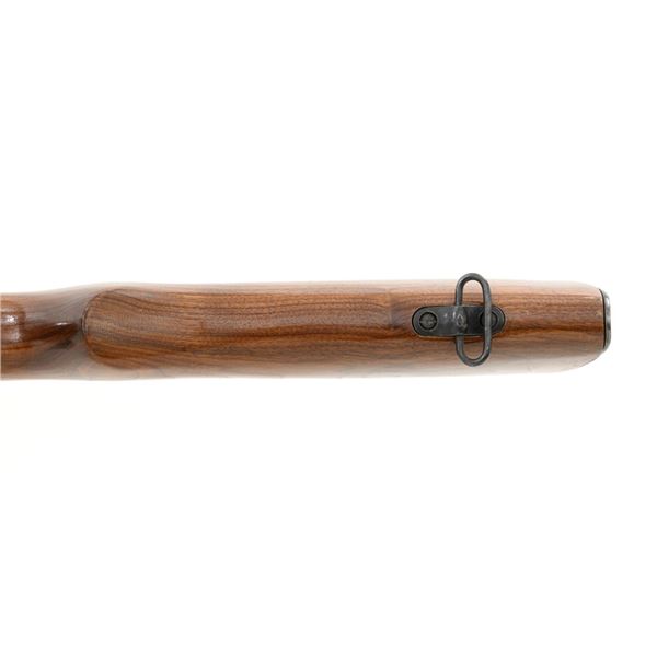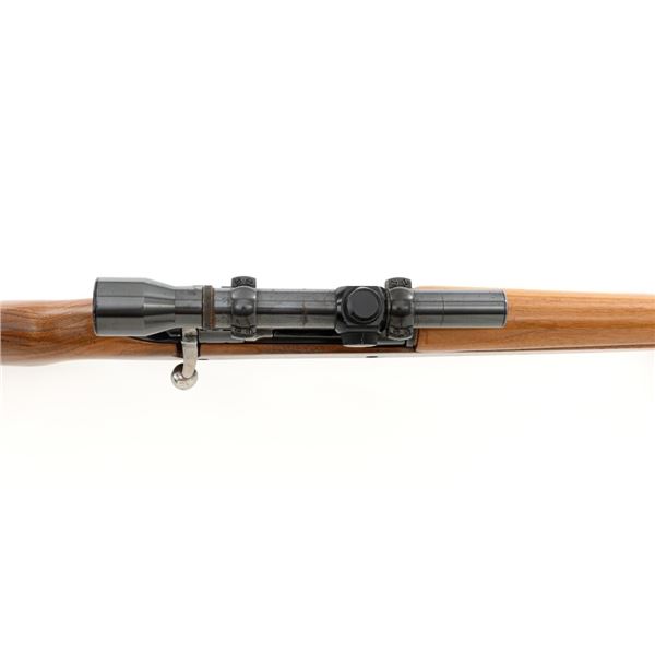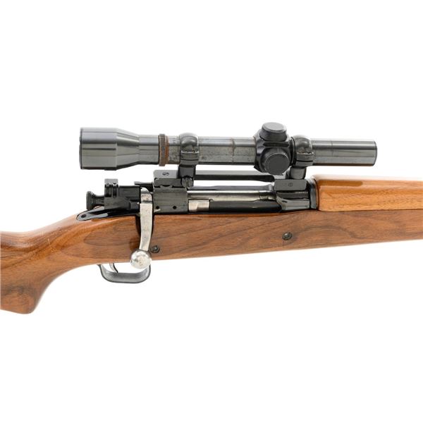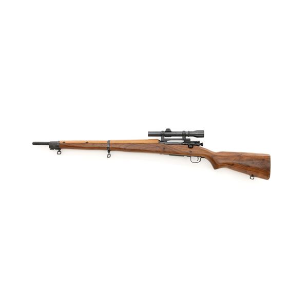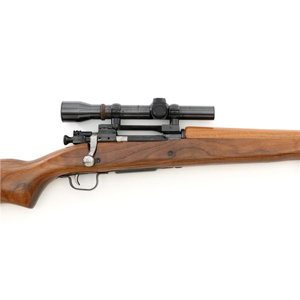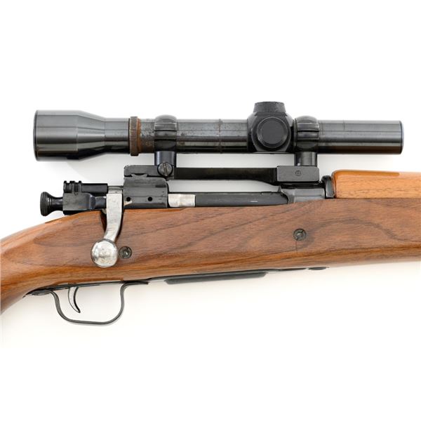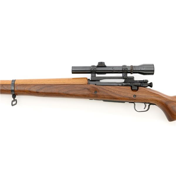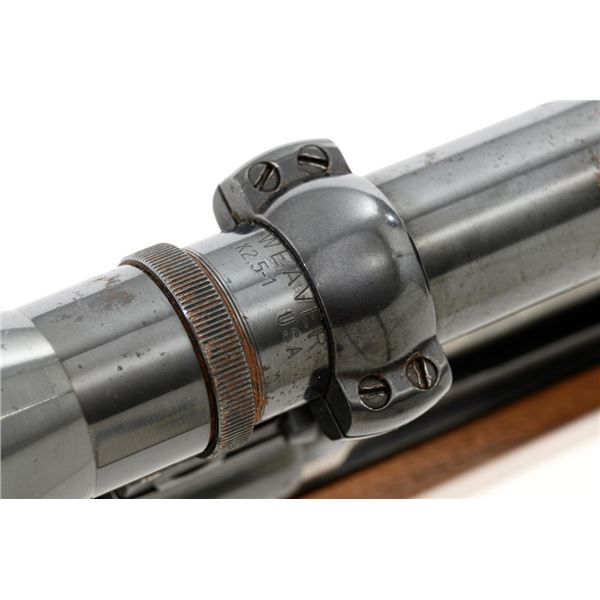U.S. Remington Arms Model 1903-A3 Bolt Action Rifle, #4115389, .30-06 cal., 24" barrel, blued finish, bright bolt body, walnut stock, no sights. Rifle was commercially made into a sniper rifle, blued, and topped with a Weaver K2.5-1 scope. Scope has a blue finish and fine crosshair reticle, with clear optics, and moderate rust behind the rear ring. Receiver marking is partially visible due to the scope mount. Barrel is unmarked. Rifle is in fine overall condition, retaining approx. 93%-95% reblued finish, with light high point wear. Unmarked stock is excellent with a tung oil finish, and a channel was added for the bent bolt. Buttplate door is a little loose when closed. Action works properly but the safety is hard to set. Bore is very good with sharp rifling. Est.: $800-$1,200. (C&R)