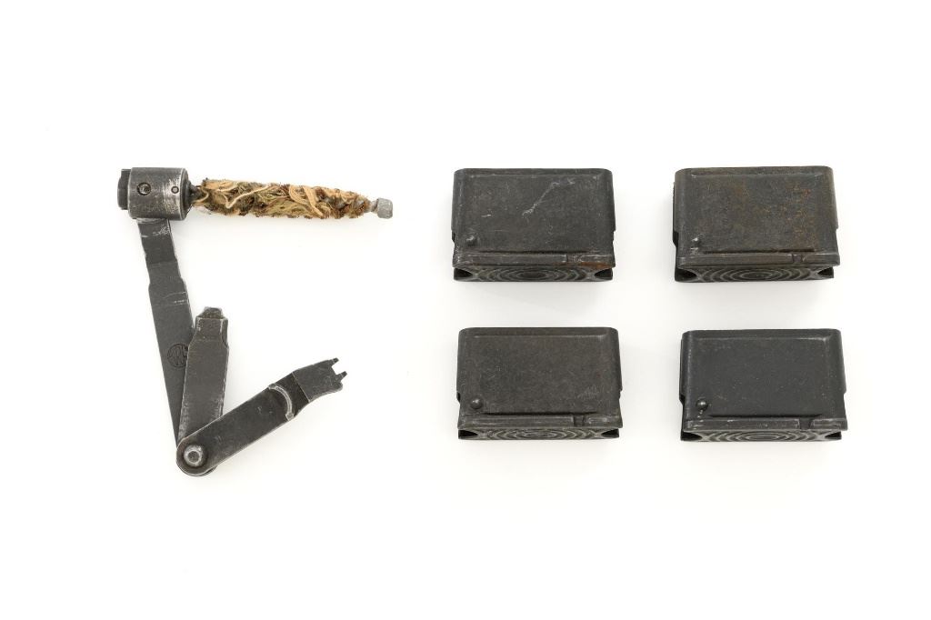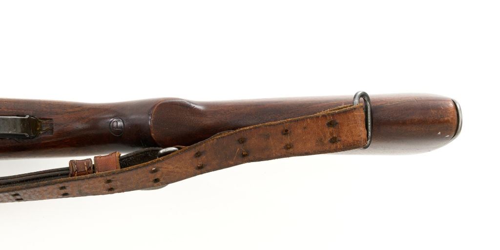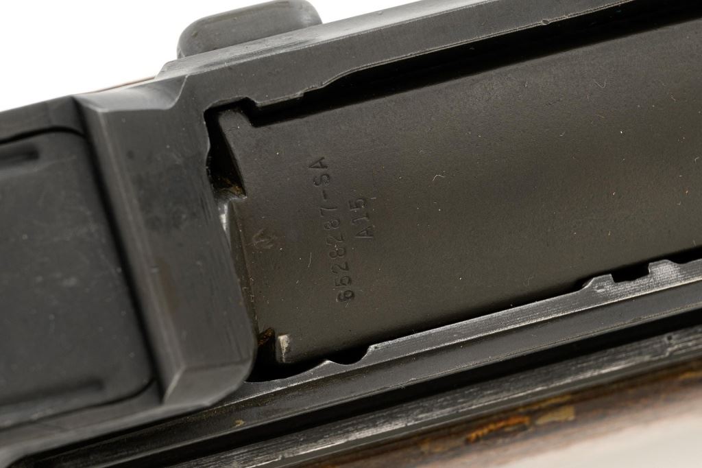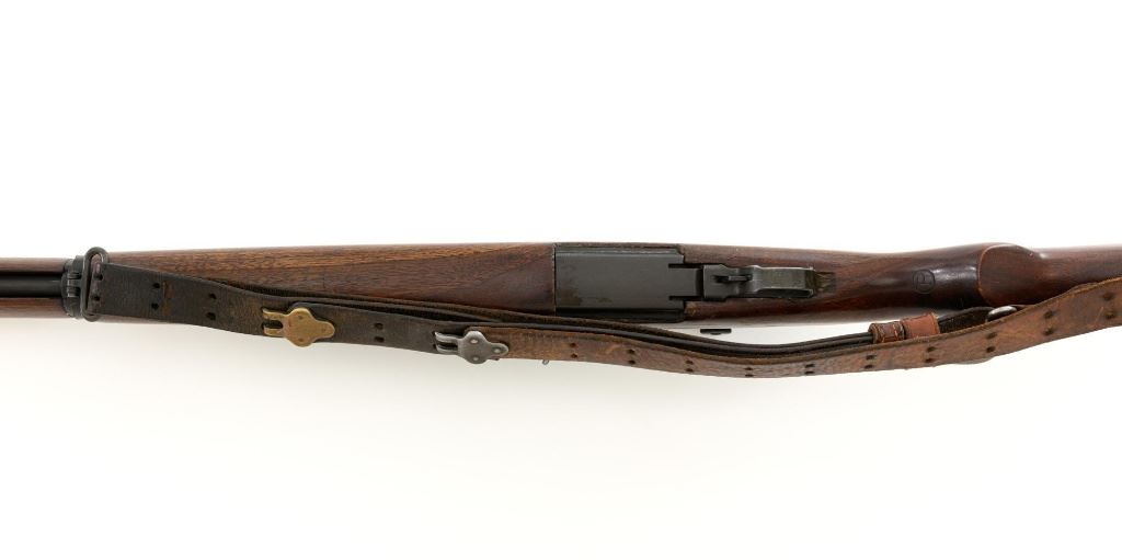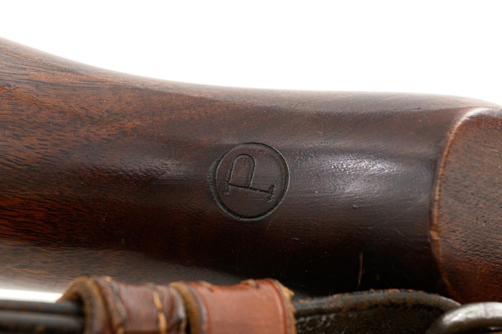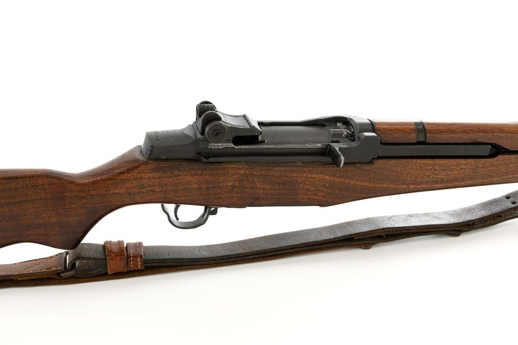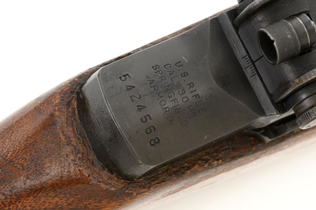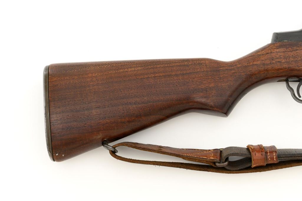 U.S. Springfield Armory National Match M1 Garand Semi-Automatic Rifle, #5424568, .30-06 cal., 24" barrel, parkerized finish, walnut stock, NM blade front sight with ears, and adjustable NM rear sight. Includes a M1907 leather sling, 4 en-bloc clips, and an M3-A1 tool. Receiver is marked "U.S. RIFLE/CAL. .30 M1/SPRINGFIELD/ARMORY/5424568". Barrel is marked "SA F6535446 11-54 A2160" under the op-rod with an engraved "NM" at the left front. Op-rod is NM and all parts are correct. No visible import marks. Rifle is in very good overall condition, showing range use and handling wear, retaining approx. 80% original parkerized finish, with wear on the receiver rails and buttplate. Stock has a boxed "(Defense Eagle)" on the left side and a circled "P" behind the trigger guard and has been revarnished, now in very good condition, with scattered scratches and handling marks, and the stock ferrule will not stay locked into the lower band. Action works properly. Bore shows wear and is good overall, with clear rifling; the erosion is 5.5 with a very good muzzle. Est.: $1,500-$1,800. (C&R)