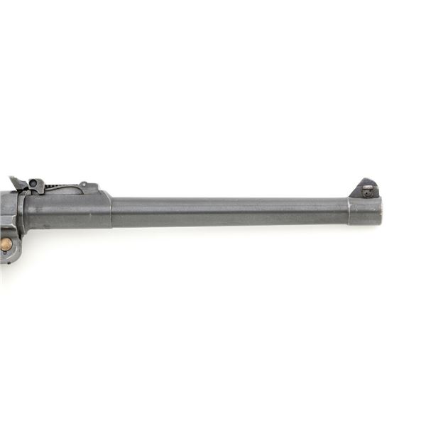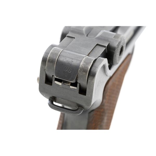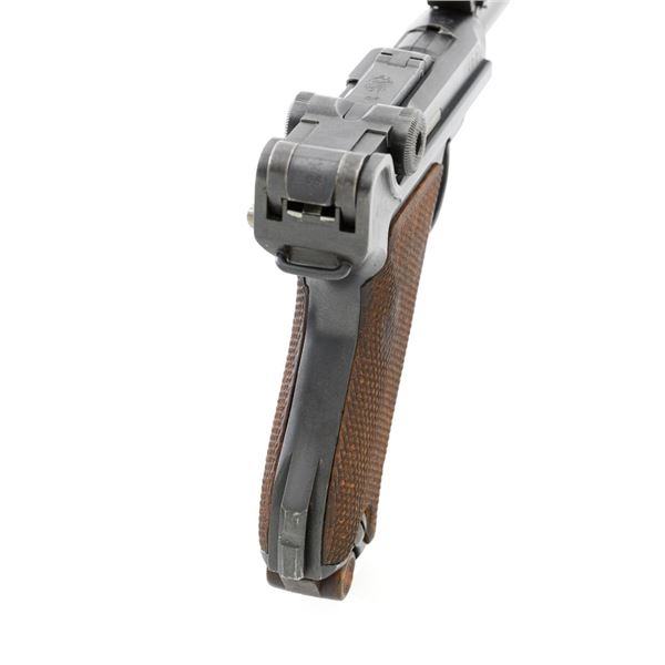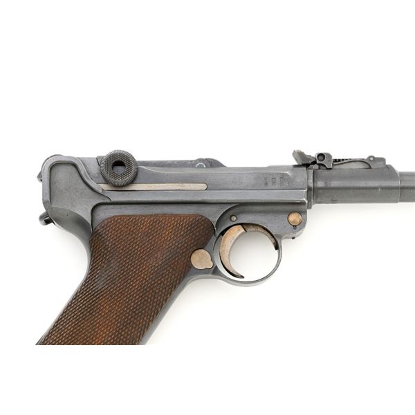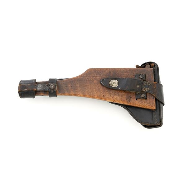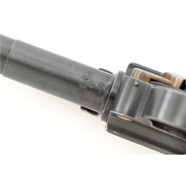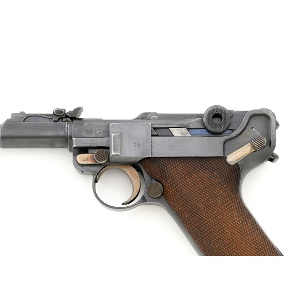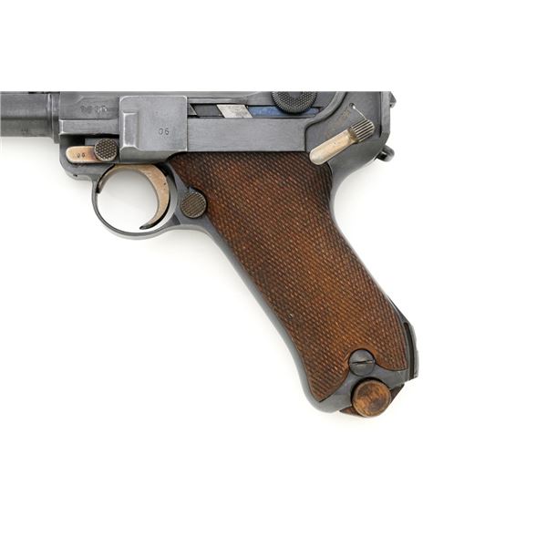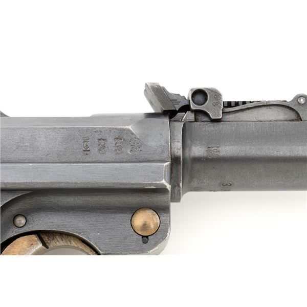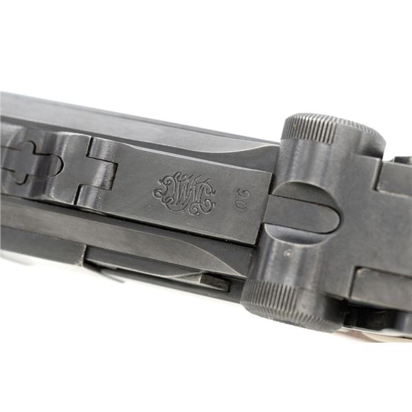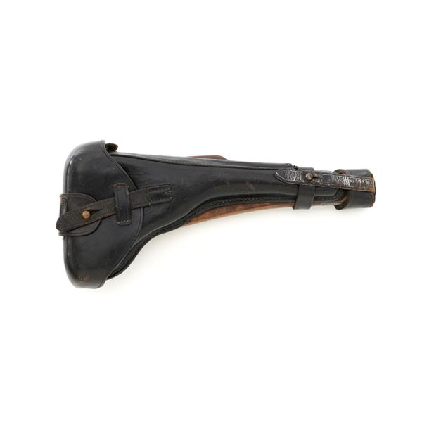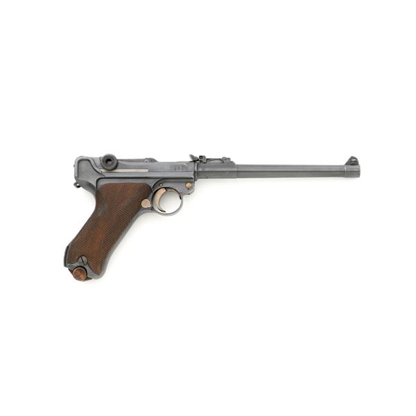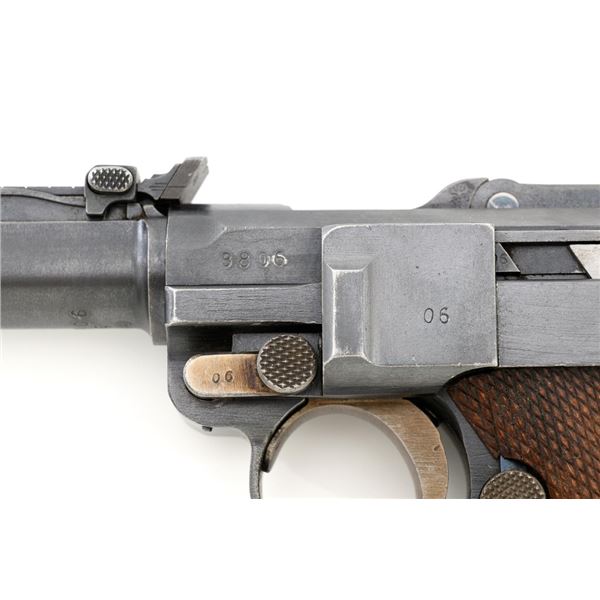 WWI 1917 Dated DWM Artillery Luger with Stock, Holster, and Tools, #3806c, 9mm cal., 8" barrel, blued finish, straw colored small parts, checkered walnut grips, inverted-"V" front sight, adjustable tangent rear sight with small "V"-notched groove, and stock lug. Includes one blued steel magazine with wood base; base is numbered and matching but in large font. Pistol is marked "DWM" on the toggle with "1917" date on the chamber. Right side of receiver with three "crowned" gothic letters and Imperial firing proof. Right side of rear sight base also with firing proof. All visible numbers matching, including the back of each grip. Includes non-matching wood stock, black leather holster, cleaning rod, and takedown tool. Stock is numbered "156f" and is in good condition, with scattered dents and scratches. One of the leather straps attached to the stock has a nickel plated "Lift This Side" snap. Black leather holster has an illegible makers stamp on inside of the flap over "Berlin/191?" and the name "F.C. Foss" scratched into the surface. Inside of the body with Bekleidungsamt des Armeekorps "B.A. III" stamp. Holster is also in good condition, showing honest age and wear, with moderate cracking and creasing to the leather, stitching is not frayed or loose. Pistol is in fine condition overall, retaining approx. 93% original blue, with expected light handling marks. Edge wear accounts for much of the finish loss. Approx. 80%-85% straw colors are present on the small parts. Grips show moderate age and wear, especially on the right panel, which has some darkening and flattening of the checkering detail. Action and hold open function properly. Bore rates near excellent overall and is bright throughout with well-defined rifling. Magazine body shows moderate rub wear, small dents, and scratches to the base. Est.: $1,800-2,400. (C&R/PPT)
