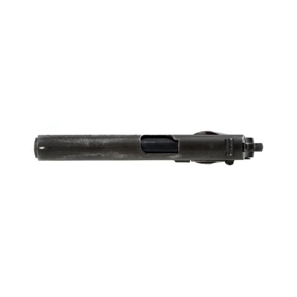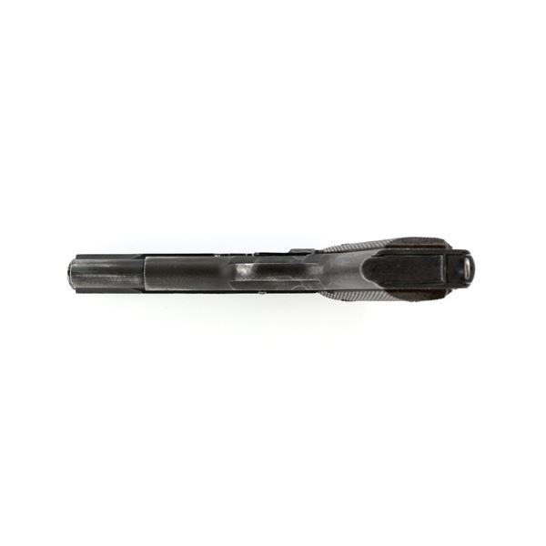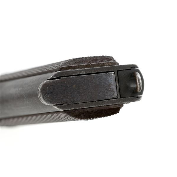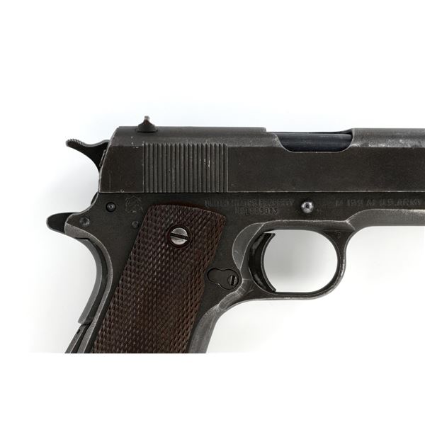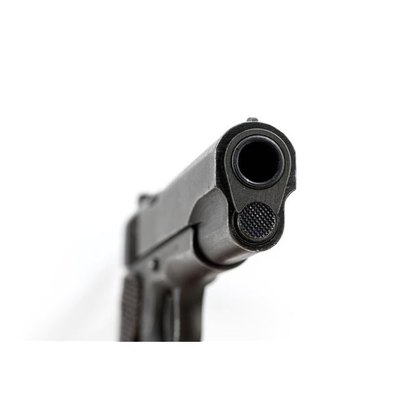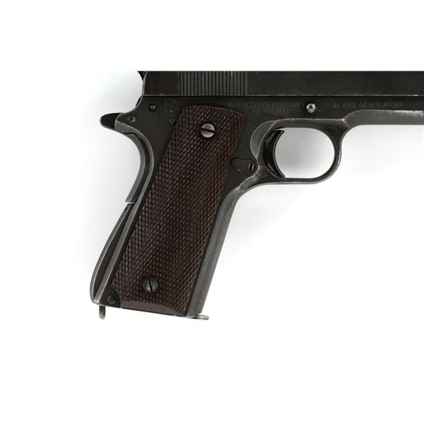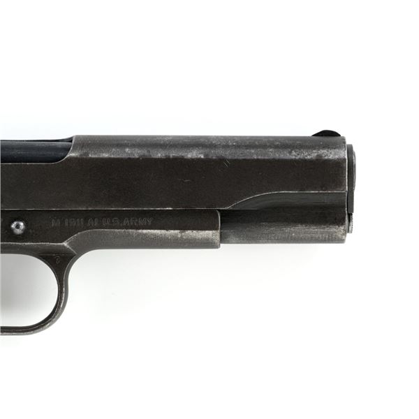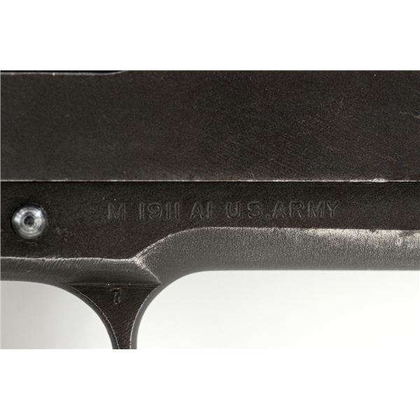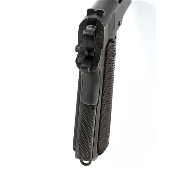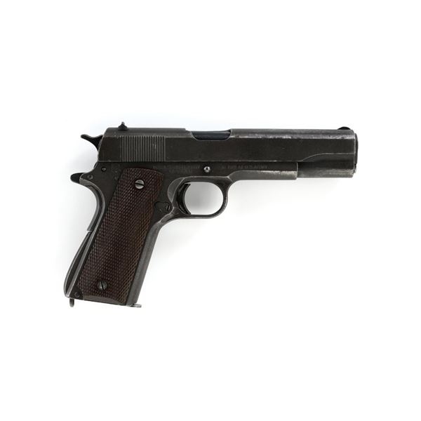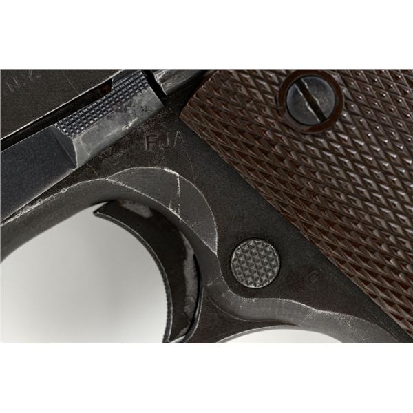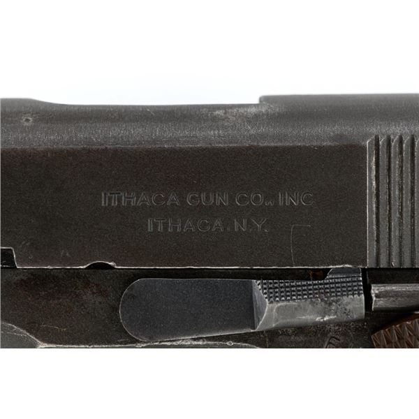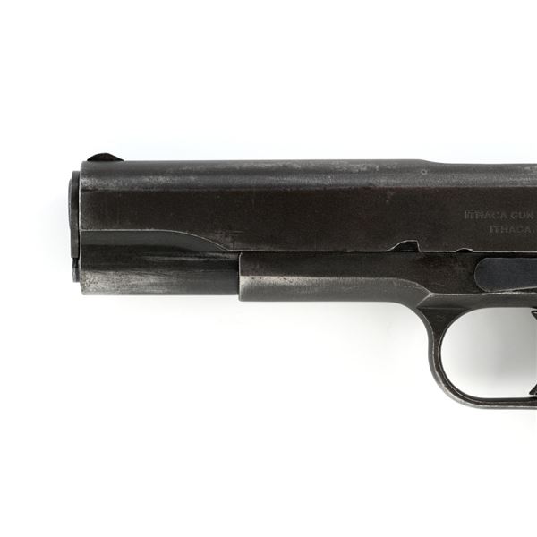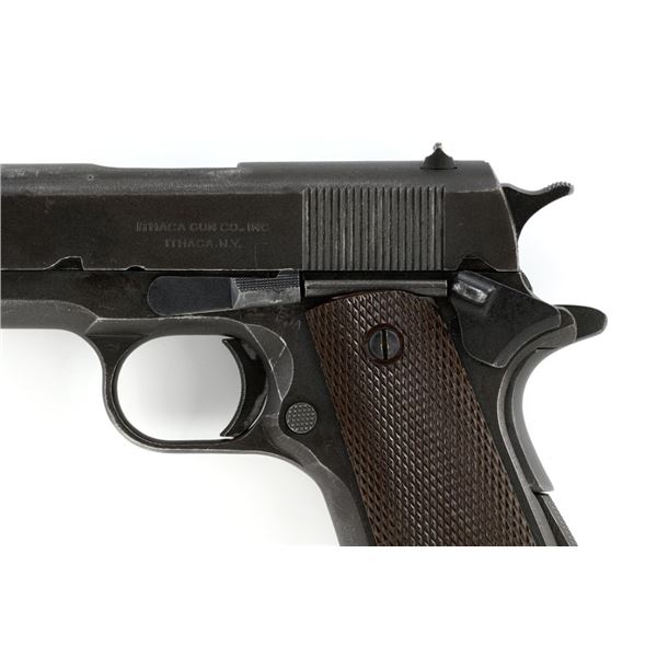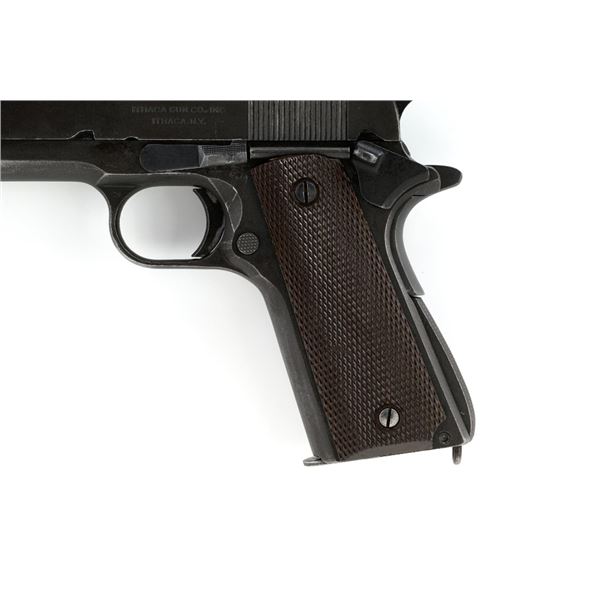 Ithaca Model 1911A1 U.S. Army Semi-Automatic Pistol, #1889389, .45 ACP cal., 5" barrel, parkerized finish, checkered plastic grips, with standard blade front sight and "U"-notched rear sight. Includes one WWII "L" marked magazine. Mfg'd 1944. Frame is marked "FJA" (Frank J. Atwood) inspection mark and "P" on the left side. "UNITED STATES PROPERTY" and "M 1911 A1 U.S. ARMY" on the right side. "(Crossed Cannons)" final inspection mark is at the rear. Slide is marked "ITHACA GUN CO. INC./Ithaca N.Y." on the left side, with a "P" on top. Blued Springfield barrel is marked "S P". Pistol is in very good overall condition, retaining approx. 80% thinning and toning parkerized finish, with wear on the grip area and high points. Displaying intermittent small spots of freckled patina. Factory lettering is clear. Grips are good, showing moderate wear. Slide works properly, but the slide stop plunger, plunger spring, and safety catch plunger are missing. Bore is excellent with sharp rifling. Est.: $1,200-$1,800. (C&R/PPT)