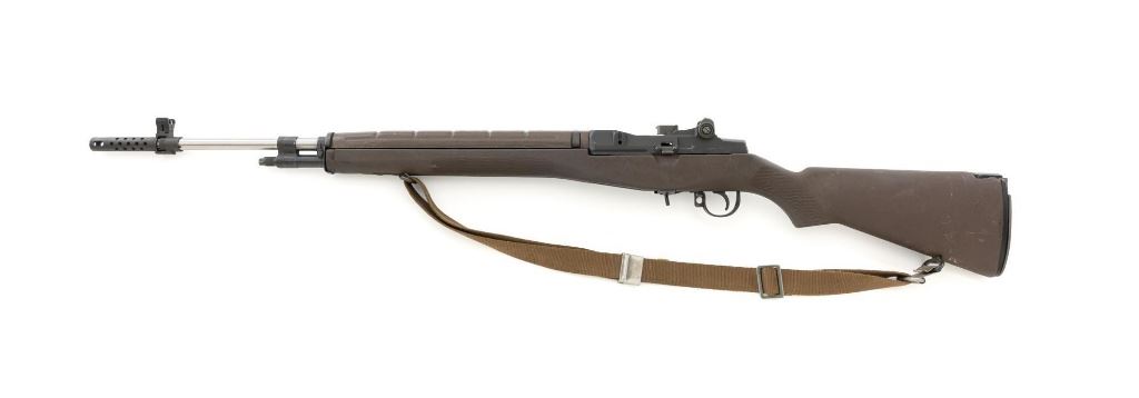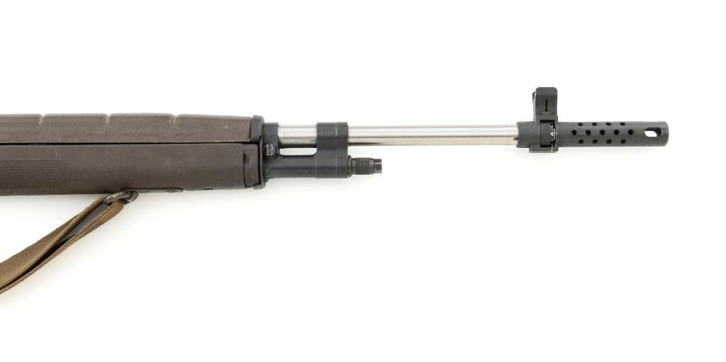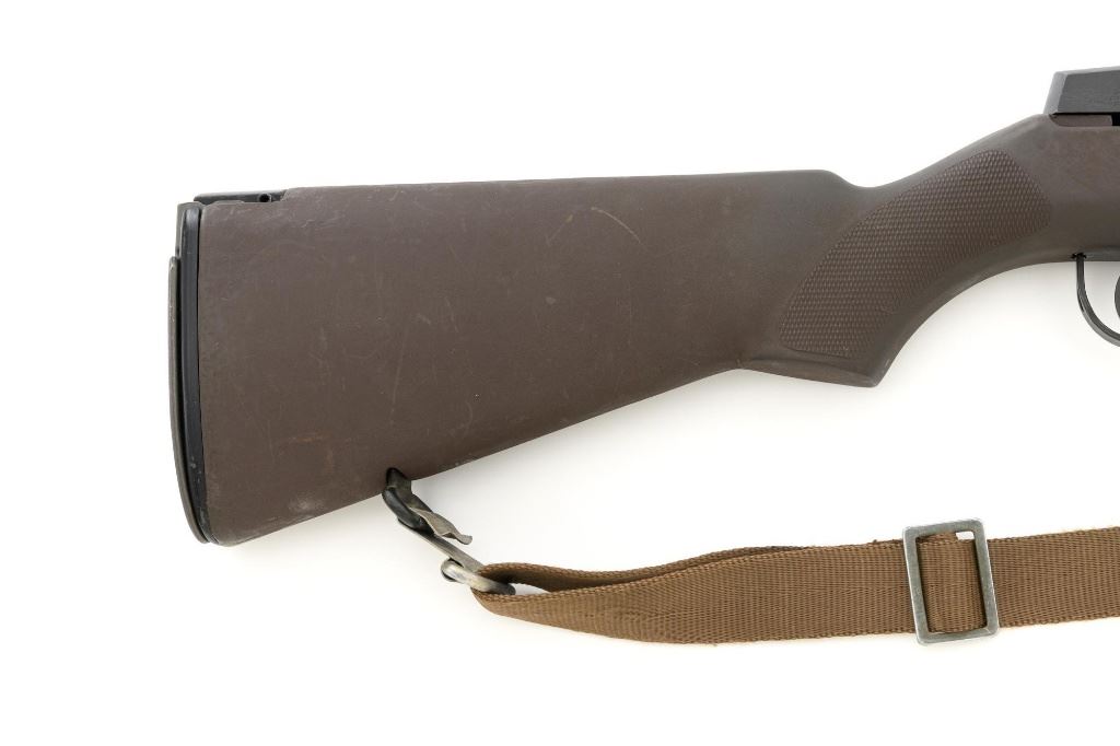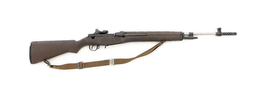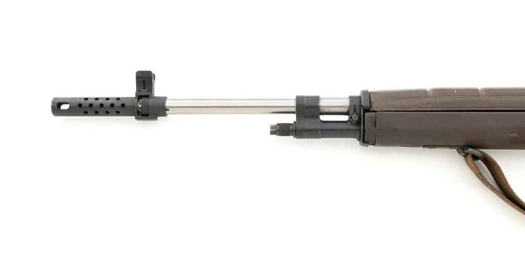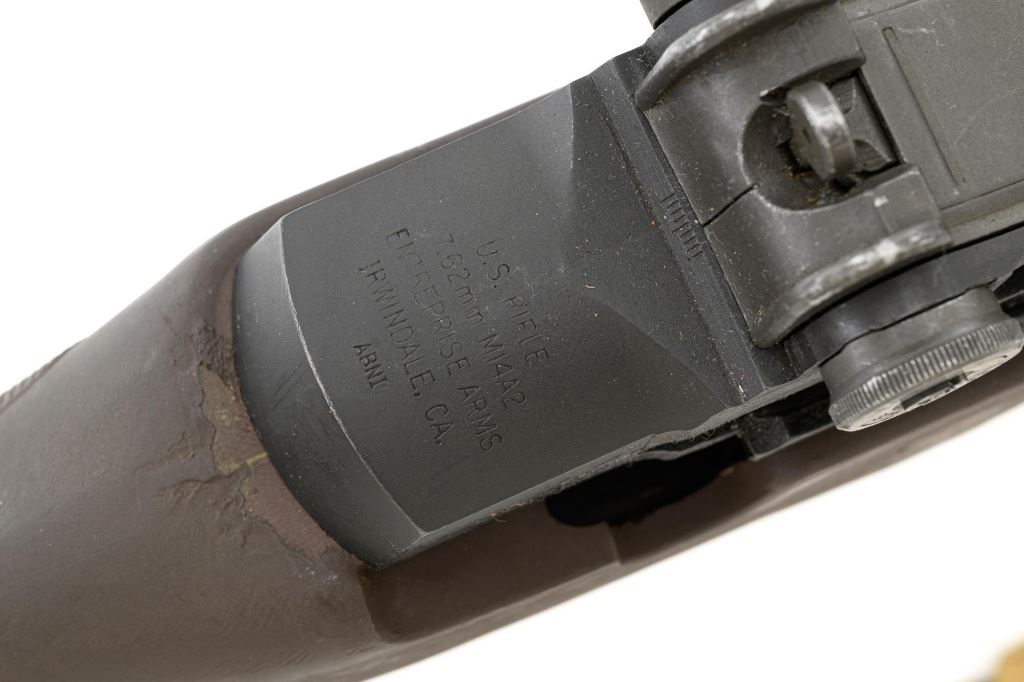 Enterprise Arms U.S. Rifle Model M14A2 Semi-Automatic Rifle, #E-00475, 7.62x51 NATO cal., 22" stainless steel barrel with muzzle brake, black oxide finish on the receiver, checkered composition two-piece pistol grip stock with sling swivels and an OD green nylon rifle sling, no magazine, protected blade front sight, and adjustable rear aperture sight. Marked "ABNI" on the receiver for ABN Industrial, Buena Park, CA. ABNI was a subcontractor for Enterprise. Enterprise Arms of Irwindale, CA mfgd approx. 2,000 receivers from 1996-97. Rifle is in fine overall condition, with a bright stainless steel barrel and the receiver displaying considerable factory finish with scrapes and edge wear. Stock is in very good condition, with numerous scrapes and scuffs consistent with use. Buttstock ends with a checkered steel flip-up shoulder support, providing a 13.25" LOP. Action functions well. Bore is bright with defined rifling. Est.: $800-$1,200. (Modern)