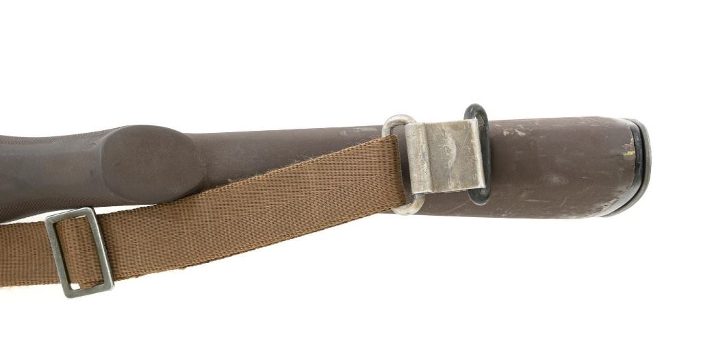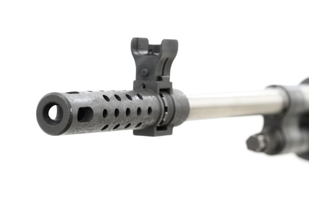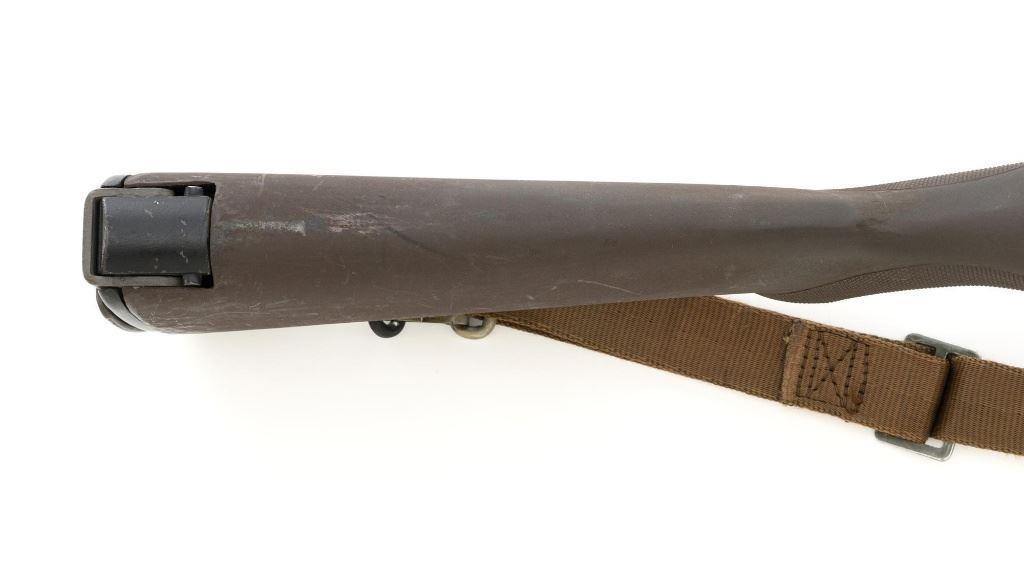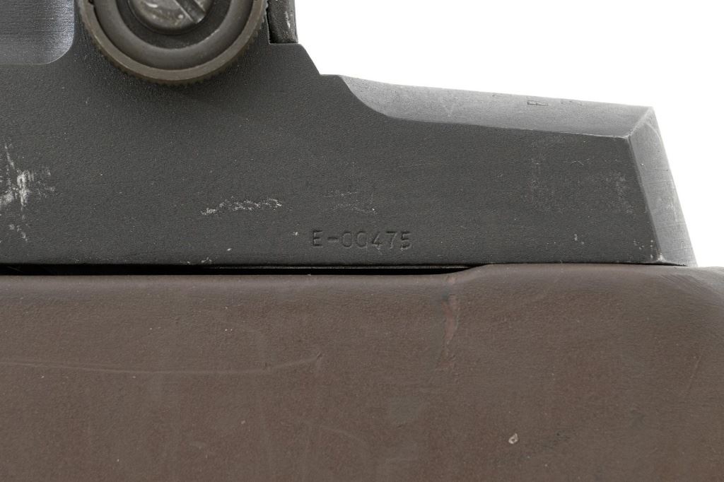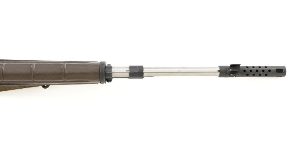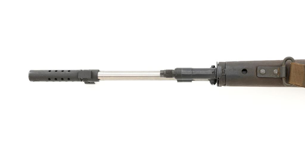 Enterprise Arms U.S. Rifle Model M14A2 Semi-Automatic Rifle, #E-00475, 7.62x51 NATO cal., 22" stainless steel barrel with muzzle brake, black oxide finish on the receiver, checkered composition two-piece pistol grip stock with sling swivels and an OD green nylon rifle sling, no magazine, protected blade front sight, and adjustable rear aperture sight. Marked "ABNI" on the receiver for ABN Industrial, Buena Park, CA. ABNI was a subcontractor for Enterprise. Enterprise Arms of Irwindale, CA mfgd approx. 2,000 receivers from 1996-97. Rifle is in fine overall condition, with a bright stainless steel barrel and the receiver displaying considerable factory finish with scrapes and edge wear. Stock is in very good condition, with numerous scrapes and scuffs consistent with use. Buttstock ends with a checkered steel flip-up shoulder support, providing a 13.25" LOP. Action functions well. Bore is bright with defined rifling. Est.: $800-$1,200. (Modern)