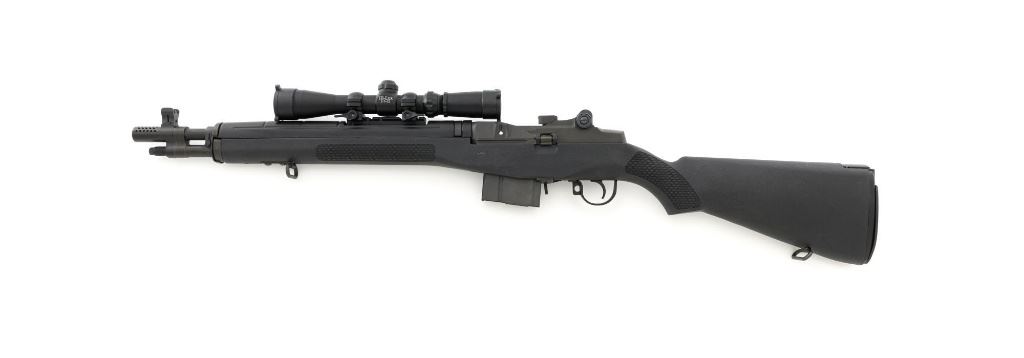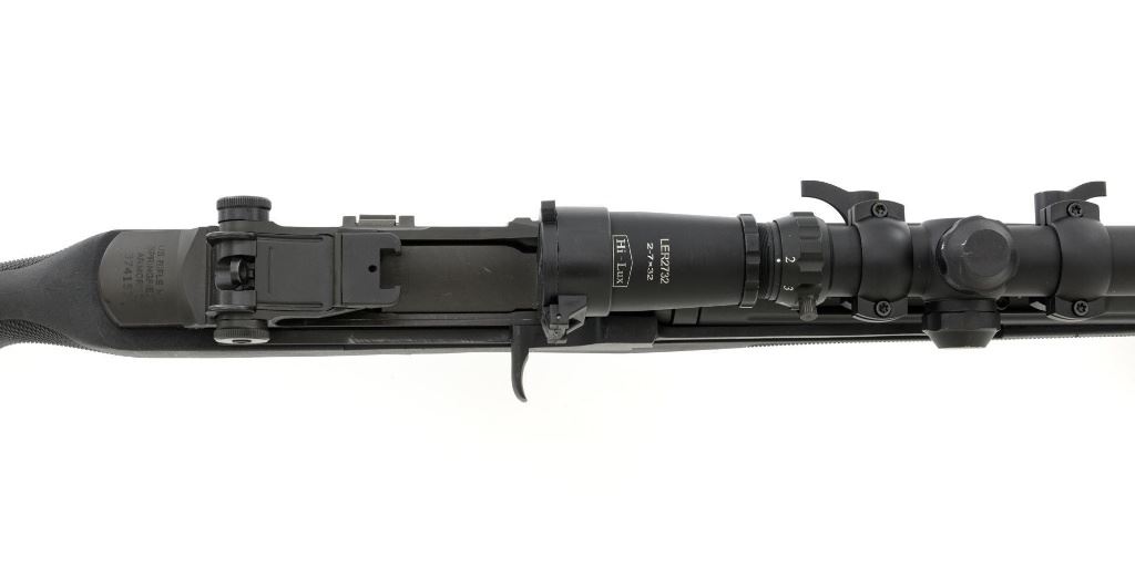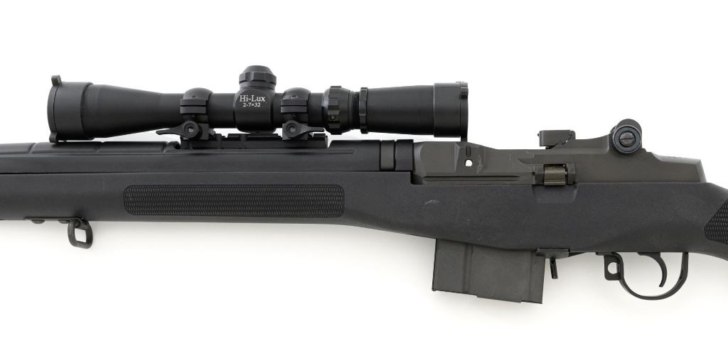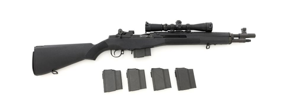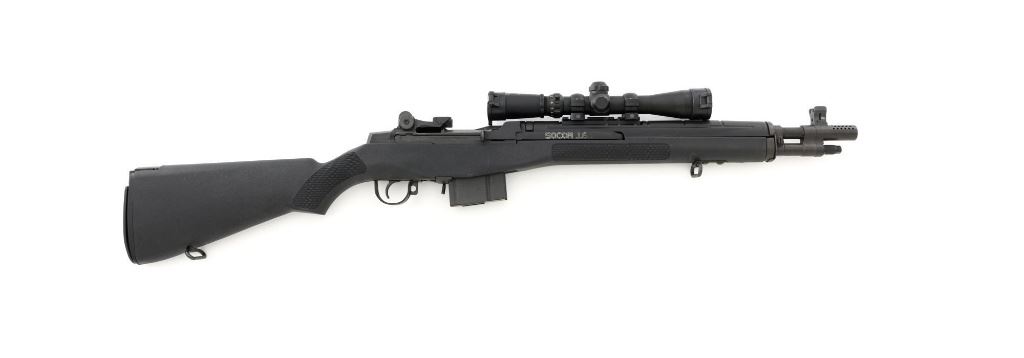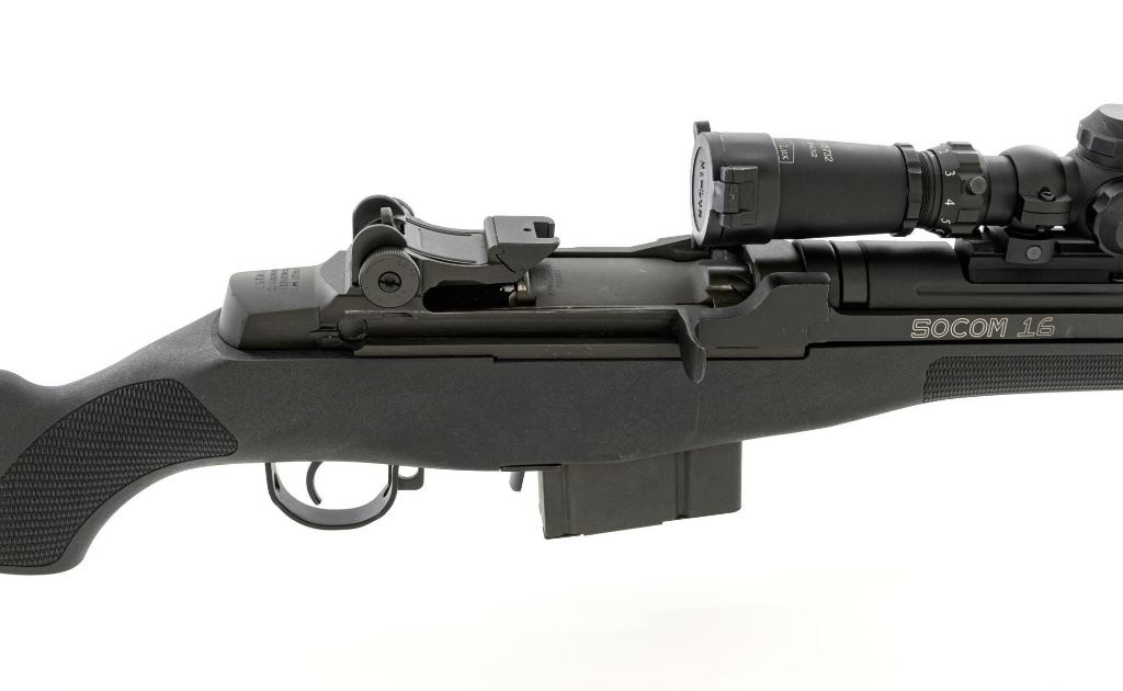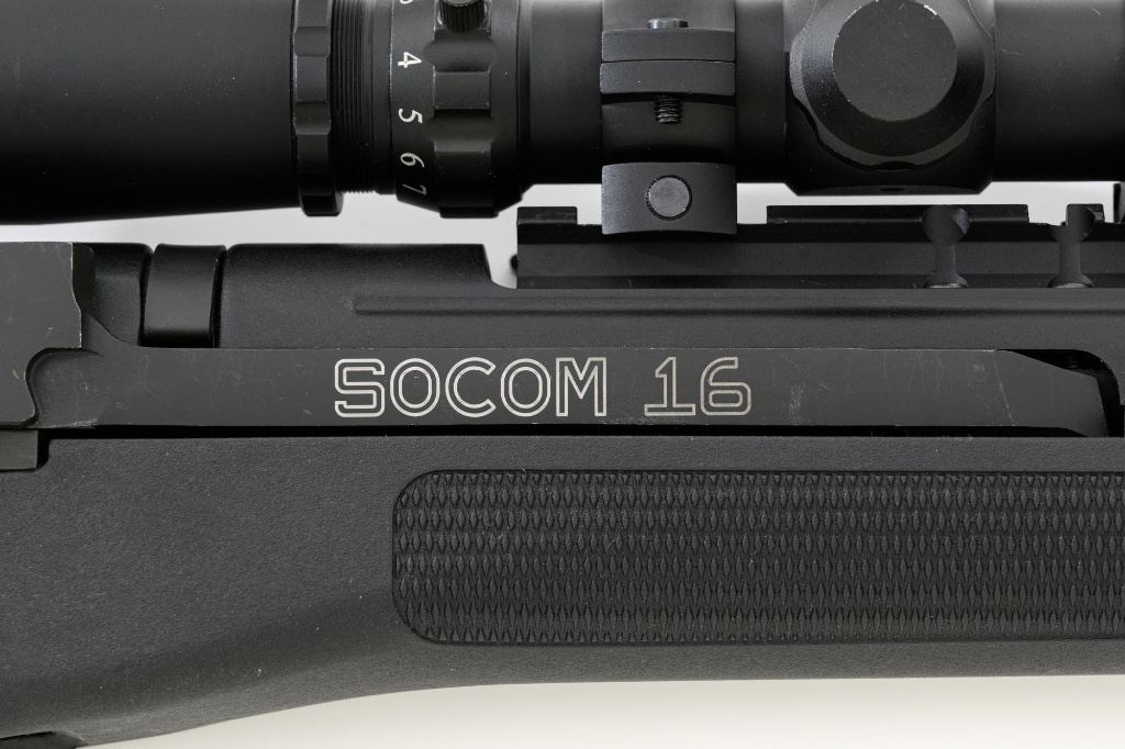 Springfield Armory M1A Socom 16 Semi-Automatic Rifle, #374157, .308 Win. cal., 16" barrel with attached muzzle brake, with matte blue finish. Textured synthetic pistol grip stock with sling swivels, ending with a flip-up checkered blue steel buttplate, providing a 13.25" LOP. Sights include a protected Trijicon H3 15 front and adjustable aperture rear. Includes two (2) detachable 10-round box magazines. Rifle is topped with a Picatinny style rail, QD rings, and a Hi-Lux 2-7x32mm scope, finished in matte black, with a duplex reticle, and includes a set of flip-up lens covers. Scope is in near excellent condition with clear, bright optics. Rifle is in excellent overall condition, retaining approx. 98%-99% factory finish, with light intermittent light handling marks to the metal and stock. Action is crisp. Bore is bright with excellent rifling. Est.: $1,000-$1,500. (Modern)