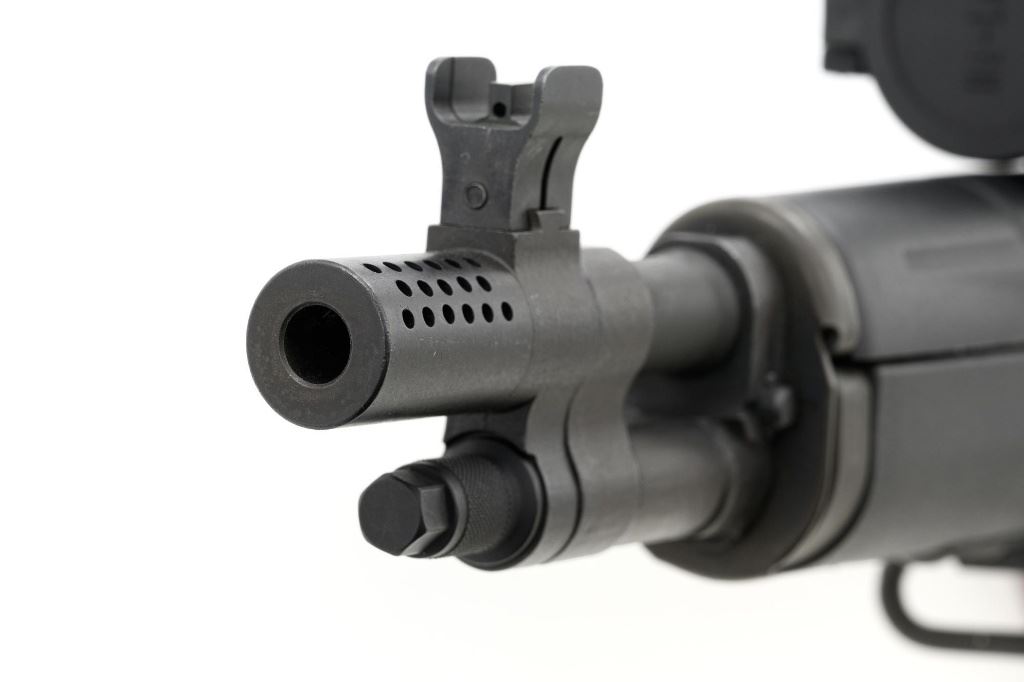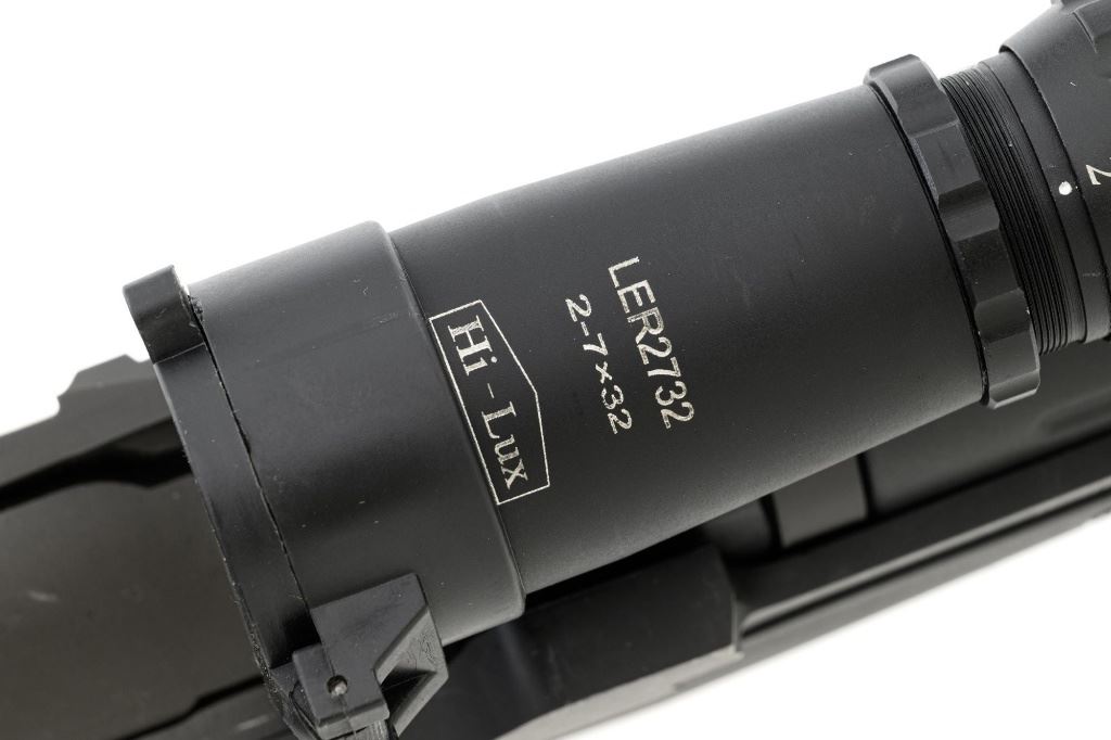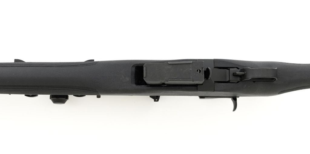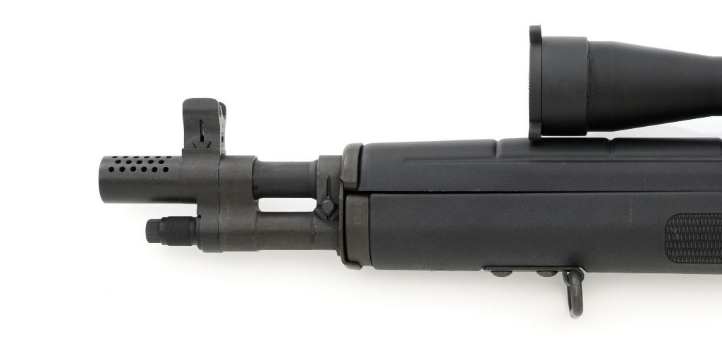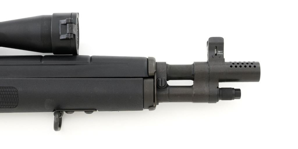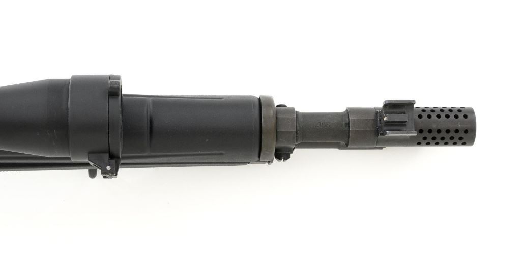 Springfield Armory M1A Socom 16 Semi-Automatic Rifle, #374157, .308 Win. cal., 16" barrel with attached muzzle brake, with matte blue finish. Textured synthetic pistol grip stock with sling swivels, ending with a flip-up checkered blue steel buttplate, providing a 13.25" LOP. Sights include a protected Trijicon H3 15 front and adjustable aperture rear. Includes two (2) detachable 10-round box magazines. Rifle is topped with a Picatinny style rail, QD rings, and a Hi-Lux 2-7x32mm scope, finished in matte black, with a duplex reticle, and includes a set of flip-up lens covers. Scope is in near excellent condition with clear, bright optics. Rifle is in excellent overall condition, retaining approx. 98%-99% factory finish, with light intermittent light handling marks to the metal and stock. Action is crisp. Bore is bright with excellent rifling. Est.: $1,000-$1,500. (Modern)