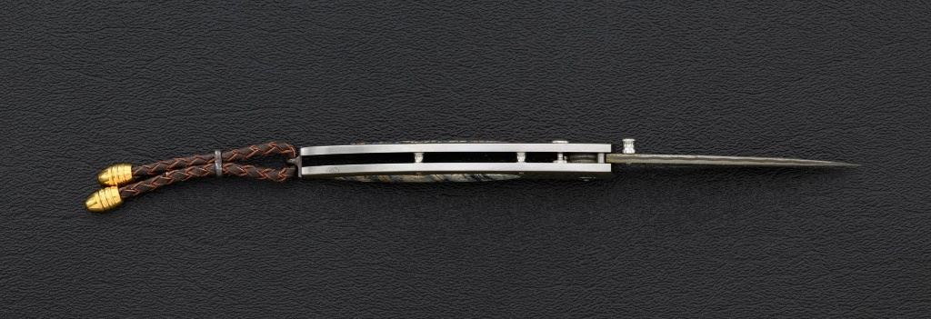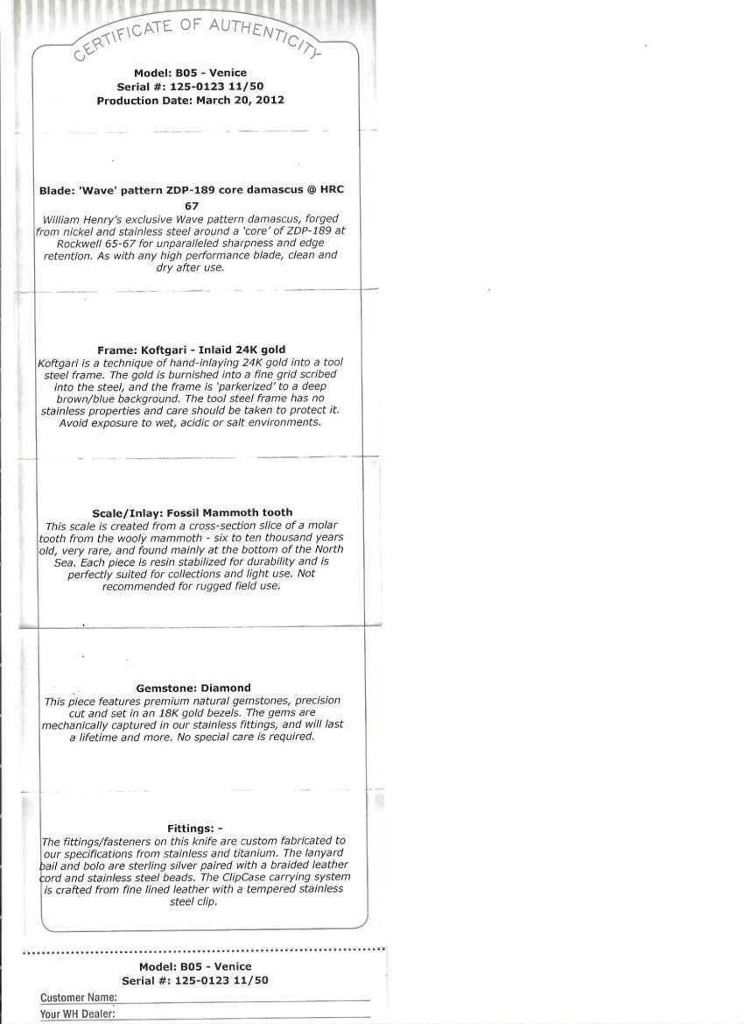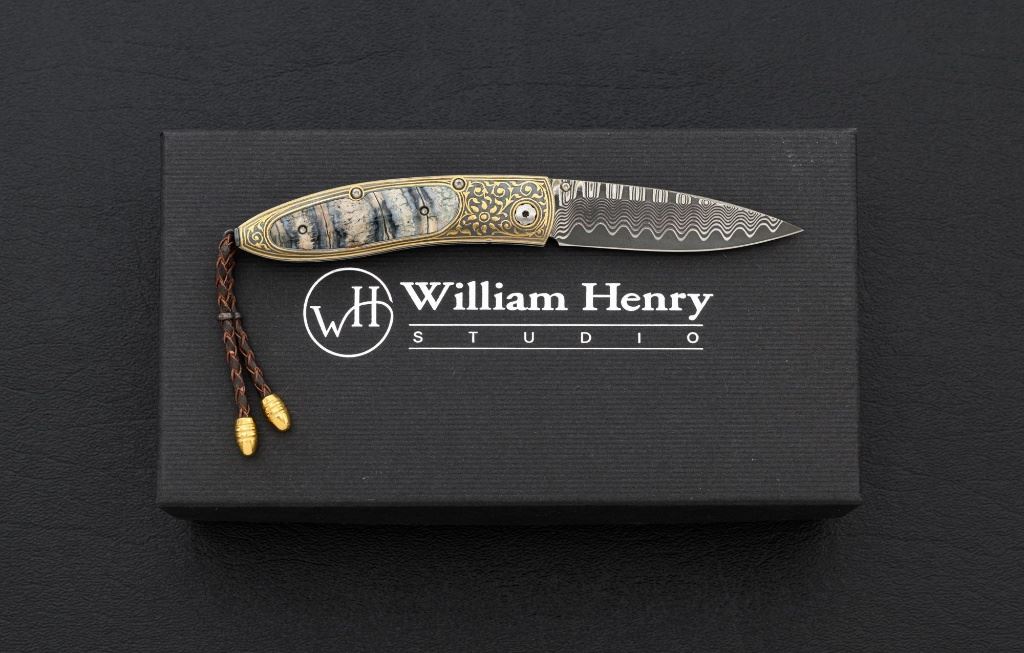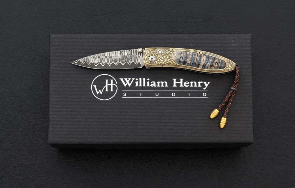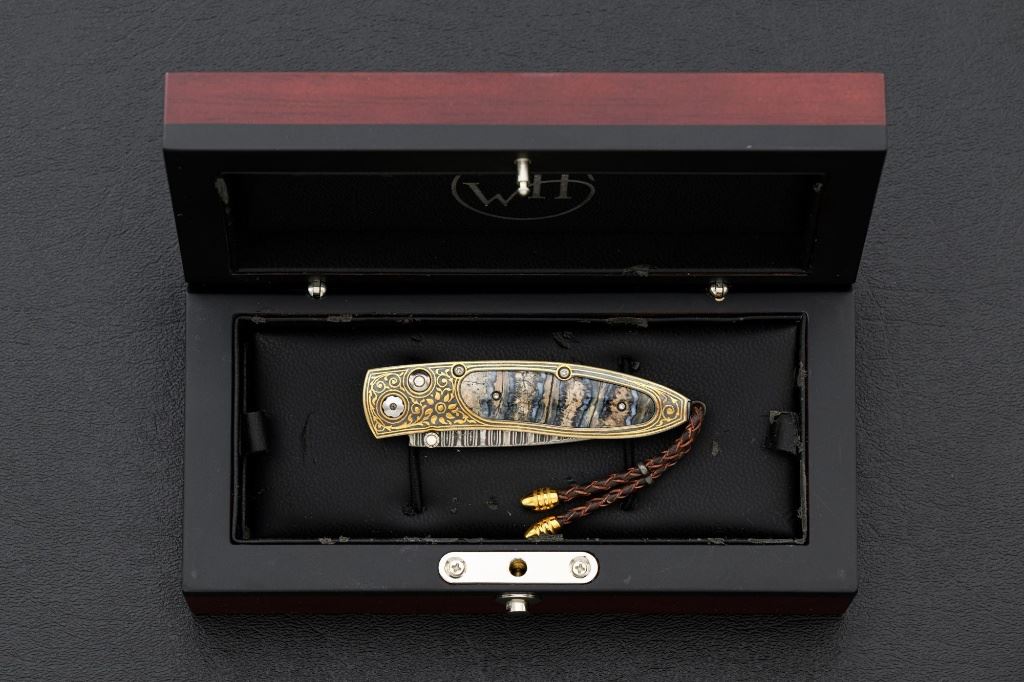 One of 50 William Henry Model B05 Venice Button Lock Folding Knife, 2.6" "Wave" patten damascus blade, 3.25" overall closed length, diamond inlaid thumb stud and button, 24K gold koftgari frame, resin stabilized fossil mammoth tooth scales, stainless and titanium fittings, braided leather lanyard with sterling silver beads. Numbered 11/50 on front edge of the frame. Includes the original black WH box, wood presentation box, brown leather WH clipcase, and matching numbered Certificate of Authenticity. Manufactured March 20, 2012. Knife is in new condition. Exterior of the boxes are in excellent condition. The removeable interior panel of the wood presentation box is damaged and has several scuffs and scratches. Est.: $900-$1,200.