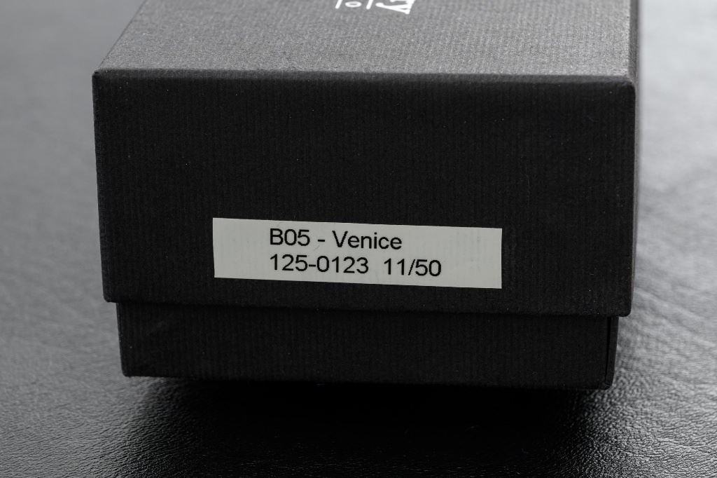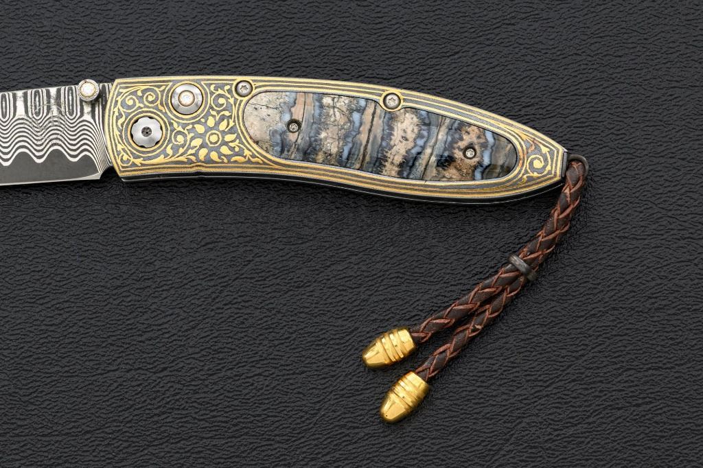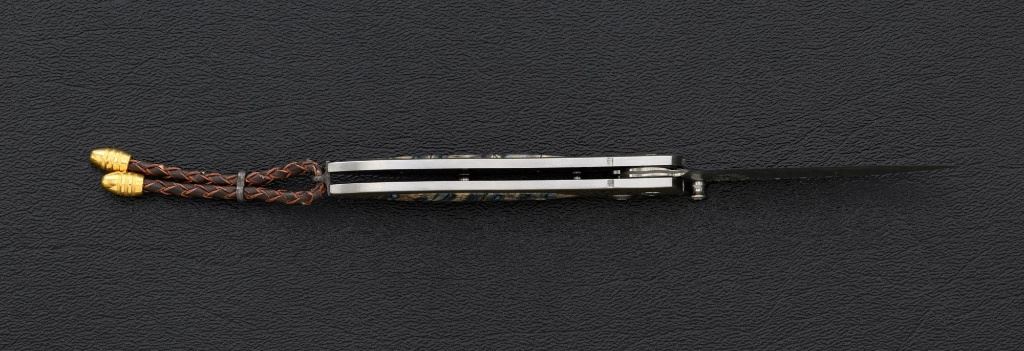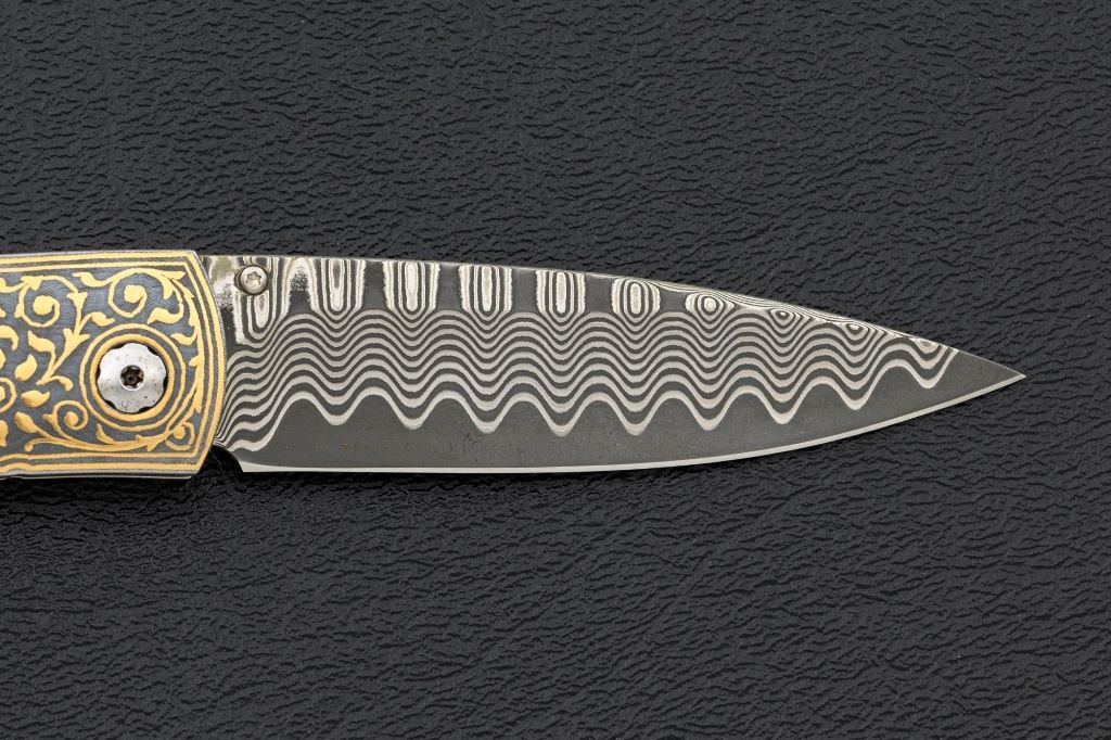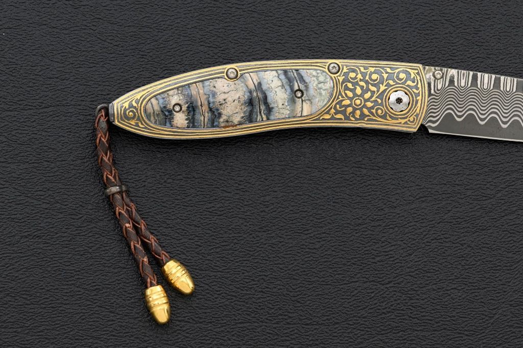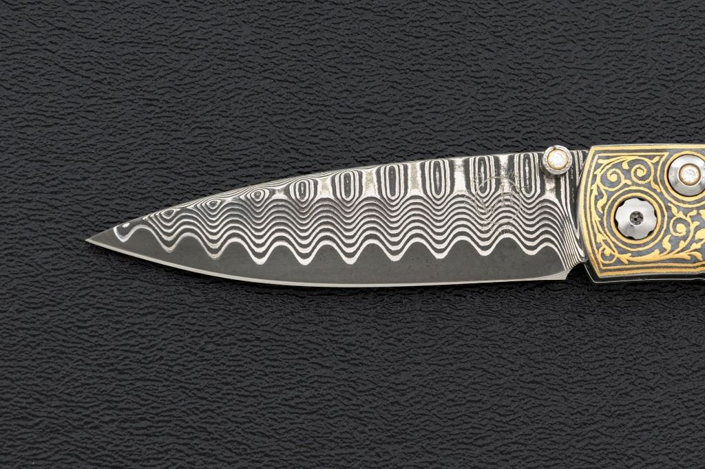 One of 50 William Henry Model B05 Venice Button Lock Folding Knife, 2.6" "Wave" patten damascus blade, 3.25" overall closed length, diamond inlaid thumb stud and button, 24K gold koftgari frame, resin stabilized fossil mammoth tooth scales, stainless and titanium fittings, braided leather lanyard with sterling silver beads. Numbered 11/50 on front edge of the frame. Includes the original black WH box, wood presentation box, brown leather WH clipcase, and matching numbered Certificate of Authenticity. Manufactured March 20, 2012. Knife is in new condition. Exterior of the boxes are in excellent condition. The removeable interior panel of the wood presentation box is damaged and has several scuffs and scratches. Est.: $900-$1,200.