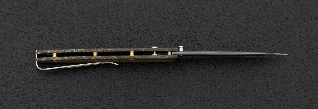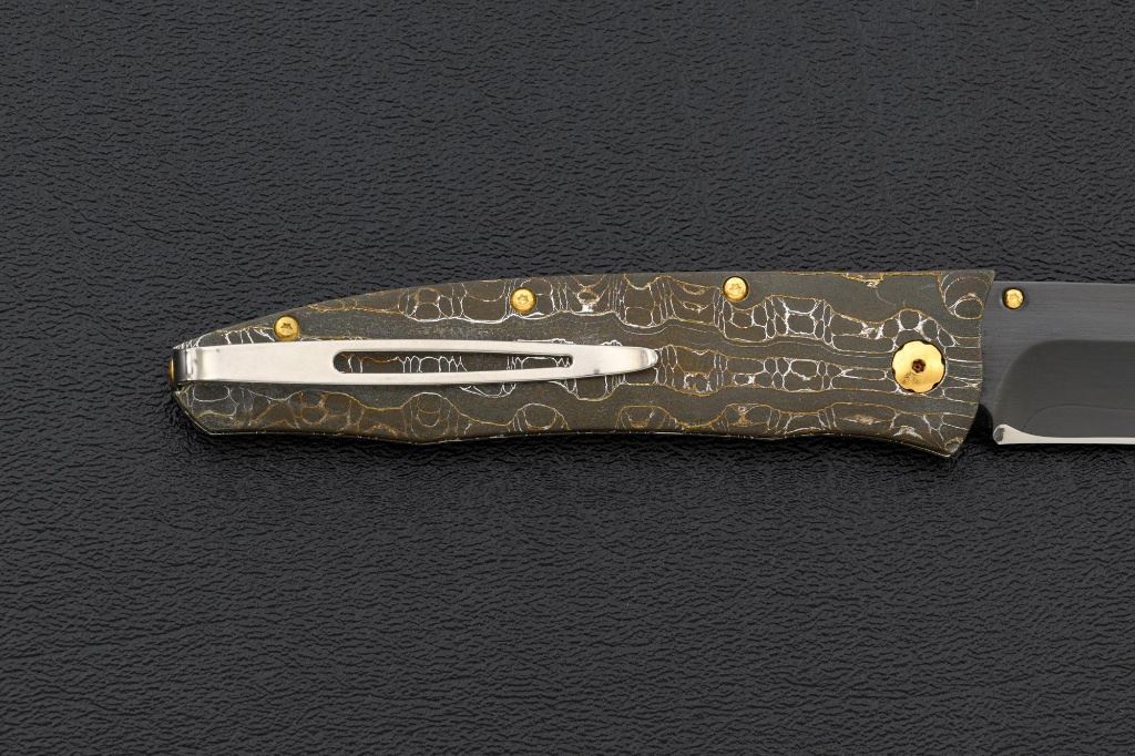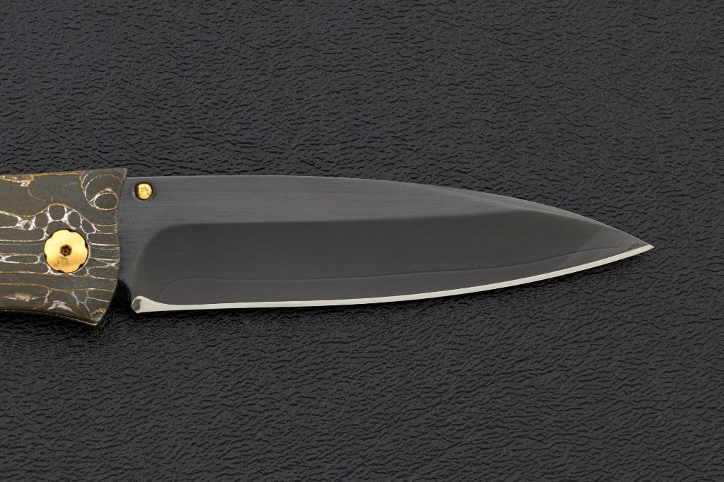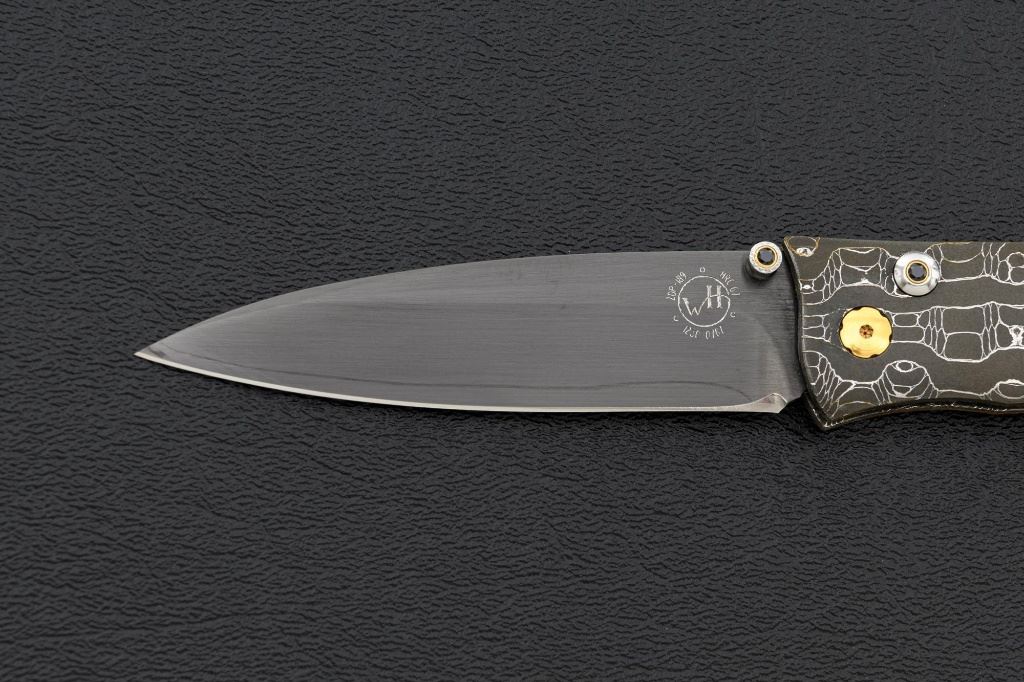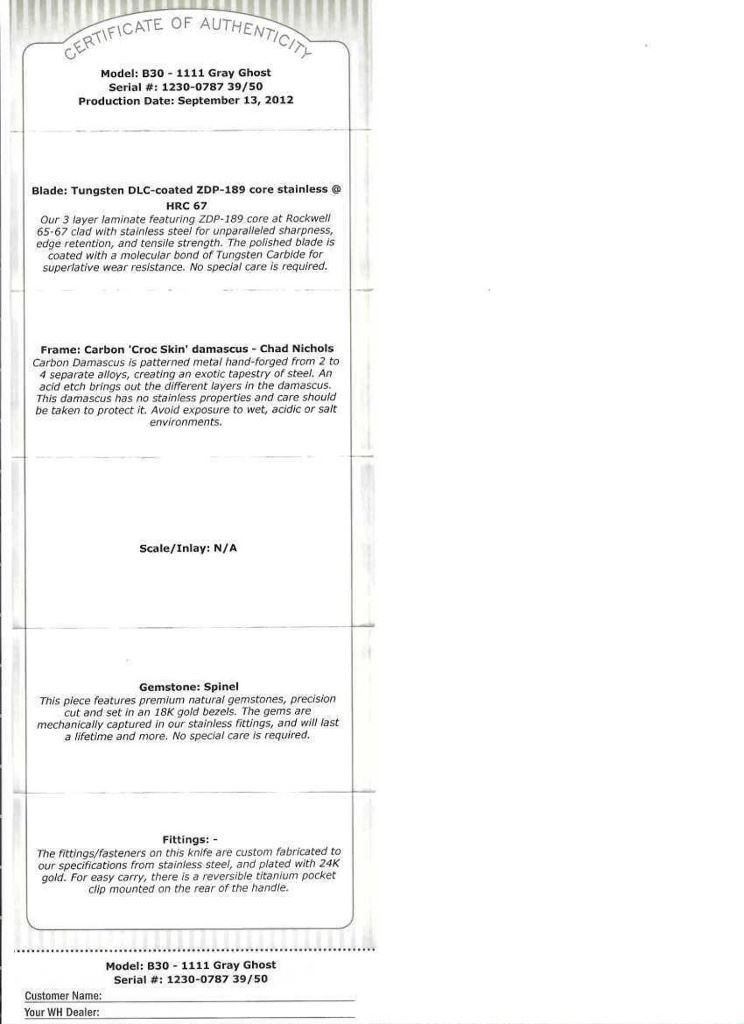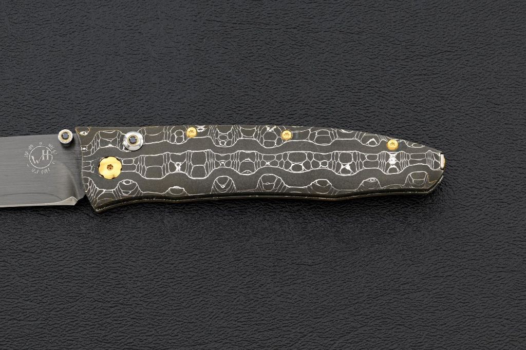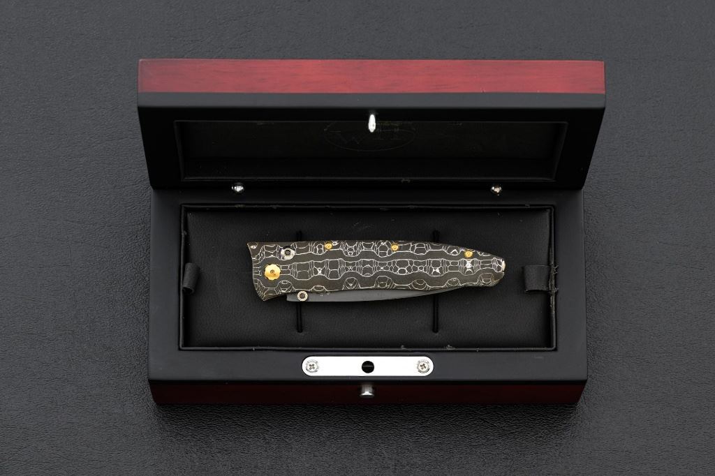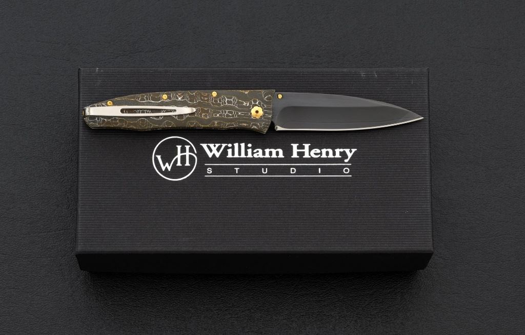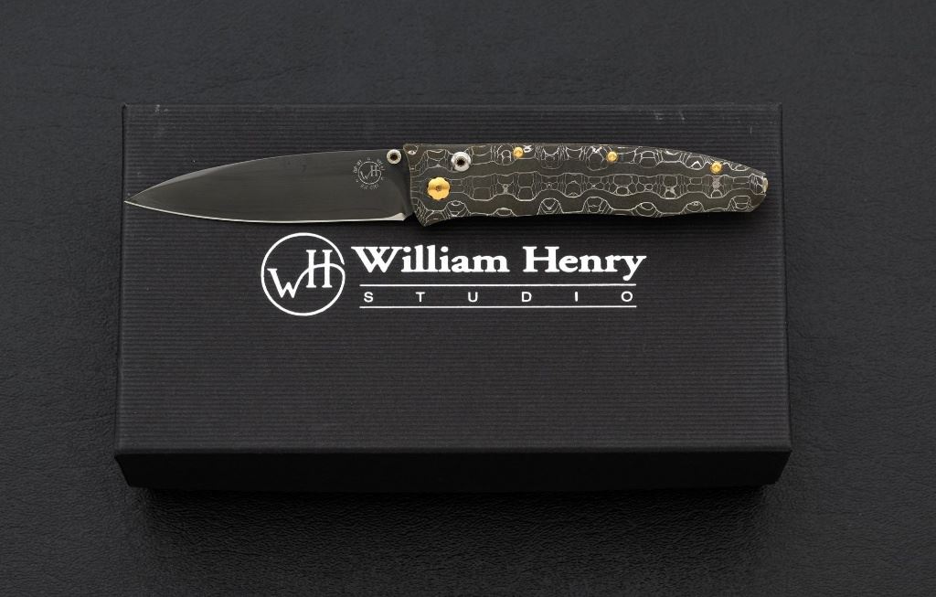 One of 50 William Henry Model B30-1111 Gray Ghost Button Lock Folding Knife, 3.1" tungsten DLC coated stainless blade, 4" overall closed length, spinel inlaid thumb stud and button, Chad Nichols carbon "Croc Skin" damascus frame, stainless and 24K gold plated fittings, with pocket clip. Numbered 039/50 on front edge of the frame. Includes the original black WH box, wood presentation box, black leather WH clipcase, and matching numbered Certificate of Authenticity. Manufactured September 13, 2012. Knife is in new condition. Boxes are in excellent condition. Est.: $1,000-$1,200.