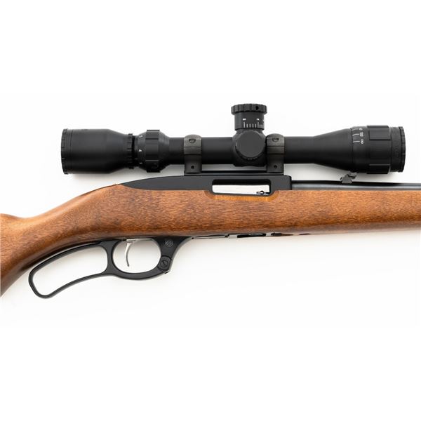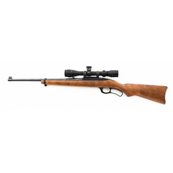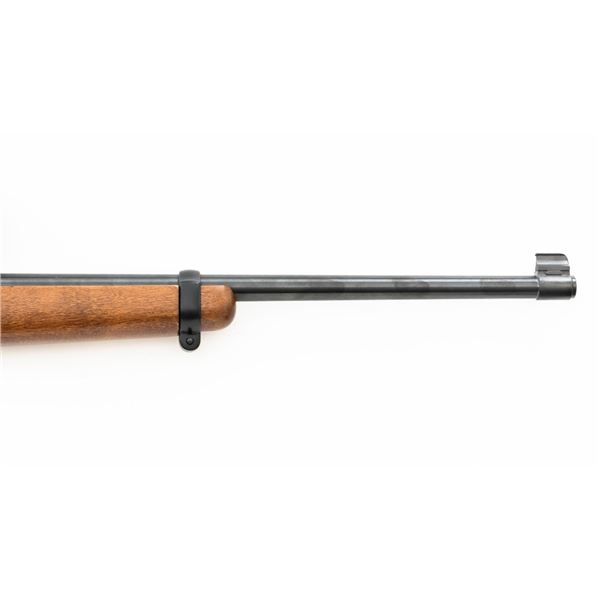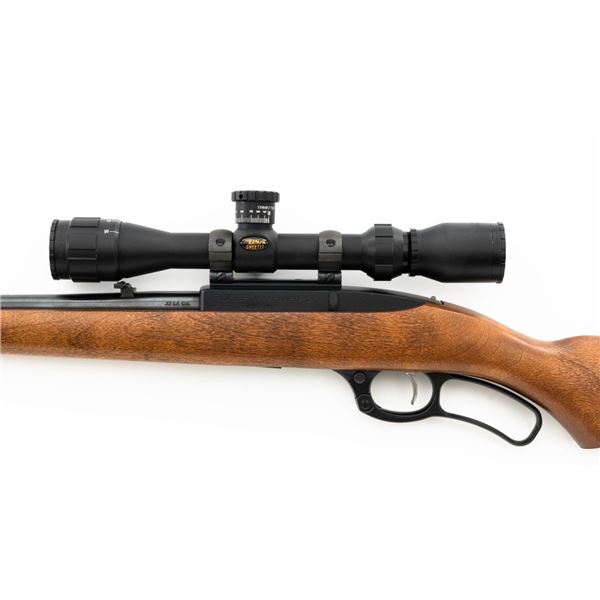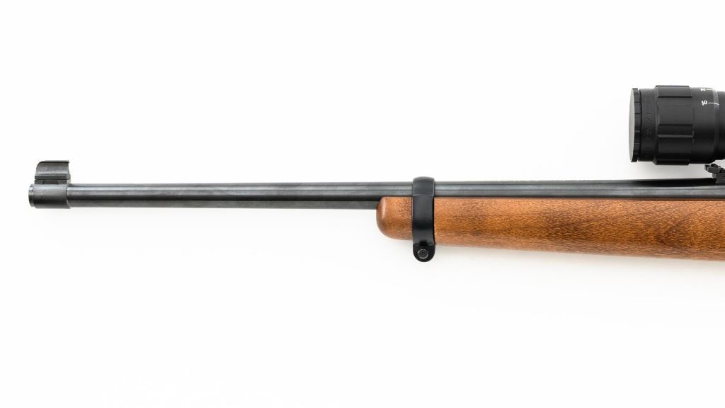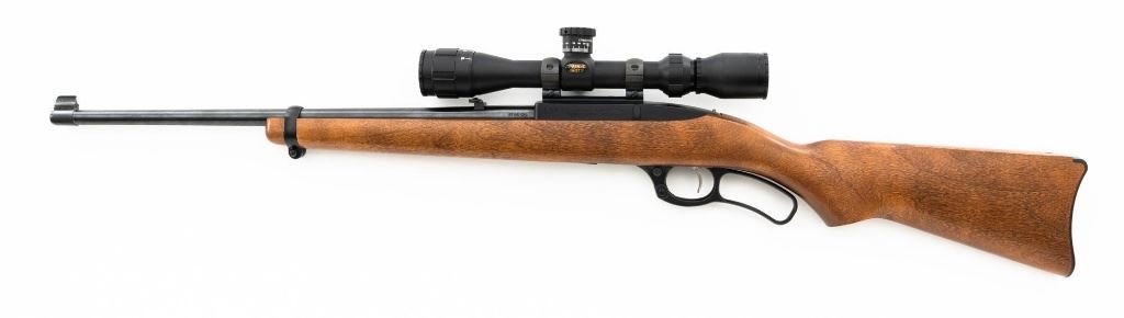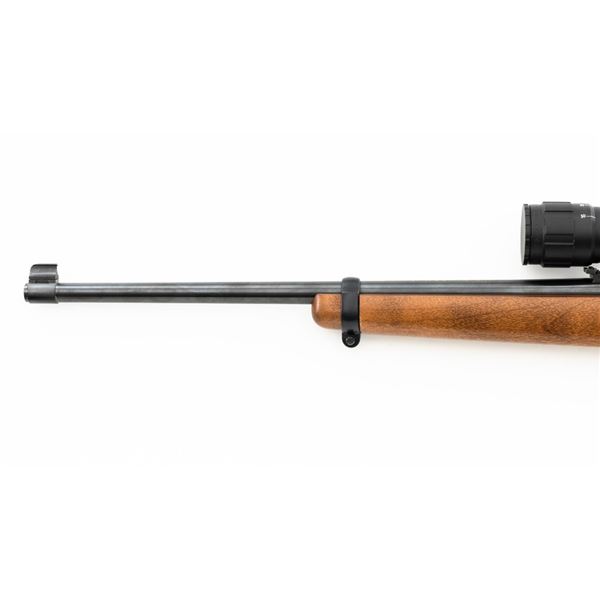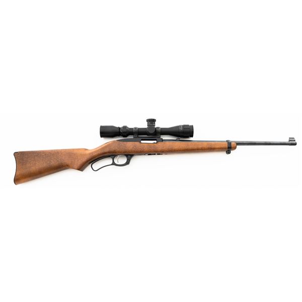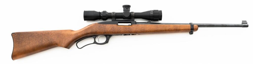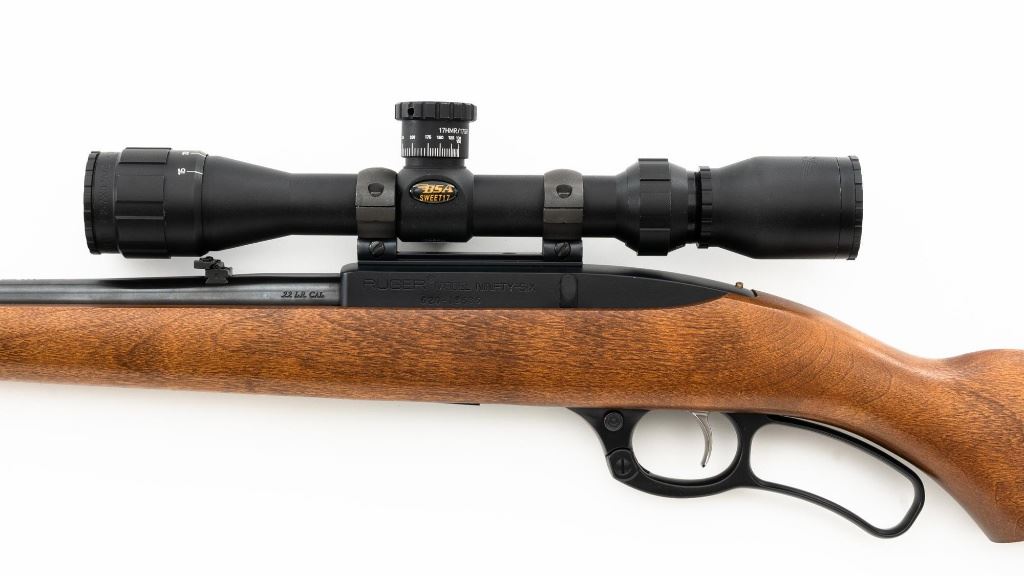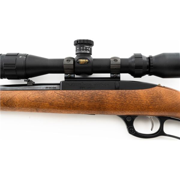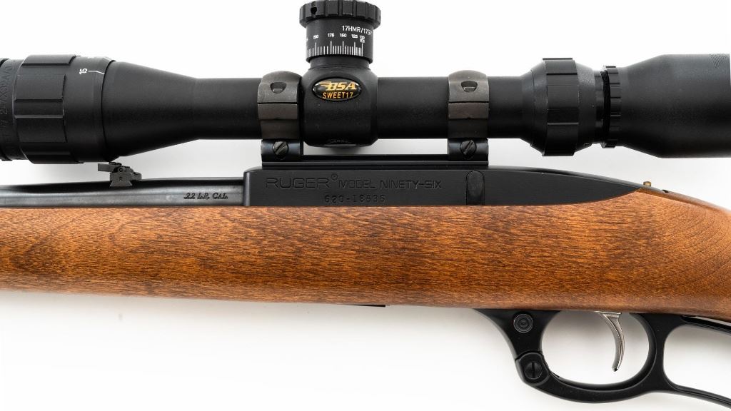 Ruger Model Ninety-Six Lever Action Rifle, #620-18536, .22 LR cal., 18.5" barrel, blue finish, smooth hardwood one-piece pistol grip stock, banded brass tipped blade front and notched folding rear sight. Includes one Ruger 10-round rotary magazine. Mfgd 1996, the first year of production. Topped with a one-piece base, rings, and BSA Sweet 17 2-7x scope with an adjustable objective, and target turrets, finished in matte black, with duplex reticle. Scope is in excellent condition with bright, clear optics. Rifle is in excellent overall condition, retaining approx. 99%+ factory finish, with only minor marks, showing little use. Stock is in excellent condition with only a few light storage marks. Action is crisp. Bore is mirror bright with excellent rifling. Est.: $700-$900. (Modern)