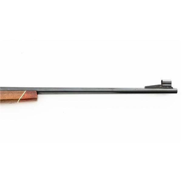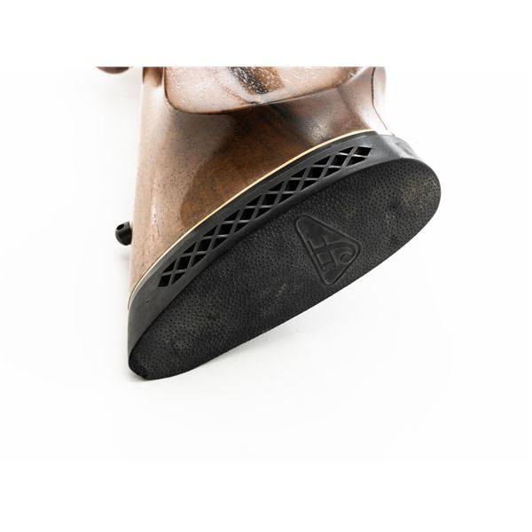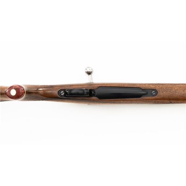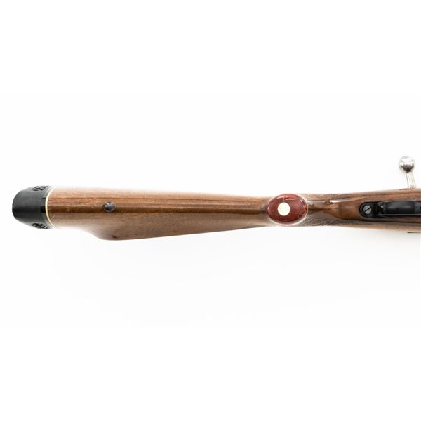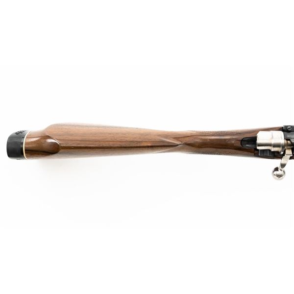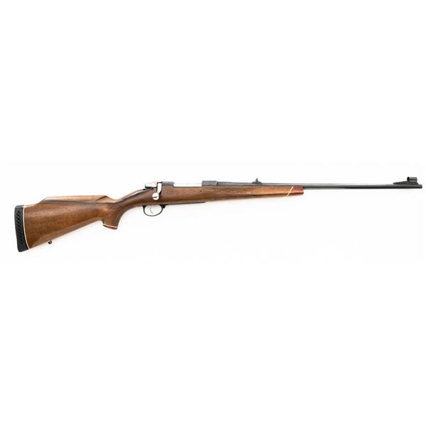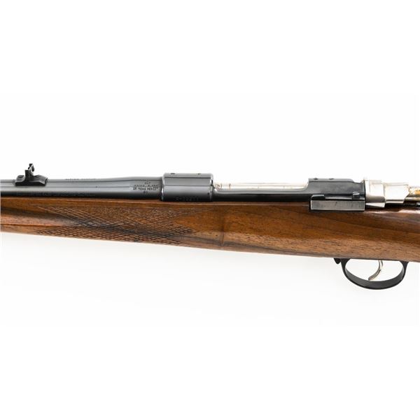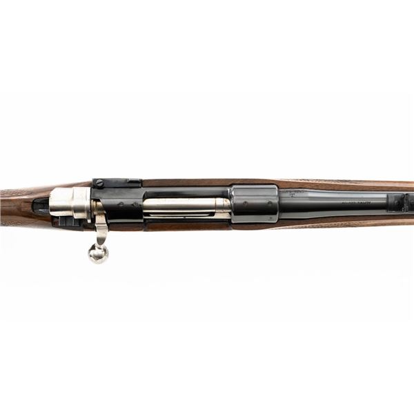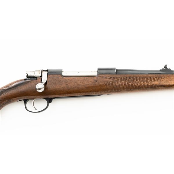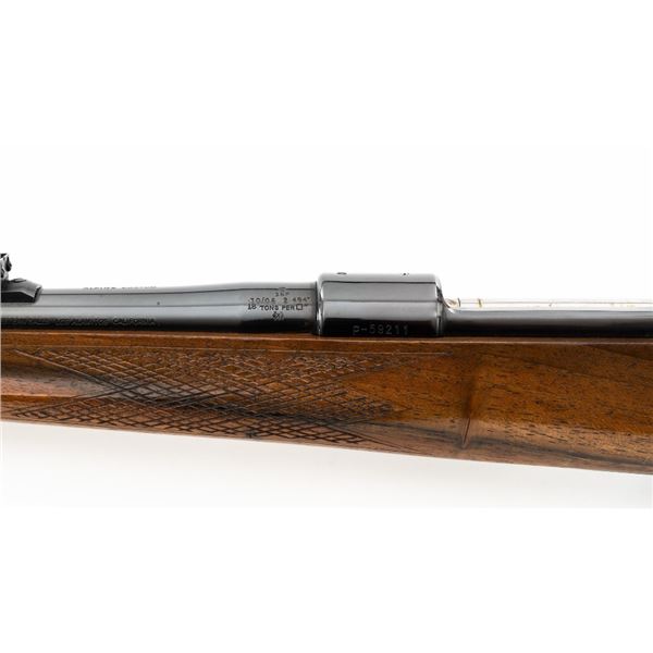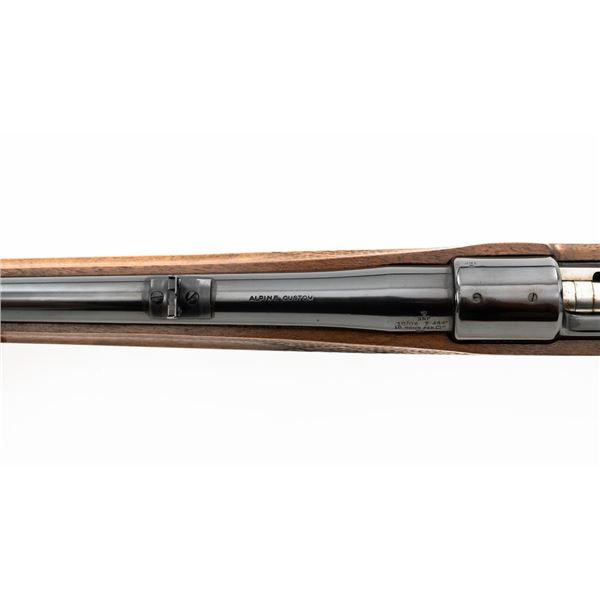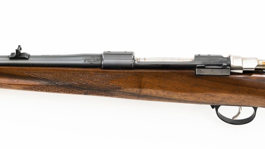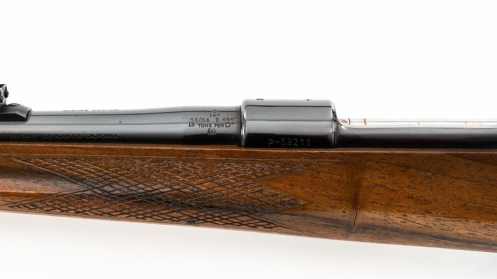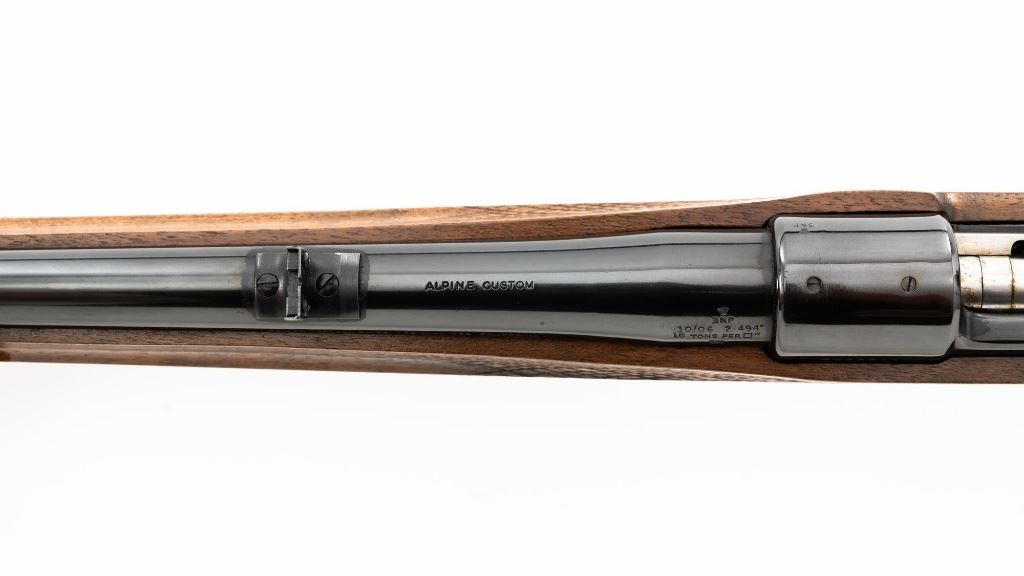 English Proofed Alpine Custom FN Mauser Bolt Action Sporting Rifle, #P-59211, .30-06 cal., 24" barrel, with blue finish. Checkered walnut one-piece Monte Carlo stock with rosewood forend tip and grip cap, buttstock ends with a ventilated rubber recoil pad, providing a 14.6" LOP. Rifle also features a hooded ramped blade front sight, adjustable "U"-notch rear sight, drilled and tapped receiver, chrome bolt modified for scope mounting and etched with matching serial number, and trigger bow release internal box magazine. Marked "ALPINE CUSTOM" on the barrel at the breech, English nitro proofed on the barrel and front ring. Right side of the barrel is makers marked "FIREARMS CO. ENGLAND" and the left side is import marked "CALLAN WESTERN SALES LOS ALAMITOS CALIFORNIA." Rifle is in near excellent overall condition, retaining approx. 97%-98% toning finish, with handling marks and scratches around the front sight. Receiver shows minor storage marks and some areas of dried oil, with some light scratching to the floorplate/trigger guard. Stock is in near excellent condition with scattered minor scratches and scuffs. Front sling swivel stud has been removed and plugged. Action functions smoothly. Bore is near excellent with well-defined rifling. Est.: $500-$700. (Modern)