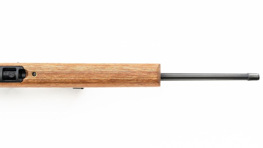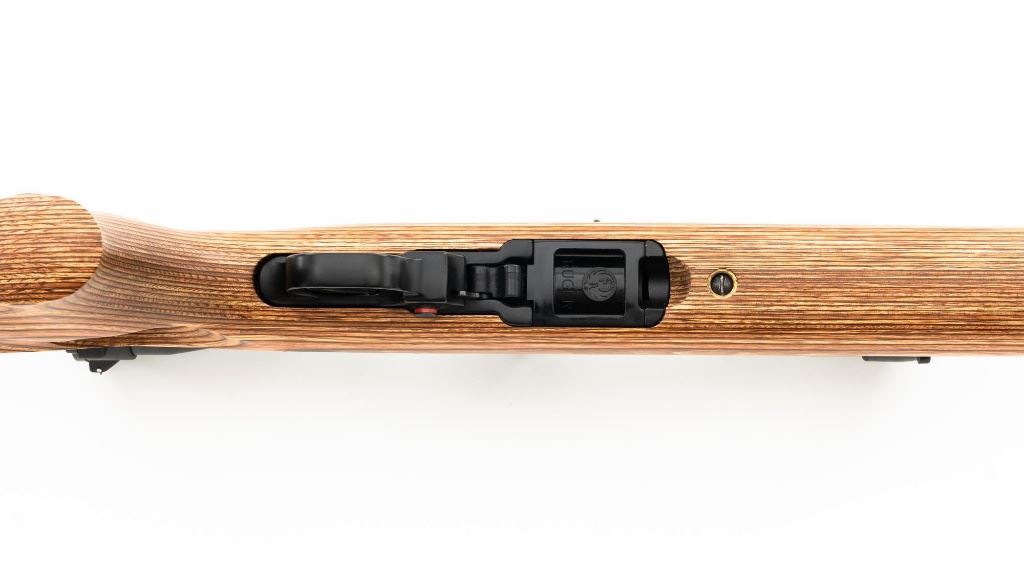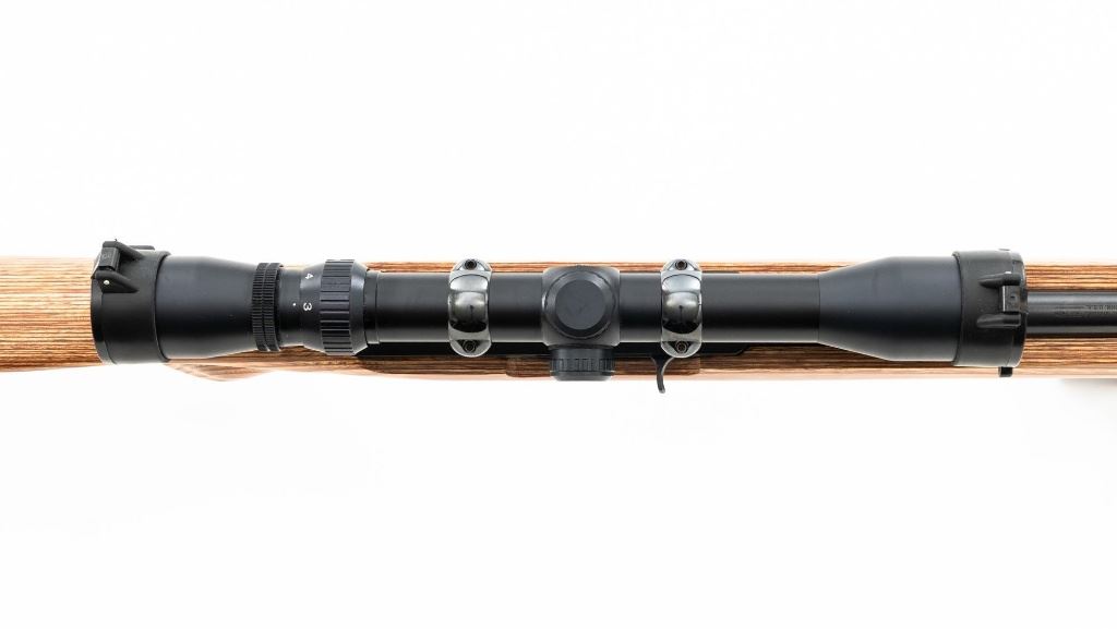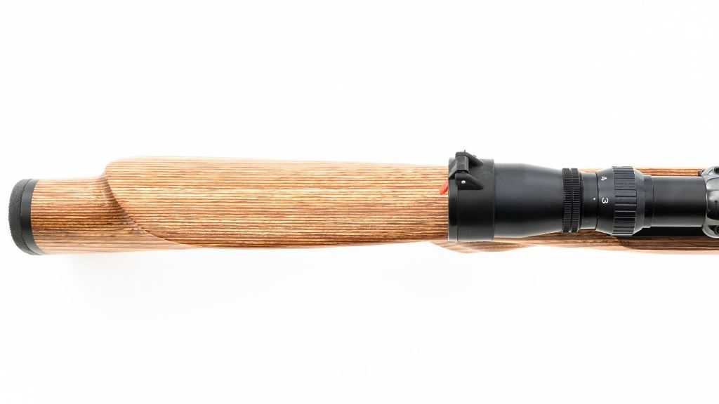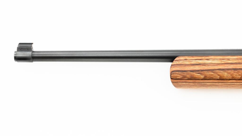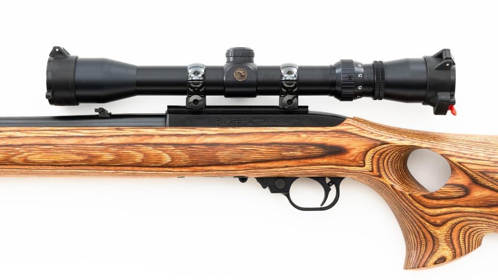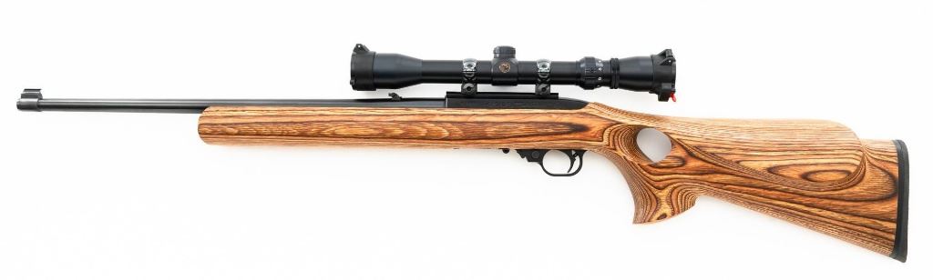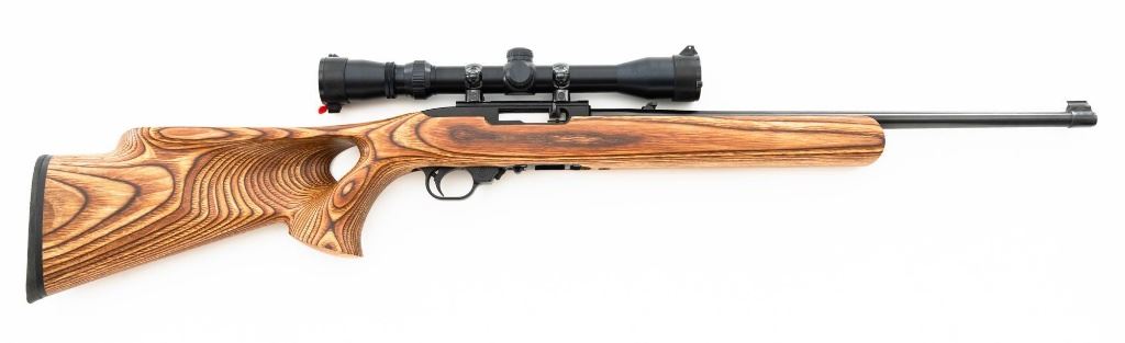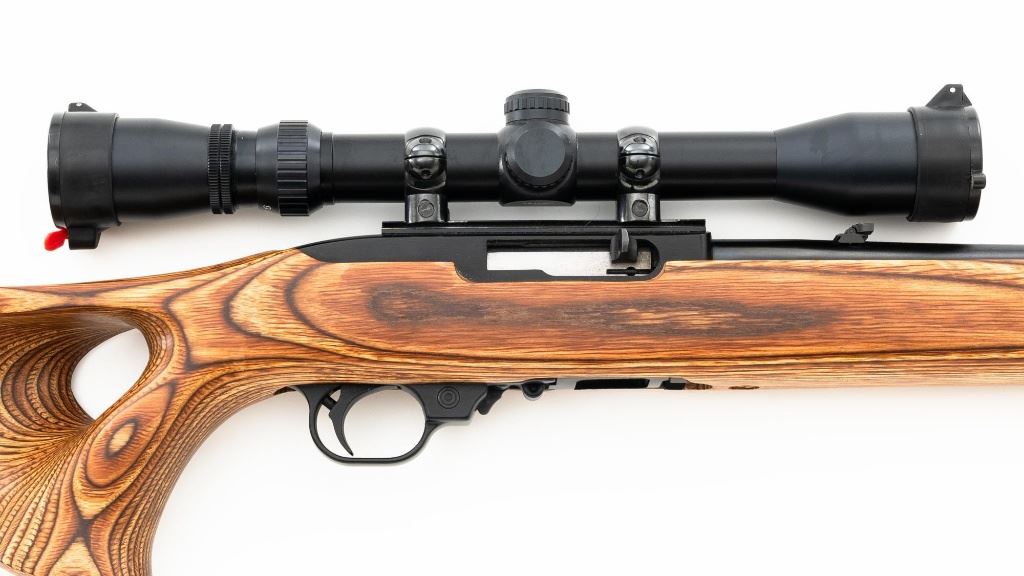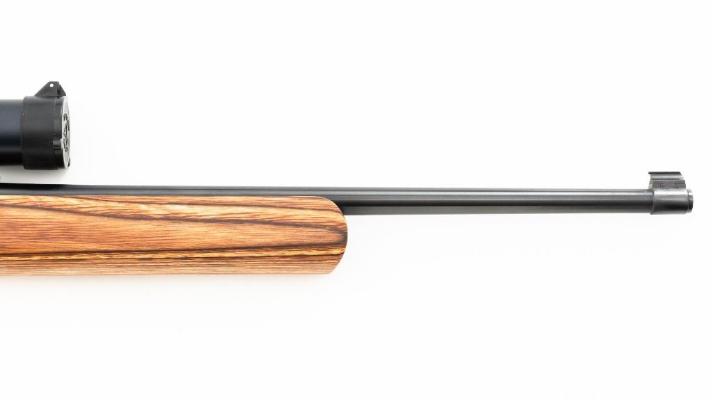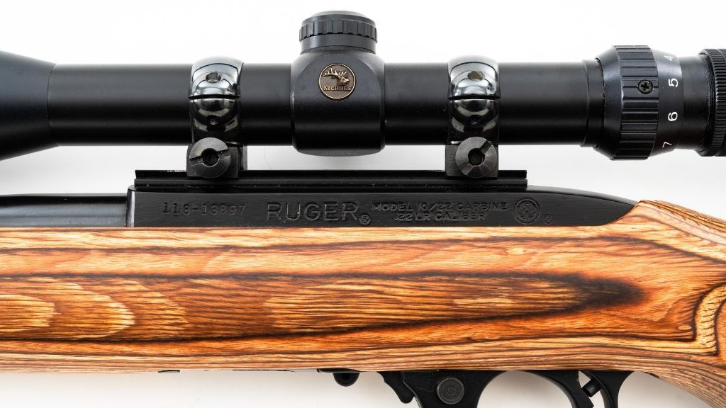 Custom Ruger 10-22 Semi-Auto Carbine, #118-13897, .22 LR cal., 18.5" barrel, blue finish, smooth laminated wood one-piece pistol grip stock ends with a thin black solid rubber Pachmayr recoil pad, providing a 13.75" LOP. Standard sights include a brass tipped banded blade front and notched folding rear sight. Includes one Ruger 10-round rotary magazine. Topped with a Weaver style one-piece base, rings, and a Nichols 3-9x scope, finished in matte black, with a duplex reticle, and includes a set of Butler Creek flip-up lens covers. Scope has bright, clear optics. Mfgd 1978. Carbine is in excellent overall condition, retaining approx. 98%-99% factory finish, with intermittent light handling marks to the metal and wood. Action functions well. Bore is mirror bright with excellent rifling, showing little use. Est.: $200-$400. (Modern)