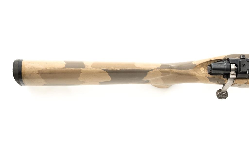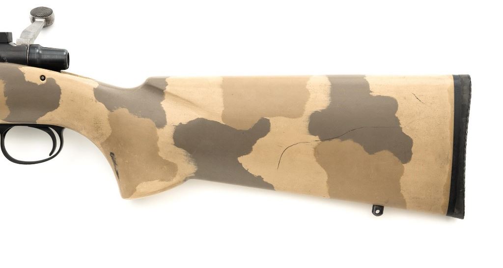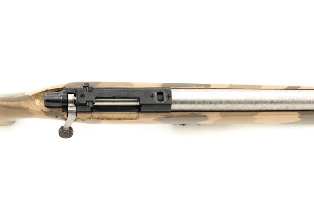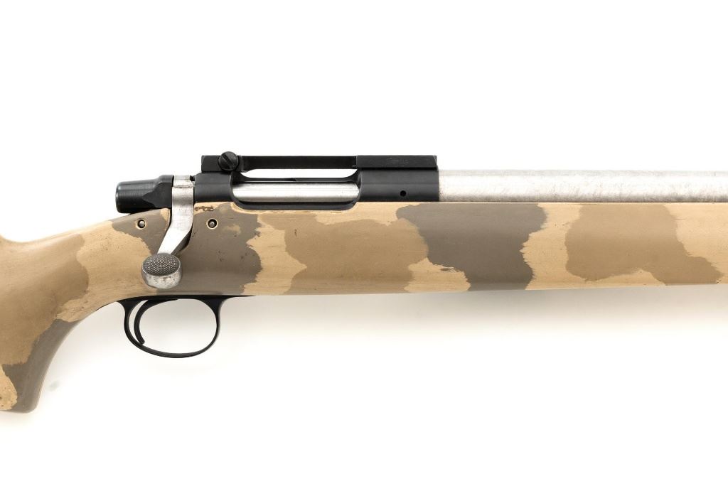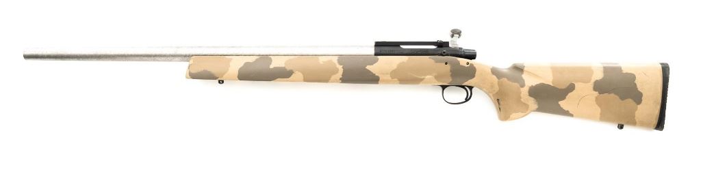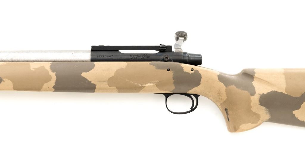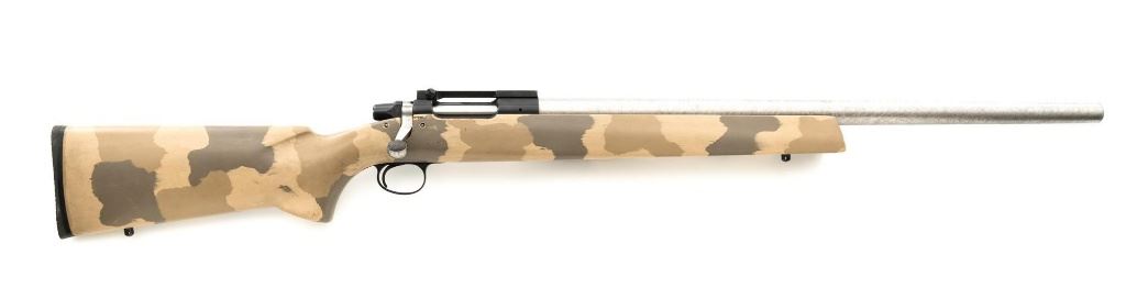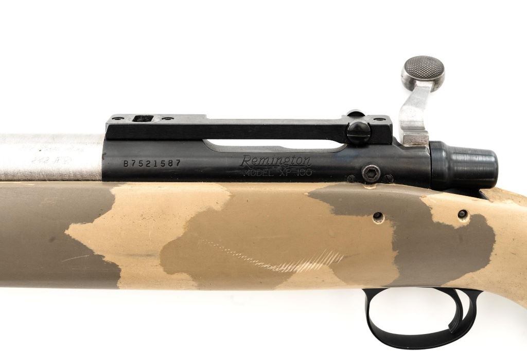 Remington Model XR-100 Bolt Action Single Shot Rifle, #B7521587, .222 Rem. Mag./242 ND cal., 24" custom heavy stainless steel barrel, blue finish on the receiver, smooth synthetic camo flat bottom one-piece pistol grip benchrest stock with sling swivel studs, built without sights. Built on the XP-100 single shot target pistol action with a Model 40-XP Target adjustable trigger. Benchrest forend measures 2.25" across. Buttstock ends with a thin black rubber Pachmayr recoil pad, providing a 13" LOP. Receiver is topped with a one-piece Leupold scope base. Barrel marked ".222 Rem Mag. / 242 ND" in script. Mfgd circa 2005-07. Rifle is in near excellent overall condition, with a custom finished stainless steel barrel. Receiver shows light marks and the bolt handle is finished in the white. Stock is in fine overall condition, with scuffs and scratches consistent with range use. Action is smooth with a crisp trigger. Bore is near excellent with well-defined rifling. Est.: $800-$1,000. (Modern)