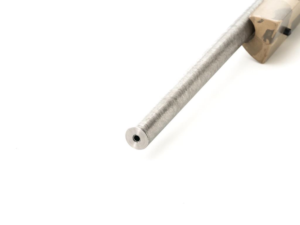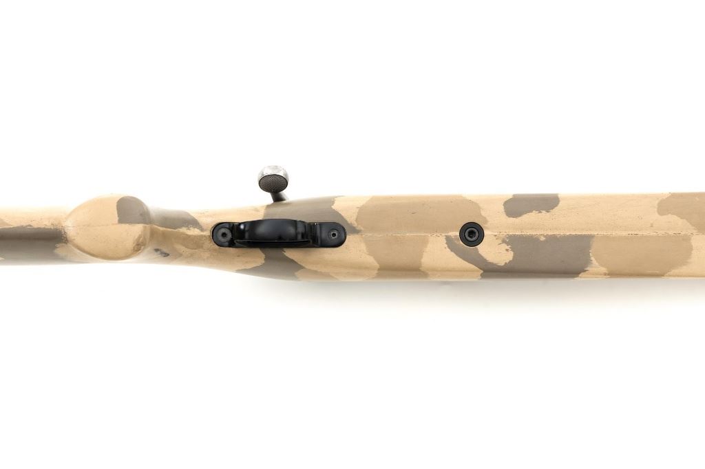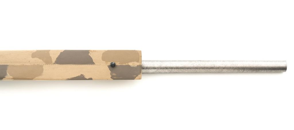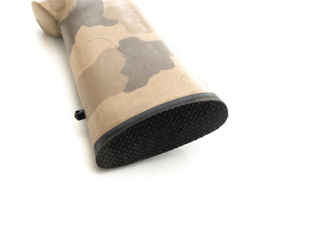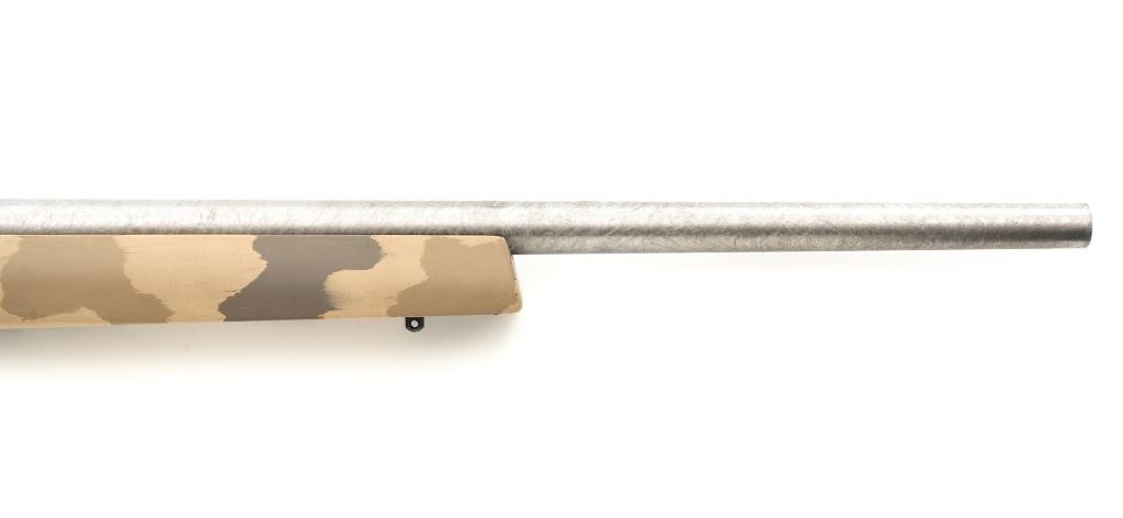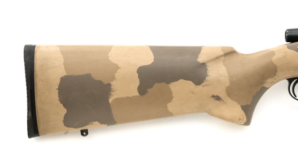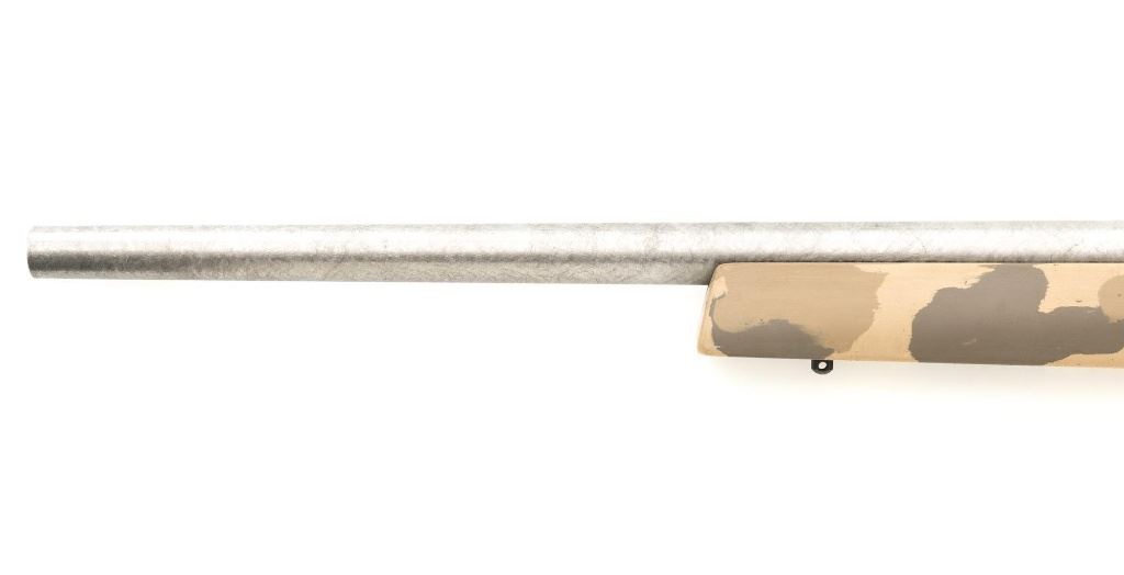 Remington Model XR-100 Bolt Action Single Shot Rifle, #B7521587, .222 Rem. Mag./242 ND cal., 24" custom heavy stainless steel barrel, blue finish on the receiver, smooth synthetic camo flat bottom one-piece pistol grip benchrest stock with sling swivel studs, built without sights. Built on the XP-100 single shot target pistol action with a Model 40-XP Target adjustable trigger. Benchrest forend measures 2.25" across. Buttstock ends with a thin black rubber Pachmayr recoil pad, providing a 13" LOP. Receiver is topped with a one-piece Leupold scope base. Barrel marked ".222 Rem Mag. / 242 ND" in script. Mfgd circa 2005-07. Rifle is in near excellent overall condition, with a custom finished stainless steel barrel. Receiver shows light marks and the bolt handle is finished in the white. Stock is in fine overall condition, with scuffs and scratches consistent with range use. Action is smooth with a crisp trigger. Bore is near excellent with well-defined rifling. Est.: $800-$1,000. (Modern)