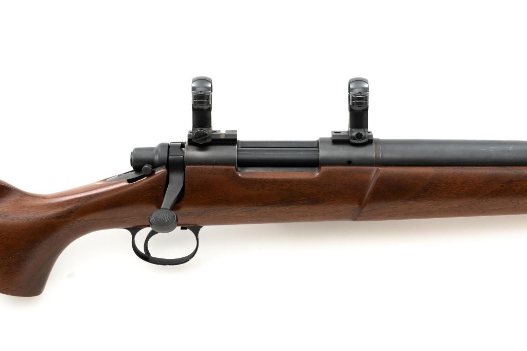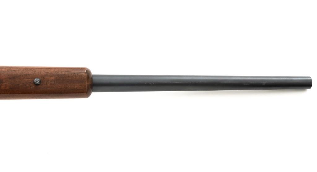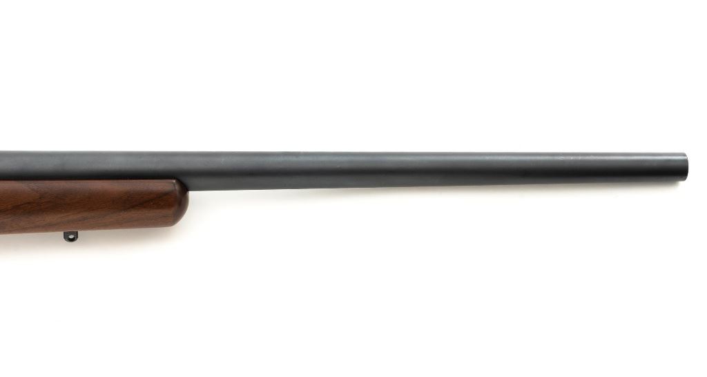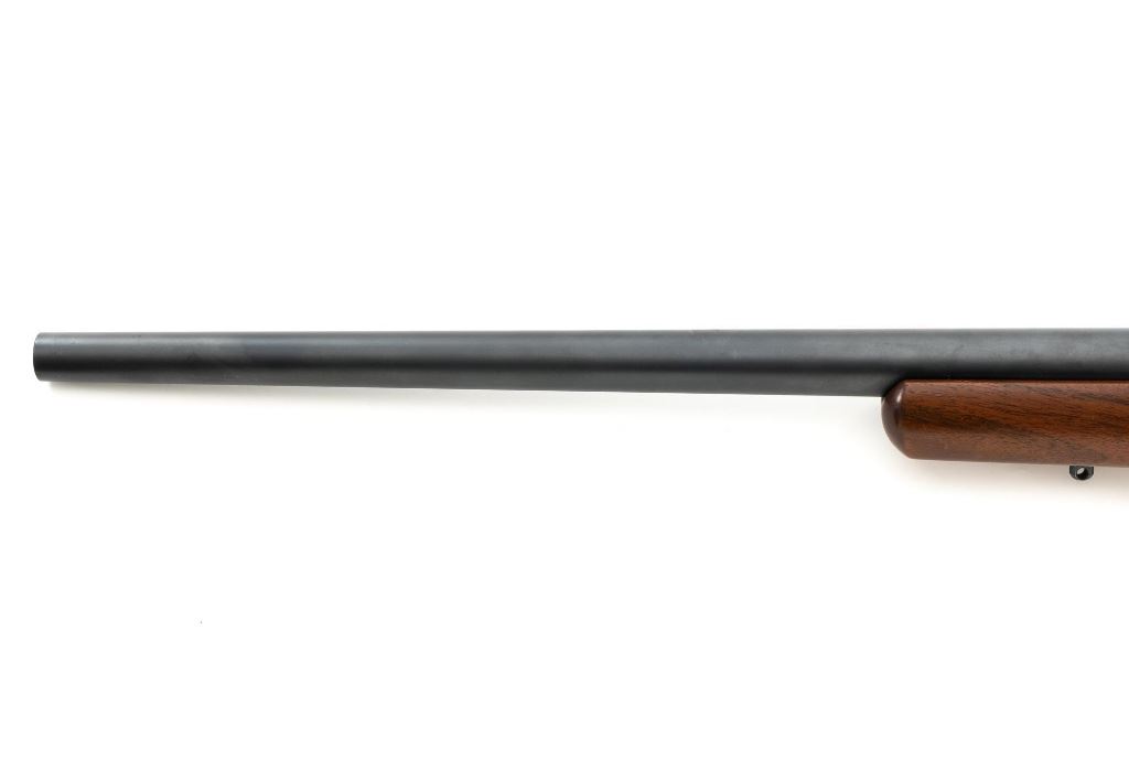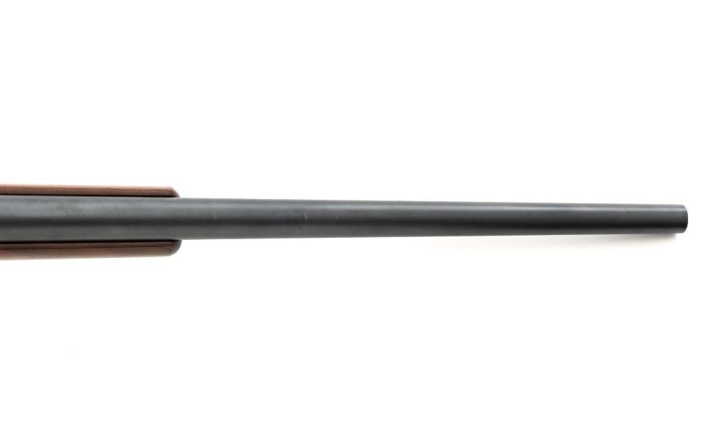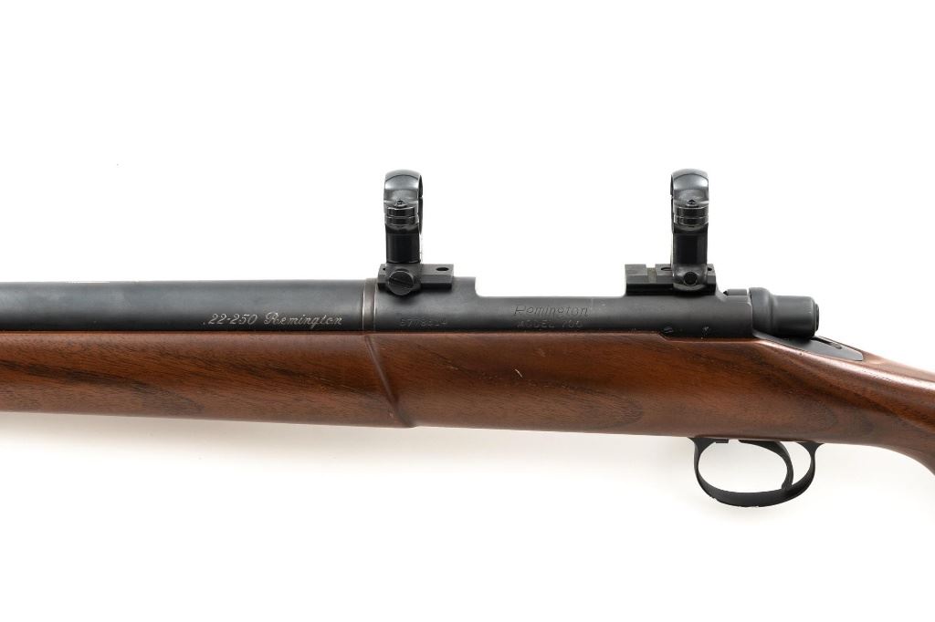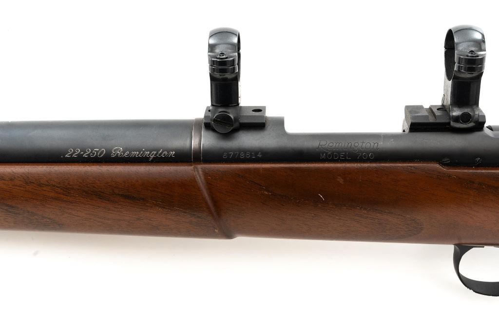 Custom Remington Model 700 Bolt Action Single Shot Rifle, #6778614, .22-250 Rem. cal., 24" heavy barrel, matte blue finish, smooth walnut one-piece pistol grip stock with semi-beavertail 1-" wide forend, manufactured without sights. Buttstock ends with a thin black rubber Weatherby recoil pad, providing a 13" LOP. Receiver is topped with Weaver style two-piece bases and rings. Rifle is near excellent overall condition, retaining approx. 97%-98% finish, with light handling marks and edge wear on the trigger guard. Stock is in near excellent condition, with light marks and a well-completed professional repair on top of the comb. Action functions smoothly with a crisp trigger. Bore is near excellent with well-defined rifling. Est.: $600-$800. (C&R)