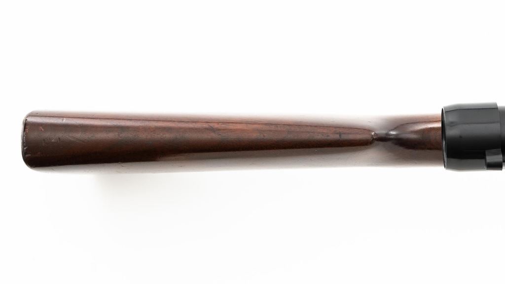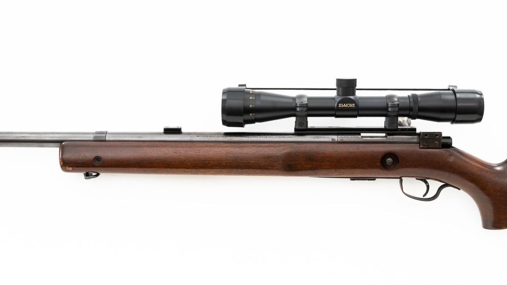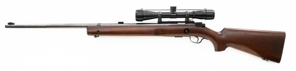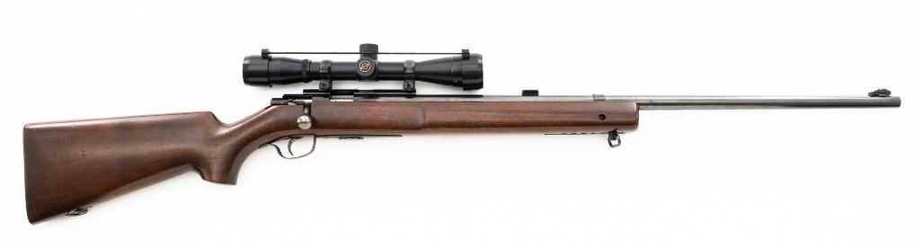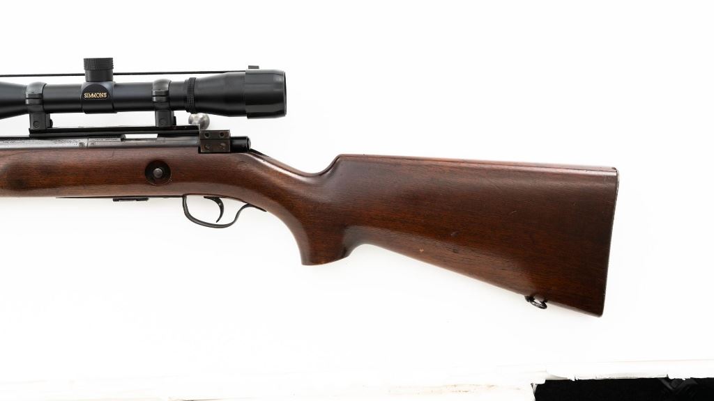 Early Winchester Model 75 Target Bolt Action Rifle, #17376, .22 LR cal., 28" barrel, with blue finish. Smooth walnut one-piece pistol grip target stock with sling swivels, accessories rail on underside of the forend, ending with a checkered steel shotgun style buttplate, providing a 13.25" LOP. Barrel with vacant front and rear sight blocks. There is an aperture sight base at the left rear of the receiver. Includes one detachable 5-round Winchester magazine, with magazine release button on left side of stock. Factory markings are crisp, with Winchester "WP" proofs on the left side of the barrel and front ring, bolt is etched with matching serial number. Rifle is topped with a Weaver style one-piece base, rings, and a Simmons ProAir 4x fixed power scope, with an adjustable objective, matte black finish, duplex reticle, and includes a set of plastic lens covers. Scope optics are clear and bright. Rifle was mfgd in 1939, 2nd year of production, and is in near fine overall condition, retaining approx. 90%-92% factory blue, showing areas of thinning, and some areas of mild surface erosion along the barrel and on the trigger. Trigger guard shows some areas of wear to gray metal. Stock with scattered indentations and scratches that are consistent with range use. Action functions smoothly with a crisp trigger. Bore is near excellent with well-defined rifling. Est.: $600-$800. (C&R)