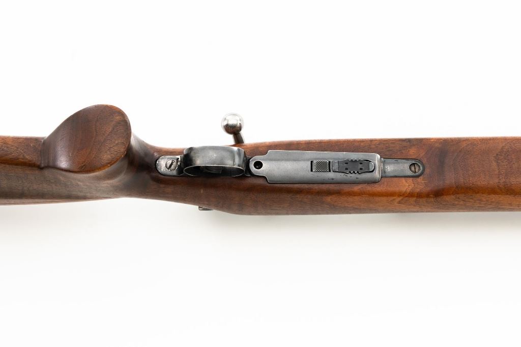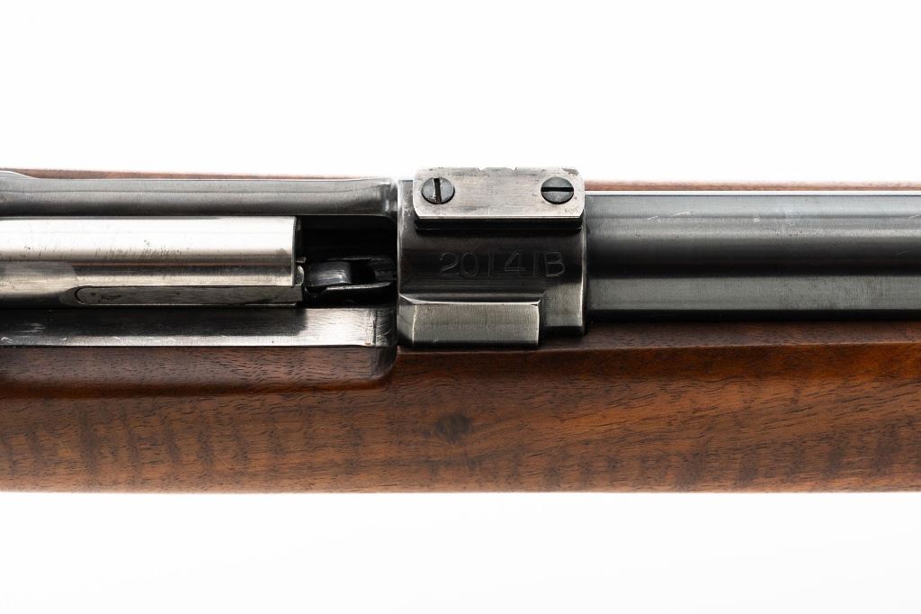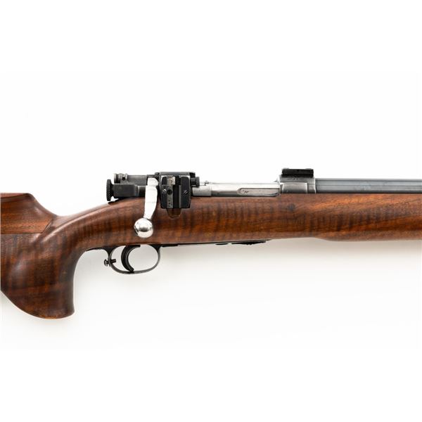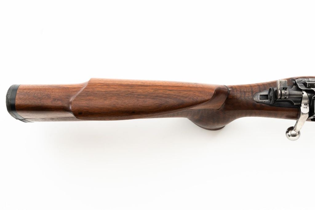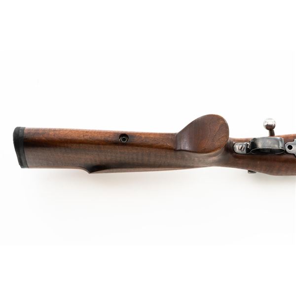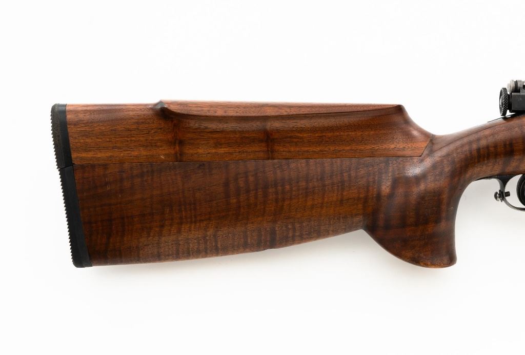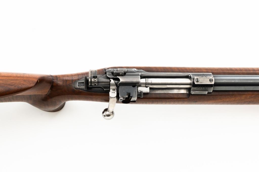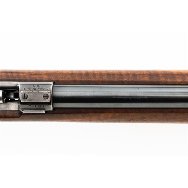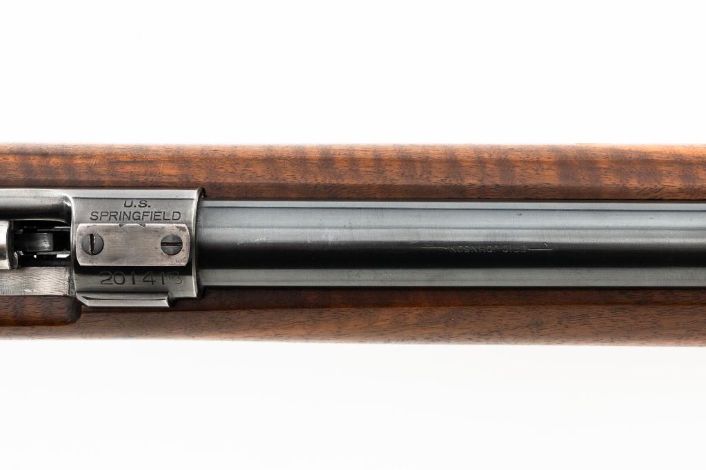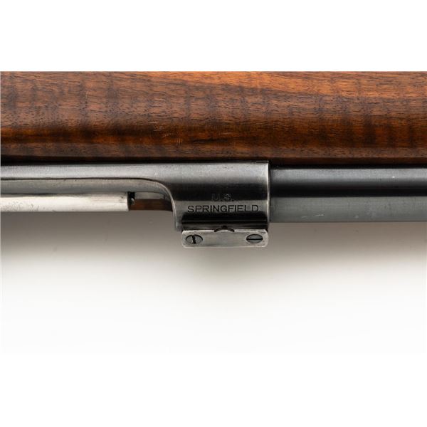 Custom U.S. Springfield Armory 1922 M1 Bolt Action Target Rifle, #20141B, .22 LR cal., 26.5" "Eric Johnson" heavy barrel, blue finish. Smooth walnut heavy target stock with 2" wide beavertail forend, accessory rail has been removed, pieced-in custom rollover comb, and ends with a solid rubber recoil pad, providing a 13.5" LOP. Rifle features sight blocks at the muzzle, mid-point, and front ring. There is an aperture sight base at the right rear of the receiver. Includes one 5-round blue steel magazine marked "M2". Modified chrome bolt marked "N.S. M2" at the top of the handle. Trigger with an added shoe and extra screw at the rear of the trigger guard. Factory markings are clear, stamped "ERIC JOHNSON" on the barrel at the breech. Rifle is in fine overall condition, retaining approx. 85%-90% thinning finish. Barrel and receiver with scattered scuffs and scratches. Stock is in near fine condition with scattered indentations, scratches, and small marks. Stock shows attractive fiddleback figure with a custom comb. Action operates smoothly. Bore is fine with well-defined rifling. Eric Johnson was a noted barrel maker/gunsmith in the 1940-50s, known for his "5 Star 8 Groove" barrels. Est.: $500-$750. (C&R)