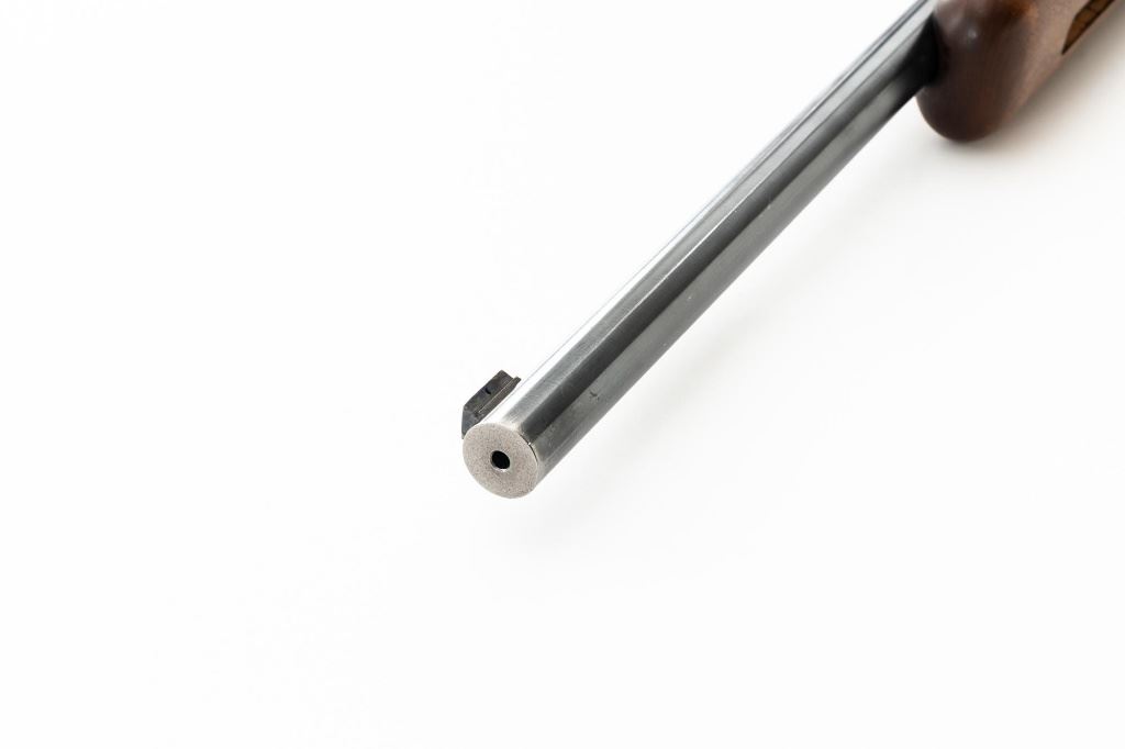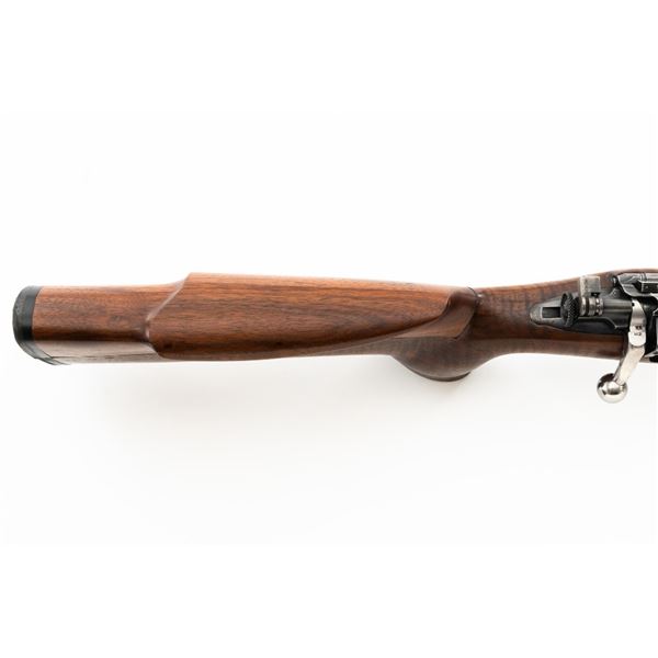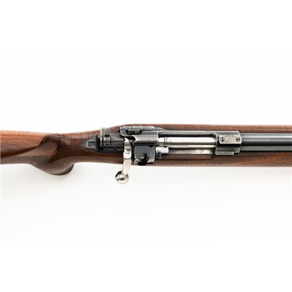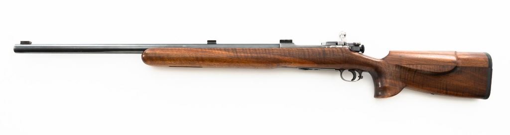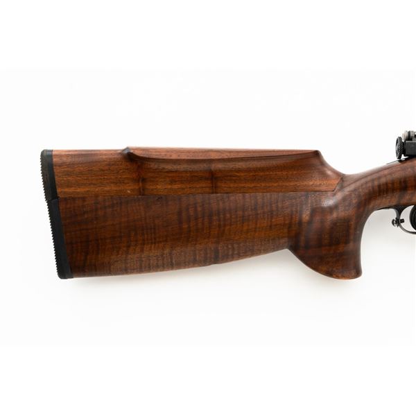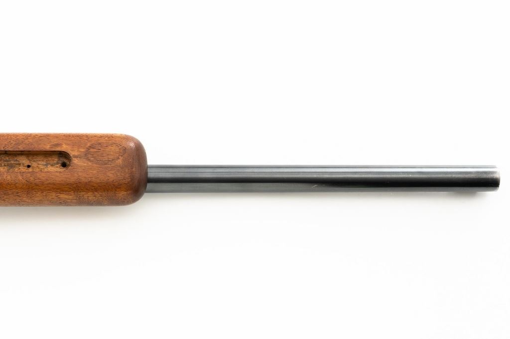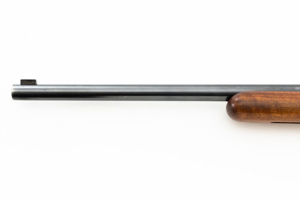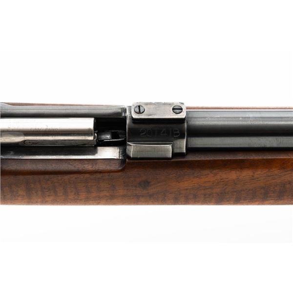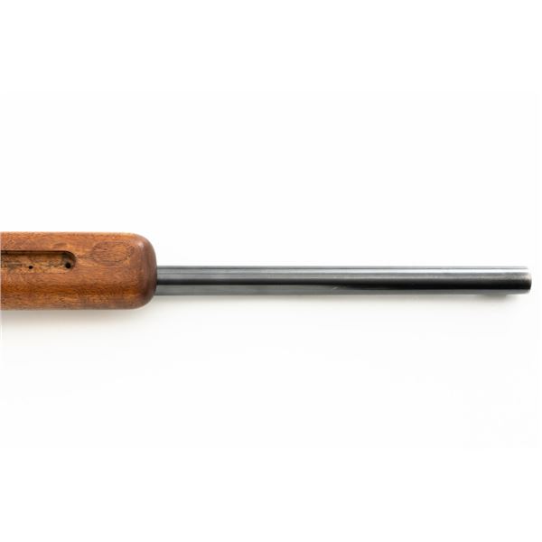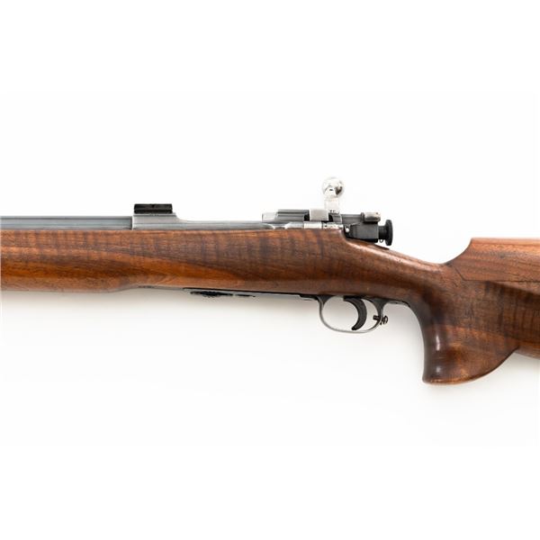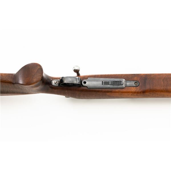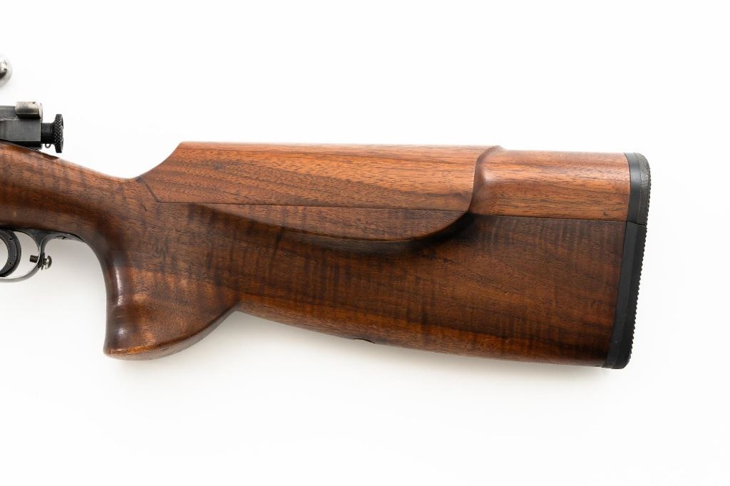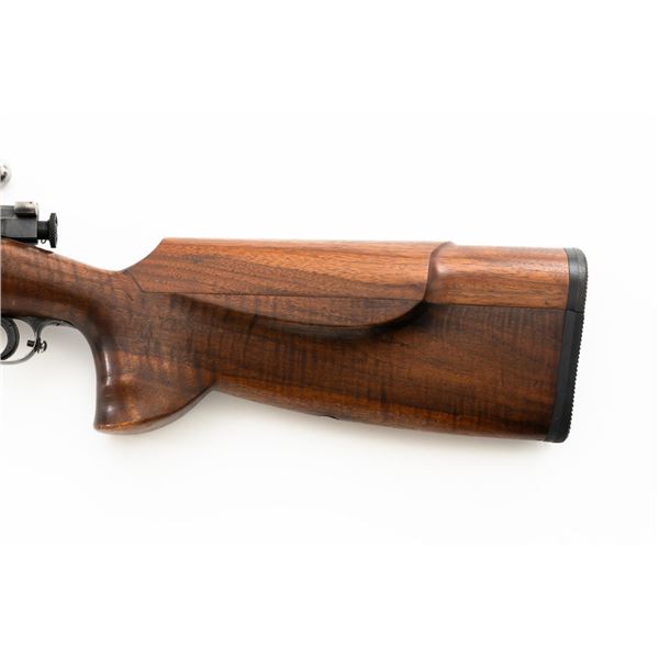 Custom U.S. Springfield Armory 1922 M1 Bolt Action Target Rifle, #20141B, .22 LR cal., 26.5" "Eric Johnson" heavy barrel, blue finish. Smooth walnut heavy target stock with 2" wide beavertail forend, accessory rail has been removed, pieced-in custom rollover comb, and ends with a solid rubber recoil pad, providing a 13.5" LOP. Rifle features sight blocks at the muzzle, mid-point, and front ring. There is an aperture sight base at the right rear of the receiver. Includes one 5-round blue steel magazine marked "M2". Modified chrome bolt marked "N.S. M2" at the top of the handle. Trigger with an added shoe and extra screw at the rear of the trigger guard. Factory markings are clear, stamped "ERIC JOHNSON" on the barrel at the breech. Rifle is in fine overall condition, retaining approx. 85%-90% thinning finish. Barrel and receiver with scattered scuffs and scratches. Stock is in near fine condition with scattered indentations, scratches, and small marks. Stock shows attractive fiddleback figure with a custom comb. Action operates smoothly. Bore is fine with well-defined rifling. Eric Johnson was a noted barrel maker/gunsmith in the 1940-50s, known for his "5 Star 8 Groove" barrels. Est.: $500-$750. (C&R)