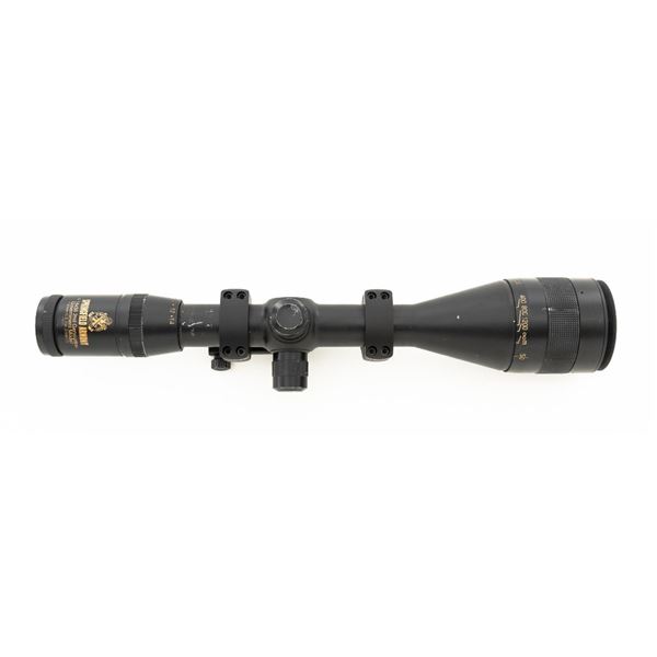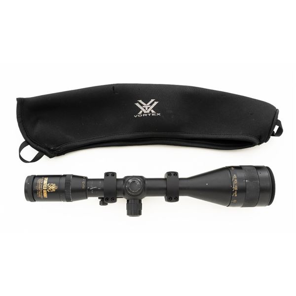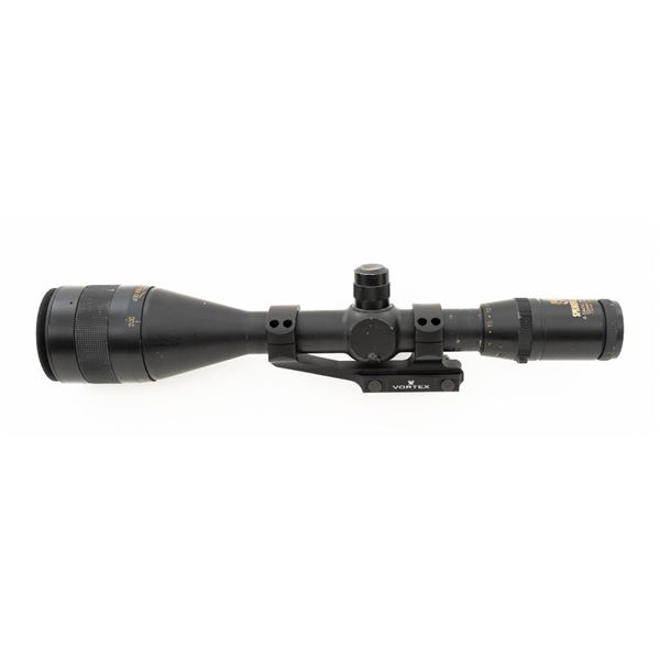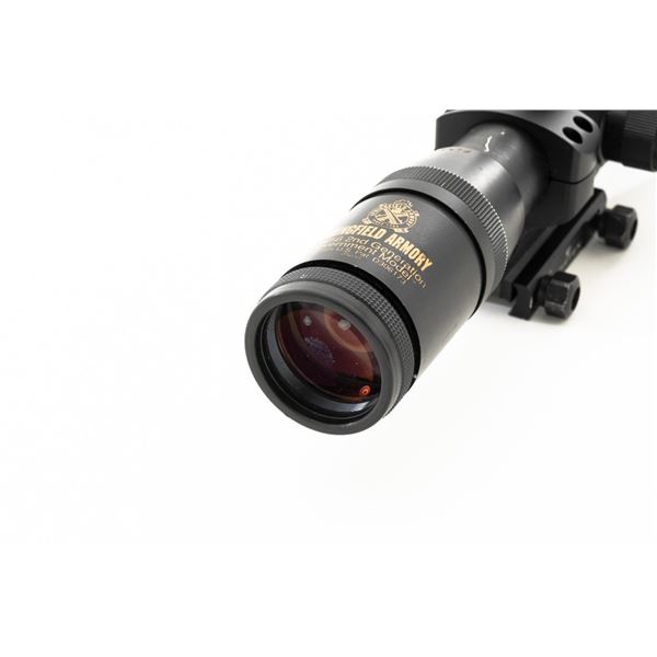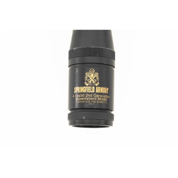 Springfield Armory 4-14x56mm 2ND Generation Government Model Rifle Scope, #25260, 30mm tube, blued finish, FFP, 7.62 BDC reticle. Scope is held in a Vortex cantilever style scope mount. Includes sunshade and neoprene cover. Exterior of the scope shows minor handling marks and light scratches consistent with use. Optics are bright and clear. 1/4" click adjustment for windage and elevation both turn freely. Est.: $400-$600.