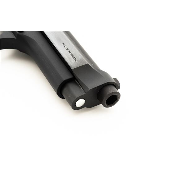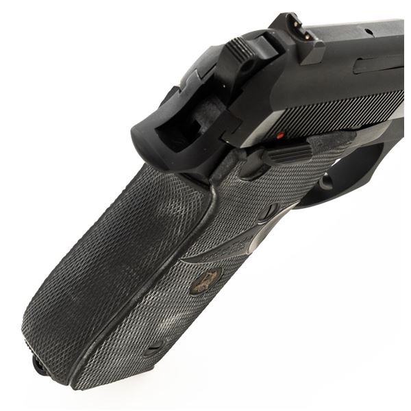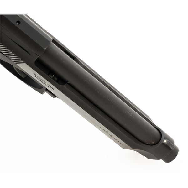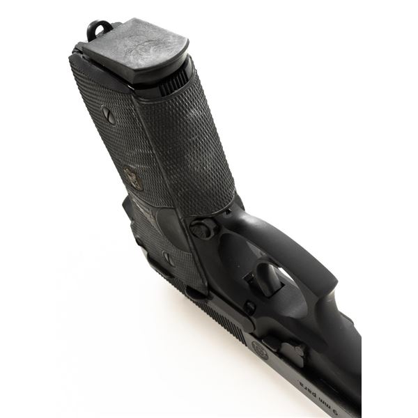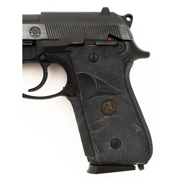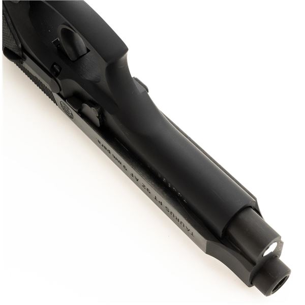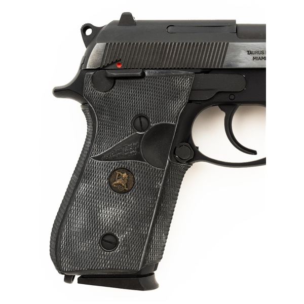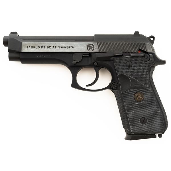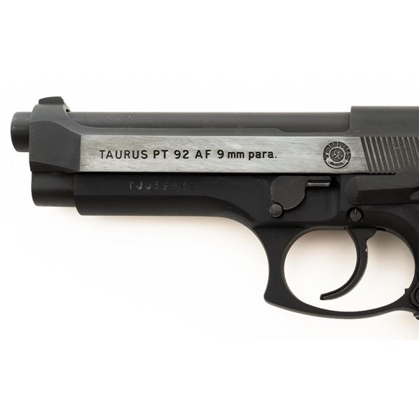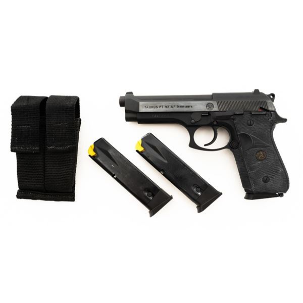 Taurus Model PT92 AF Semi-Automatic Pistol, #TJJ69948, 9mm cal., 5" barrel, blue slide, black alloy frame, Pachmayr black rubber wrap around checkered grips, blade front sight, square-notched rear sight adjustable for windage, ambidextrous thumb safety, and three (3) factory 10-round magazines. Includes black nylon magazine pouch. Condition is excellent, retaining approx. 98% original factory metal finish. Grips remain flexible but have a whitish cast and should be cleaned. Action is smooth and locks up tight. Bore is bright with well defined rifling. Est.: $300-$400. (Modern/PPT)