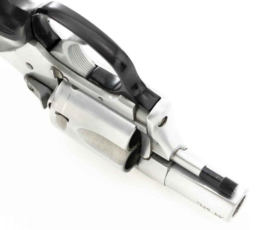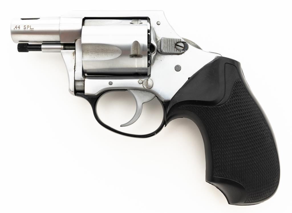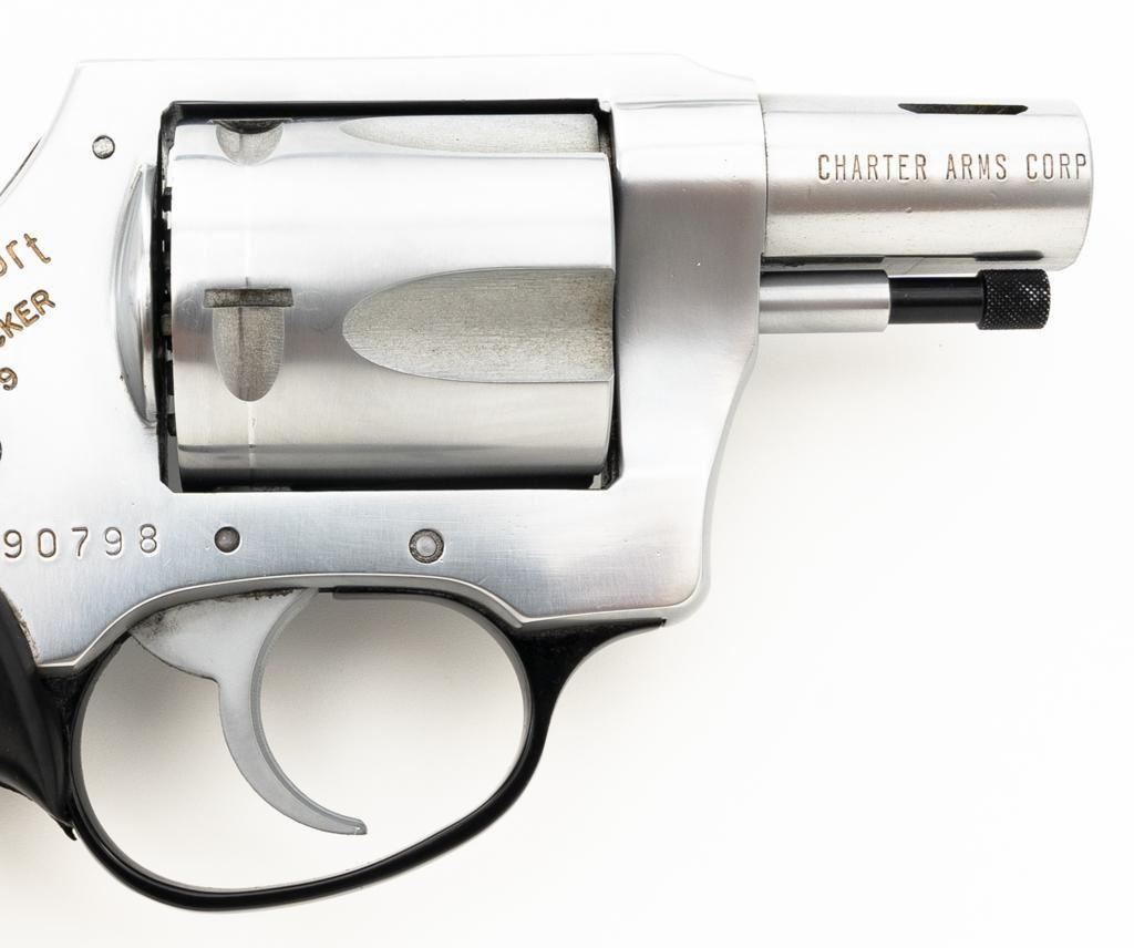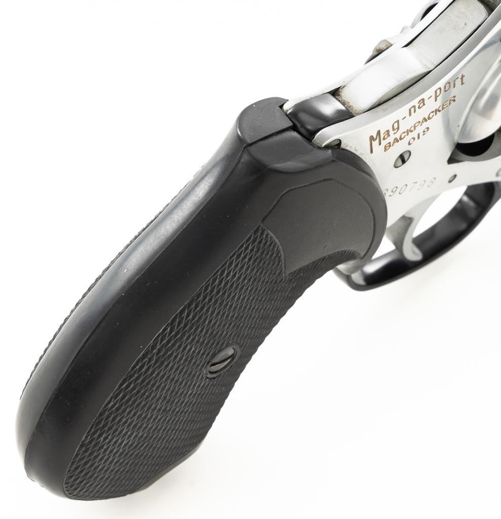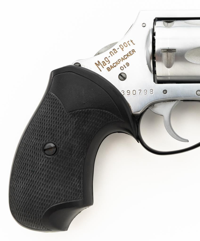 Charter Arms Mag-Na-Port Back Packer 019 Double Action 5-Shot Revolver, #390798, .44 Spl. cal., 2" ported barrel, matte stainless steel, blued trigger guard, checkered two-piece rubber grips, no provision for a front sight, square-notch fixed rear sight, with bobbed hammer. Revolver is in near excellent overall condition, showing light handling wear. There are some light scratches on the cylinder. Grips are near excellent. Action is stiff and would benefit from thorough cleaning. Bore is very good with defined rifling. Est.: $300-$500. (Modern) (Not available to Calif. residents.)