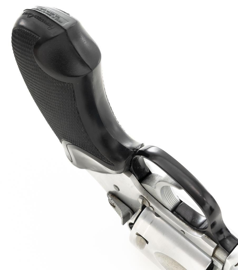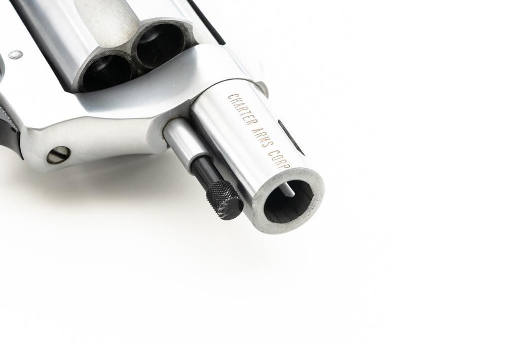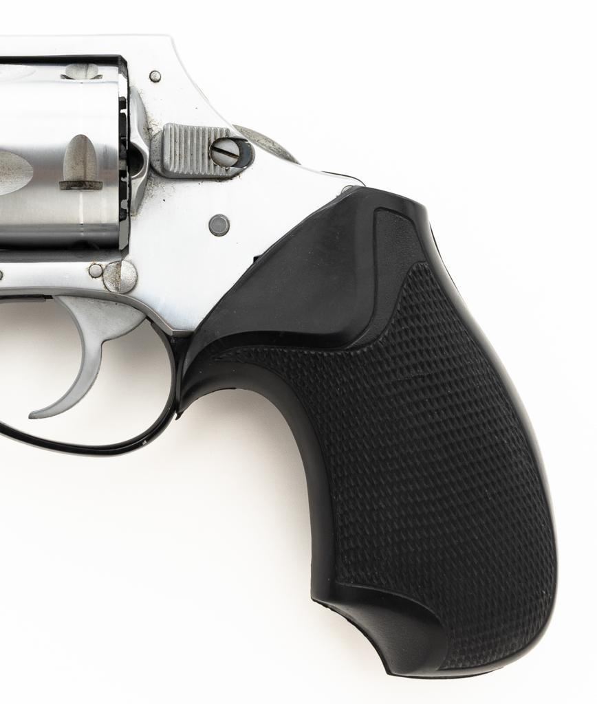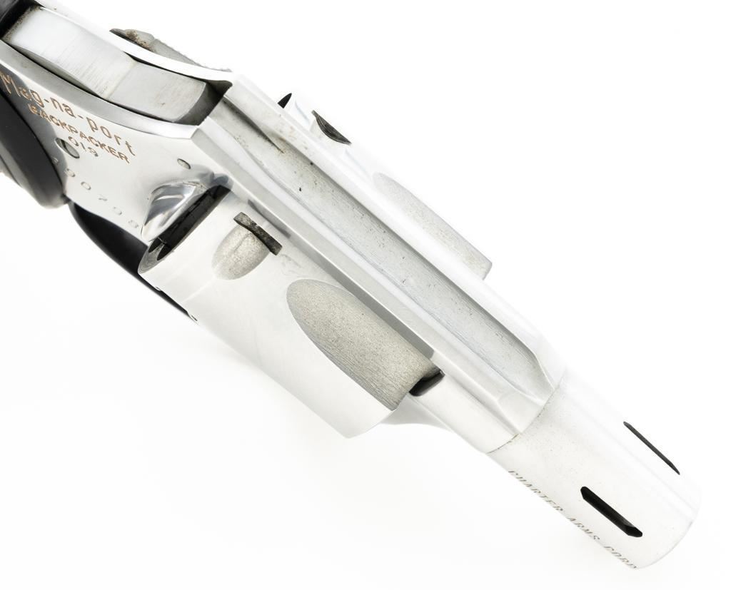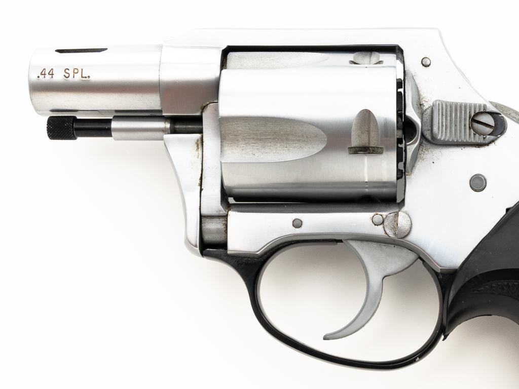 Charter Arms Mag-Na-Port Back Packer 019 Double Action 5-Shot Revolver, #390798, .44 Spl. cal., 2" ported barrel, matte stainless steel, blued trigger guard, checkered two-piece rubber grips, no provision for a front sight, square-notch fixed rear sight, with bobbed hammer. Revolver is in near excellent overall condition, showing light handling wear. There are some light scratches on the cylinder. Grips are near excellent. Action is stiff and would benefit from thorough cleaning. Bore is very good with defined rifling. Est.: $300-$500. (Modern) (Not available to Calif. residents.)