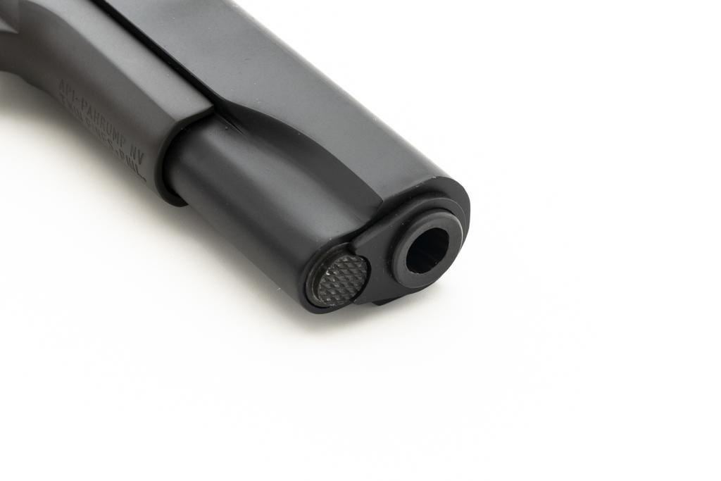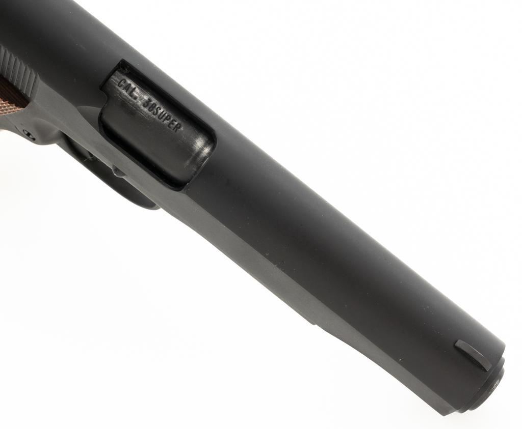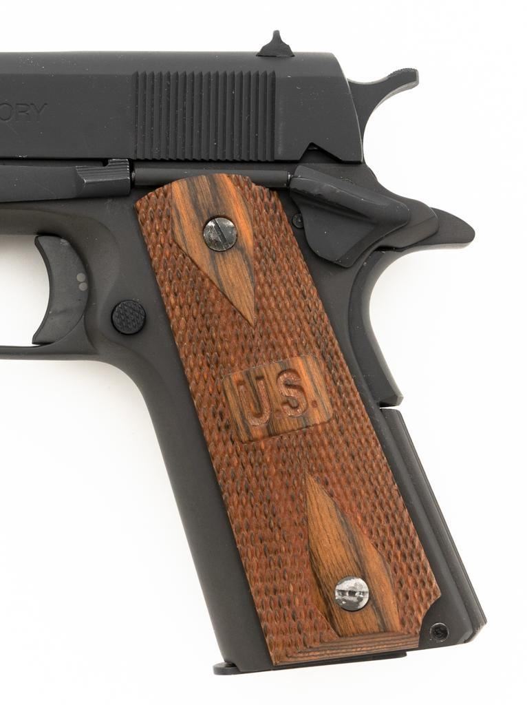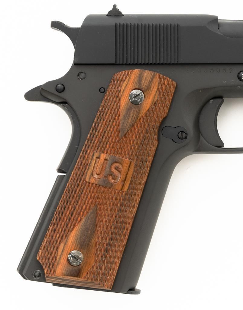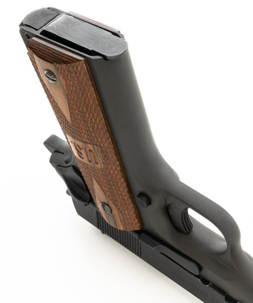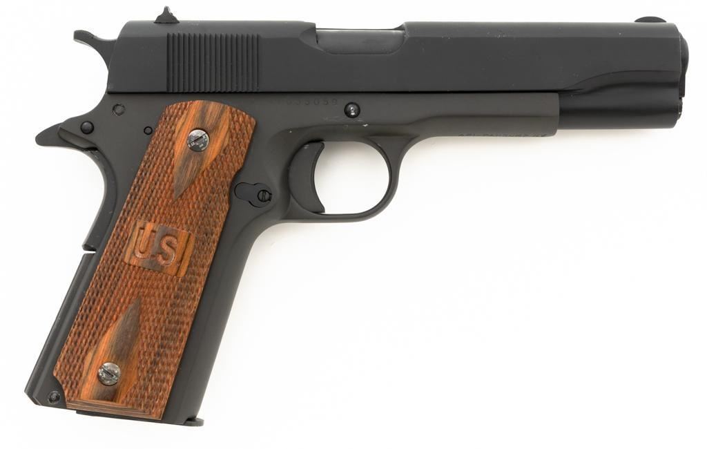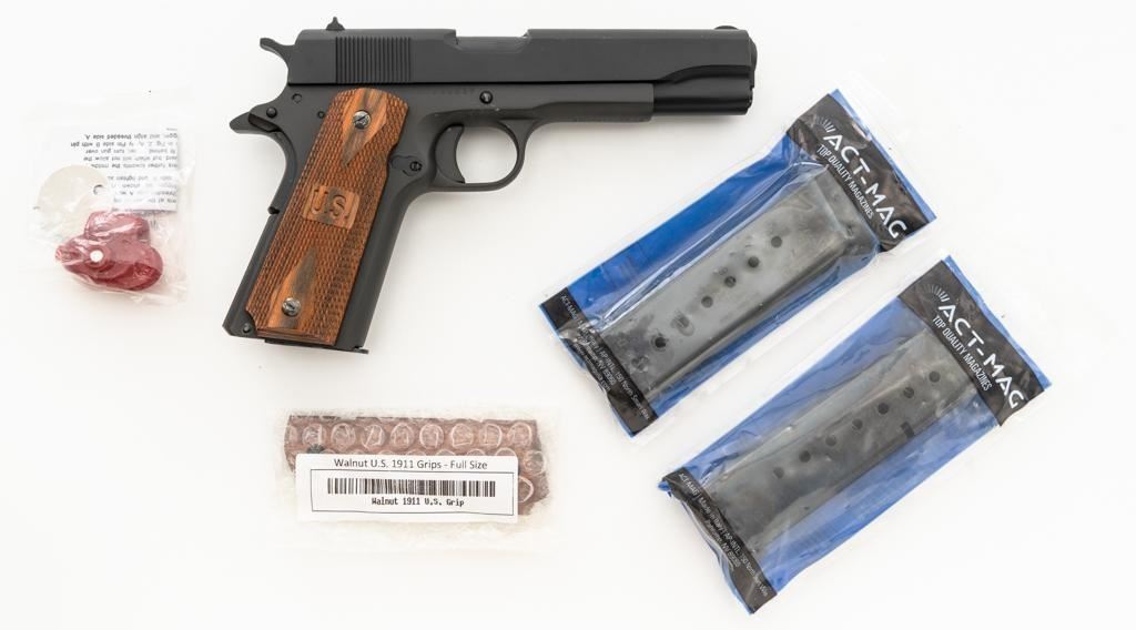 Rock Island M1911A1-FS G.I. Standard Semi-Automatic Pistol, #RIA1035059, .38 Super., 5" barrel, parkerized finish, checkered hardwood two-piece "U.S." marked grips, low profile blade front sight, square-notch fixed rear sight, with one 7-round unmarked blue steel magazine, and two (2) ACT-MAG 8-round magazines, and a new pair of smooth walnut grips. Pistol is in excellent condition, with only light handling marks, and a few light scratches. Grips are excellent with sharp checkering. Action functions smoothly. Bore is mirror bright with excellent rifling. Est.: $300-$500. (Modern/PPT)