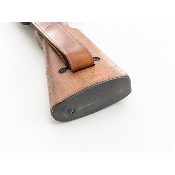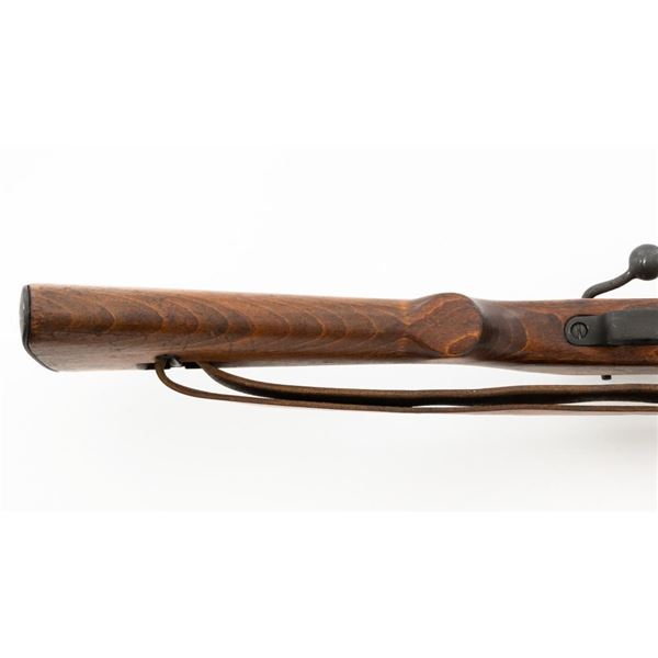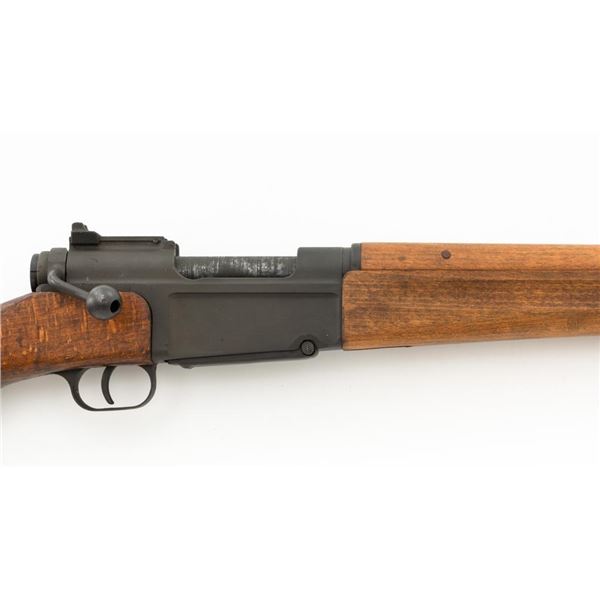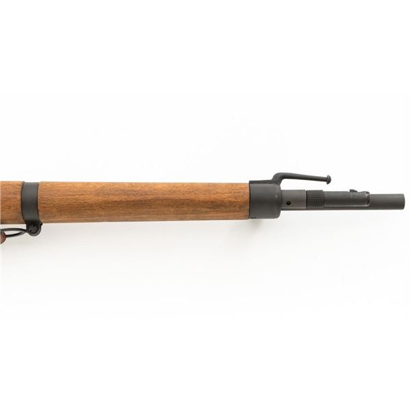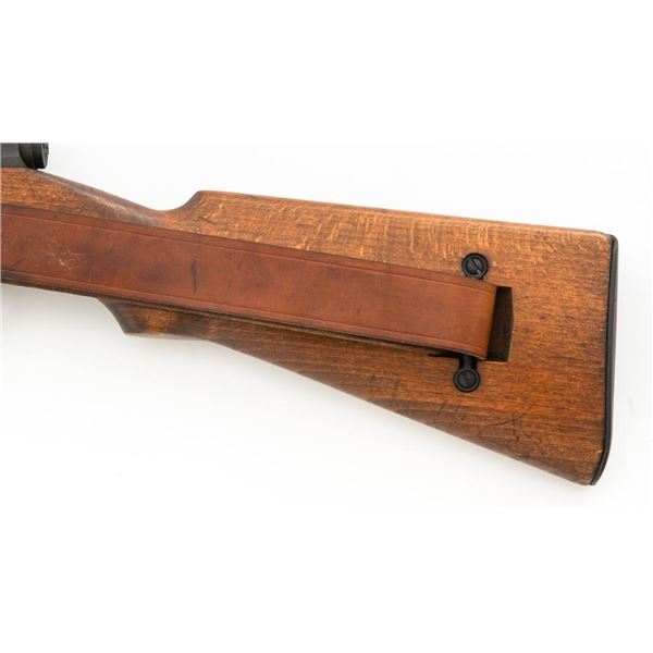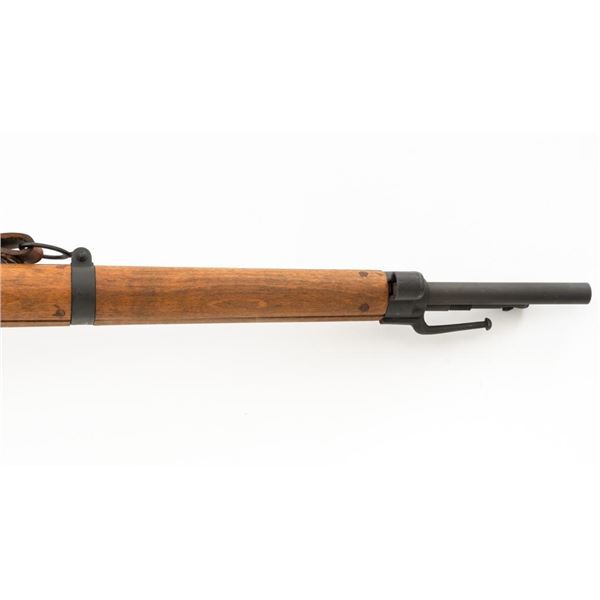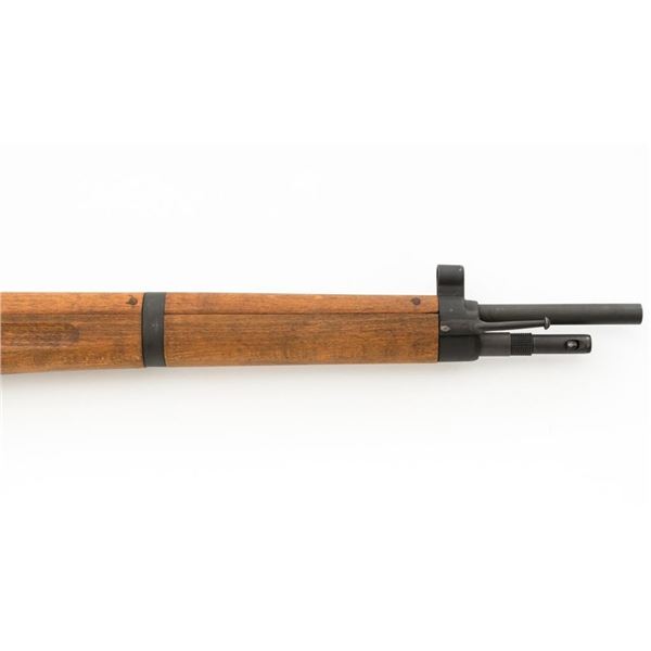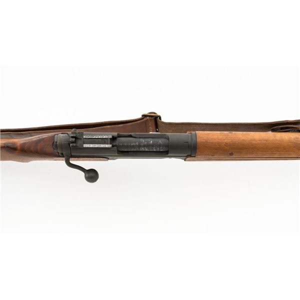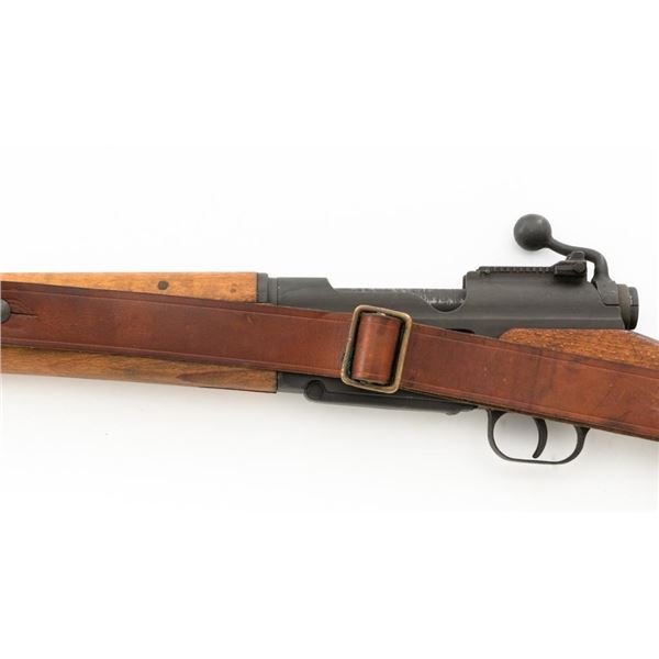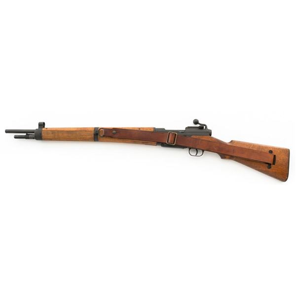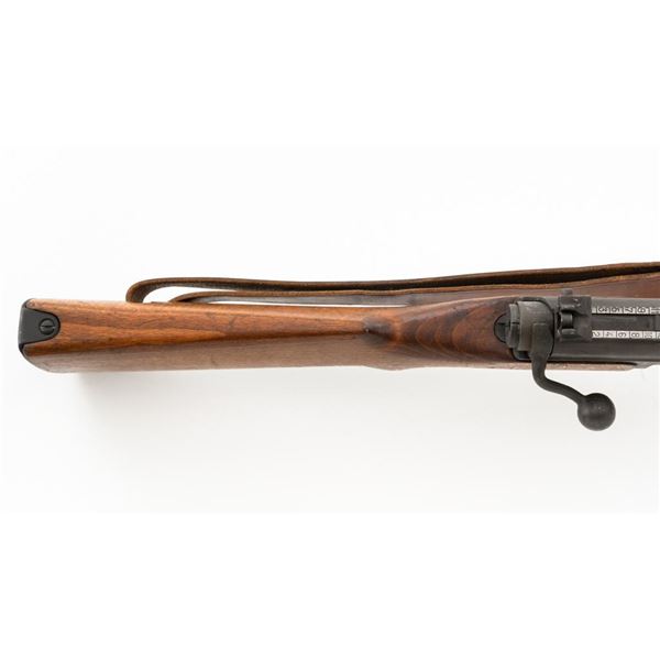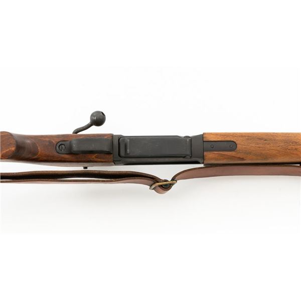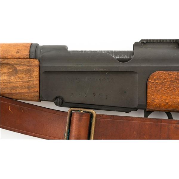 French MAS 36 Bolt Action Rifle with Bayonet, #99702, 7.5x54mm cal., 23" barrel, parkerized finish, hardwood stock and handguard, hooded blade front sight, and adjustable aperture rear sight, graduated to 1200 meters. Includes the original bayonet, in fine condition, it operates and locks into place smoothly. Also included is a brown leather French sling, in very good used condition. Rifle is marked "MAS MLE 1936"on left side of the receiver. Matching numbered bolt. Import marked on left side of the receiver. Condition overall is near excellent as arsenal refinished, retaining approx. 95%-96% parkerized finish, showing light wear to the bolt body and front barrel band. Bolt will close on an empty chamber. Forend and handguard are excellent. Buttstock is very good+, with scattered light dents and scratches, particularly along the toe. Action operates smoothly. Bore is bright with excellent, well-defined rifling. Est:$500-$800. (C&R)