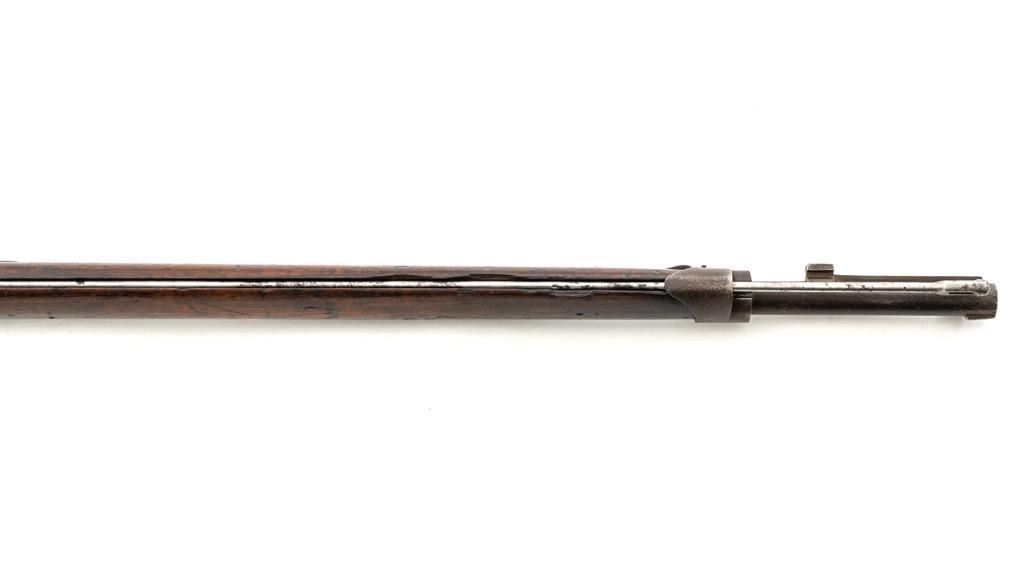 French Model 1866 Chassepot Bolt Action Rifle with Magazine, #J23988, 11x59Rmm cal., 32.25" barrel, blued finish, hardwood stock, inverted-"V" front sight, rear sight has been removed and the surface has been filled with an unknown material. Includes a steel cleaning rod. A fixed steel magazine has been fitted to bottom of the receiver. Rifle is marked "MANUFACTURE IMPERIALE/St Etienne" and "MLE 1866" on left side of the receiver and "S 1869"on right side of the barrel shank. Numbers do not match. Condition overall is fair with the metal toned to brown. Bolt assembly has been cleaned and shows general fine pitting. Stock is cracked at the wrist, behind the receiver tang. Wood is otherwise good with scattered dents, scratches, and some darkening to the finish. Action functions but is a little stiff. Bore rates fair with rust at the muzzle. An interesting rifle worth further research. Est.: $400-$600. (Antique)
