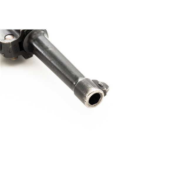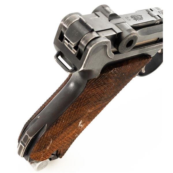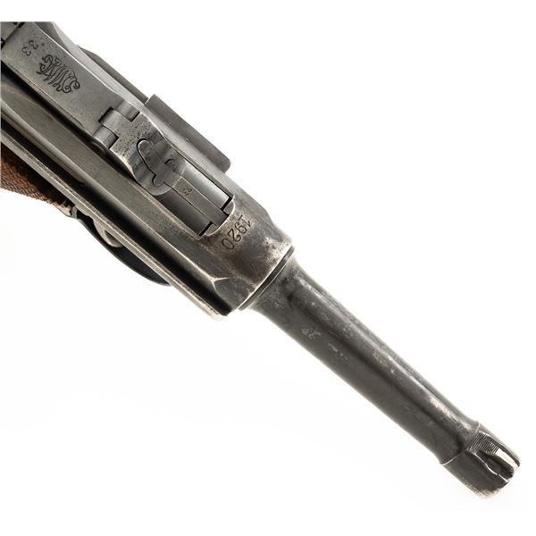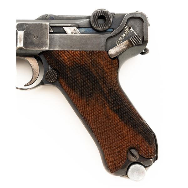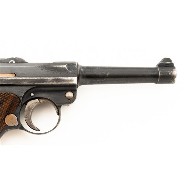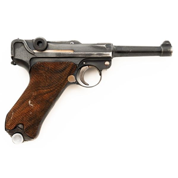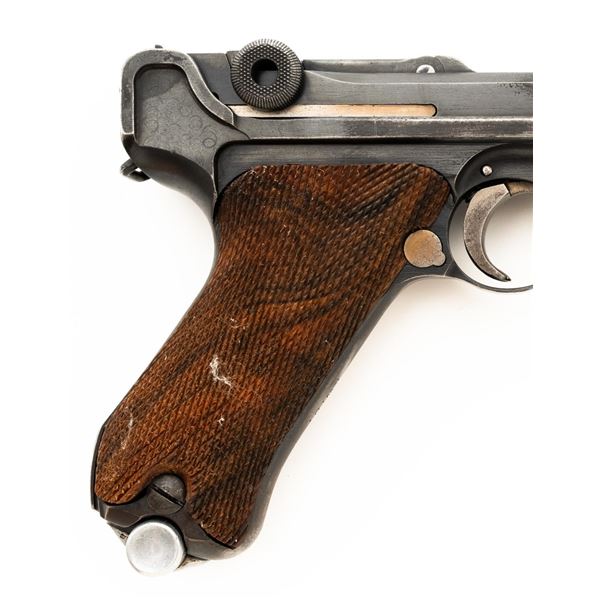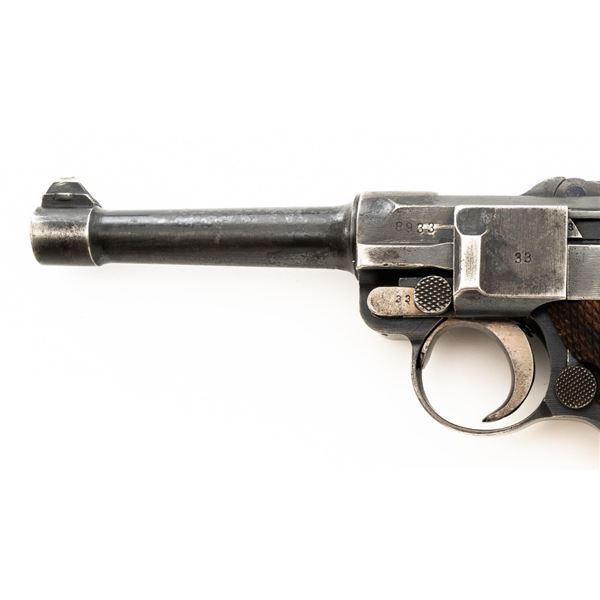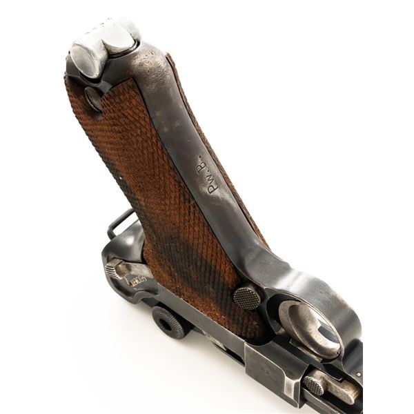 DWM 1920 Bavarian Police Marked Luger Semi-Automatic Pistol, #8933a, 9mm cal., 4" barrel, blue finish, straw colored small parts, checkered replacement wood grips, modified inverted-"V" front sight, fixed rear sight with small "V"-notched groove, with stock lug. Includes one mis-matched blued magazine with aluminum base, marked "2865o / + / (eagle)63". Pistol is marked "DWM" on toggle link with "1920" date on top of chamber. Right side of receiver with three "eagle" proofs, as well as another partially visible on the barrel. Front grip strap with "Pw.B." Bavarian Police markings. All visible numbers matching, except for the magazine and grips. No import marks. Condition is good, retaining approx. 80% blue, showing general thinning and toning, particularly on the barrel and front grip strap. Barrel and sideplate with a mottled appearance and scattered areas of light pitting. Factory lettering is clear. Proof marks show wear and are partially legible. Small parts retain approx. 30% thinning straw colors. Grips are excellent with sharp checkering detail. Top edge of the front sight has been reshaped, now with a thin profile. Action and hold open function properly. Bore is primarily bright with only trace amounts of visible frosting and very good rifling. Magazine shows signs of moderate age and finish wear. Est.: $800-$1,200. (C&R/PPT)