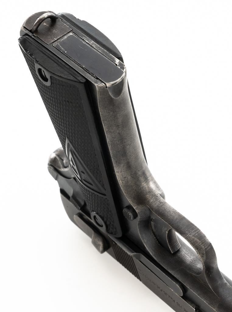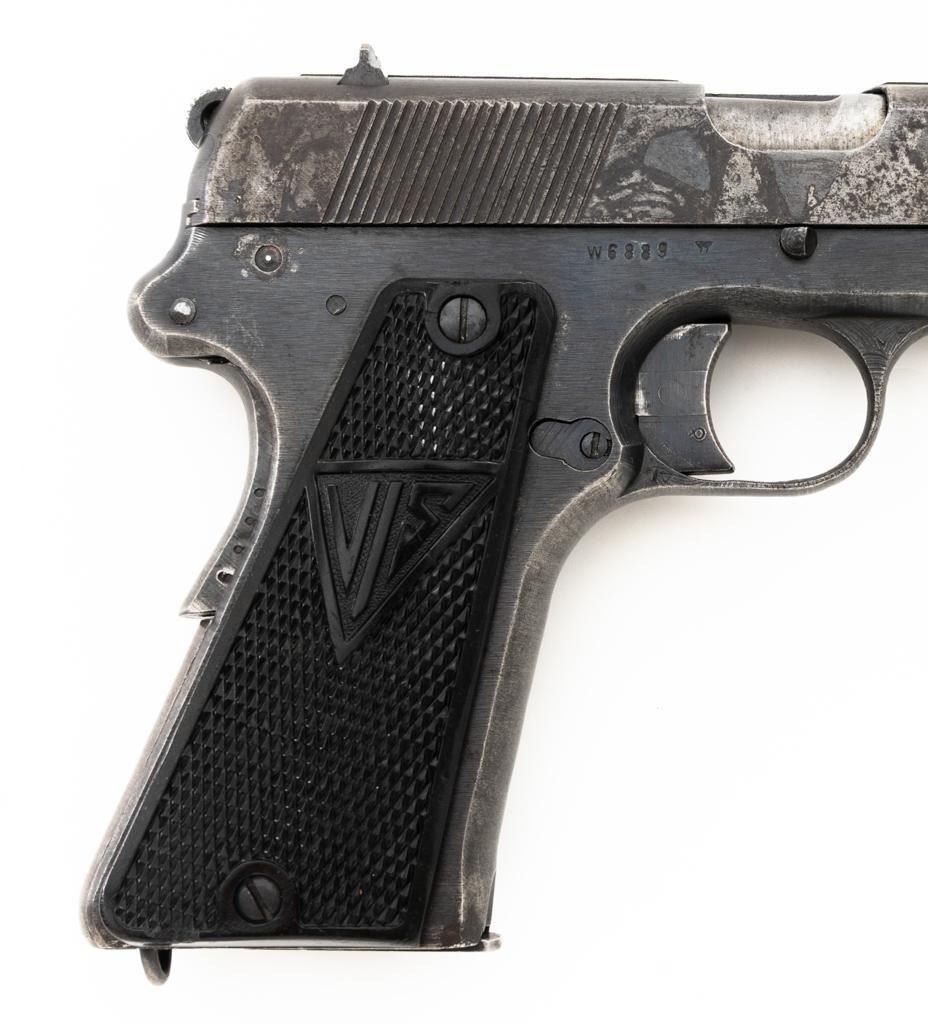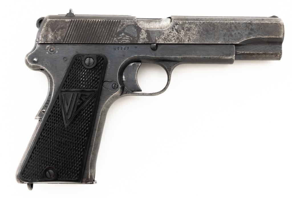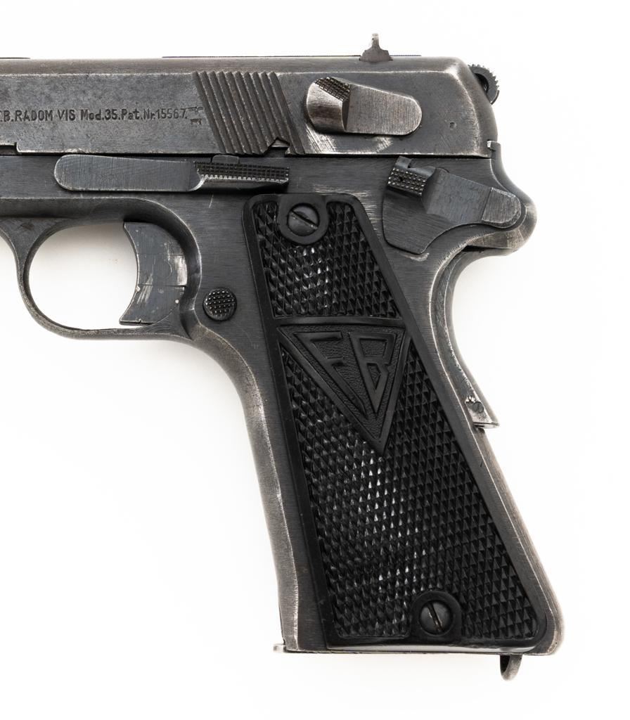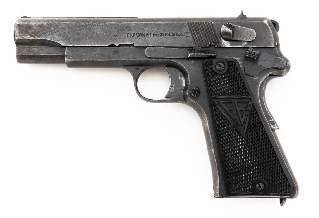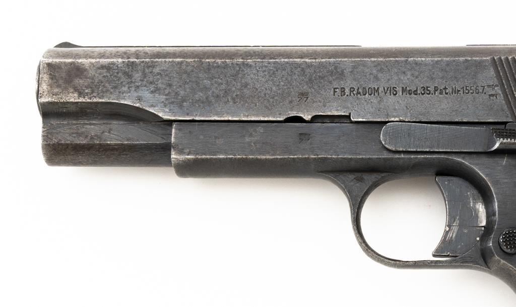 German Occupation P35 Radom VIS Semi-Automatic Pistol, #W6889, 9mm cal., 4.6" barrel, blued finish, checkered black plastic grips embossed with "FB" and "VIS", blade front sight, and fixed rear sight with "V"-notched groove. Includes one unmarked blued steel magazine. Pistol is Type 3 with two levers and no stock slot. Left side of the slide is marked "(eagle)77/F.B.RADOM VIS Mod.35.Pat.Nr.15567". and has a Nazi eagle firing proof and "(eagle)625". There are "(eagle)77" proofs on both sides of the frame. No visible import marks. Condition overall is good, retaining approx. 50% mottled blue finish, with areas of mild pitting on the slide. Grips are good, with handling marks and a few minor chips to the bottom on both sides. Action operates smoothly. Bore rates good with clearly defined rifling. Est.: $800-$1,100. (C&R/PPT)